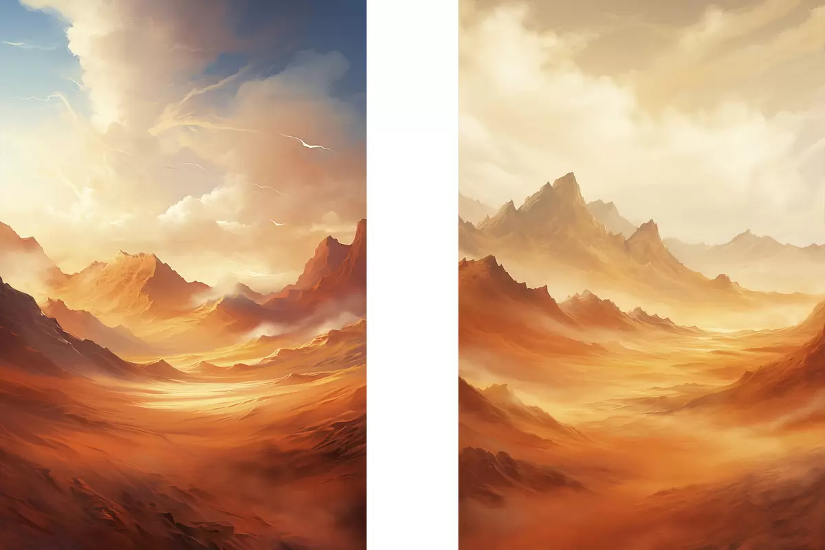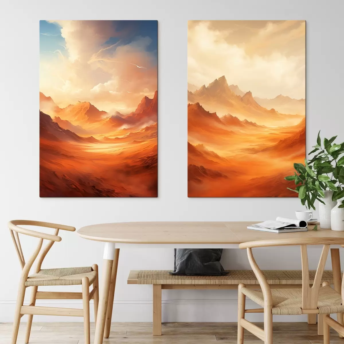 murales Un vasto paisaje desértico de color naranja con imponentes montañas rocosas bajo un cielo brumoso y soleado con nubes tenues m01122