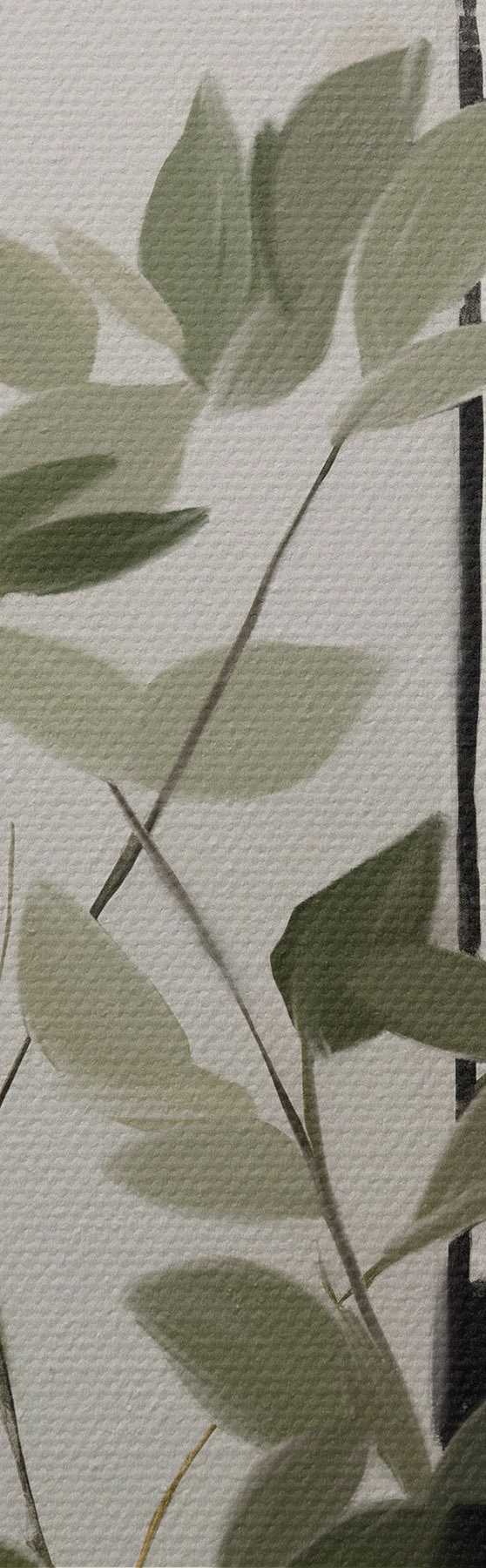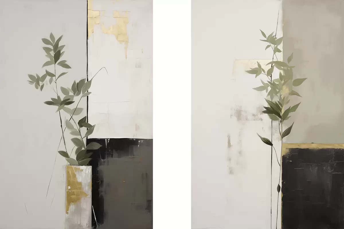 murales Una pintura minimalista con textura de un jarrón con hojas verdes sobre un fondo de formas geométricas abstractas m01126