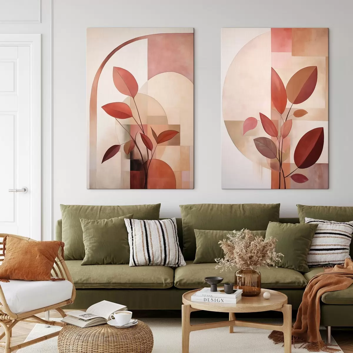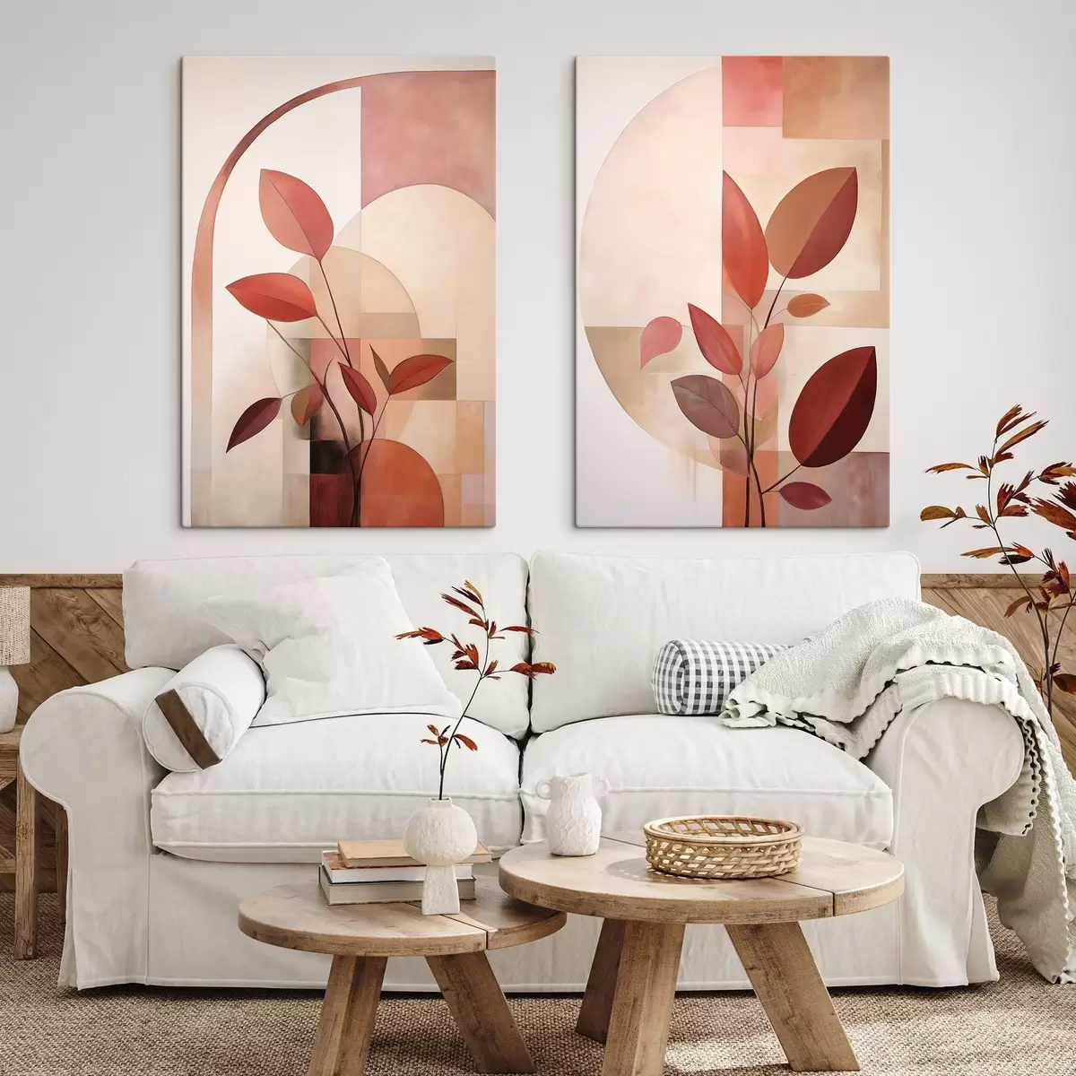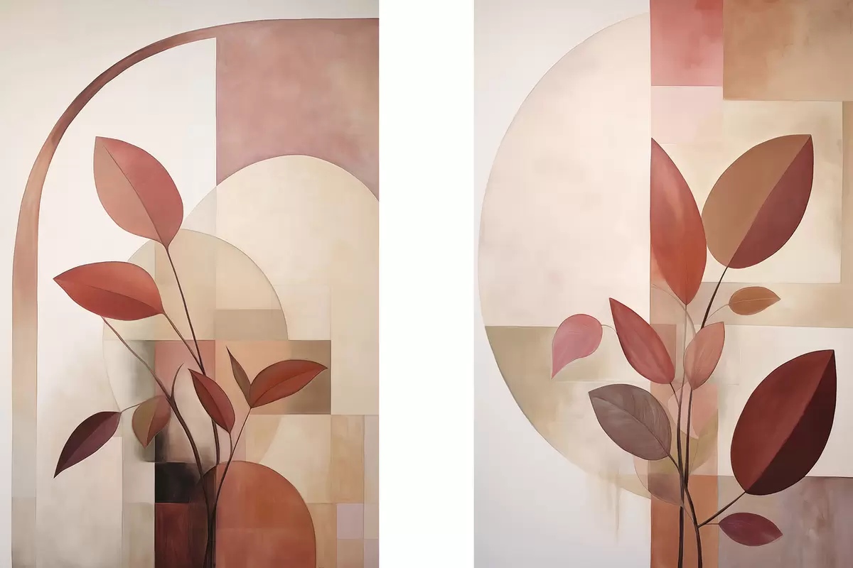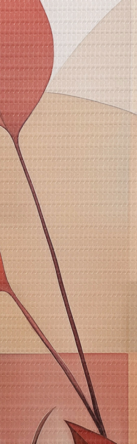 murales Planta abstracta con hojas rojas sobre un fondo de formas geométricas y colores suaves y apagados m01128