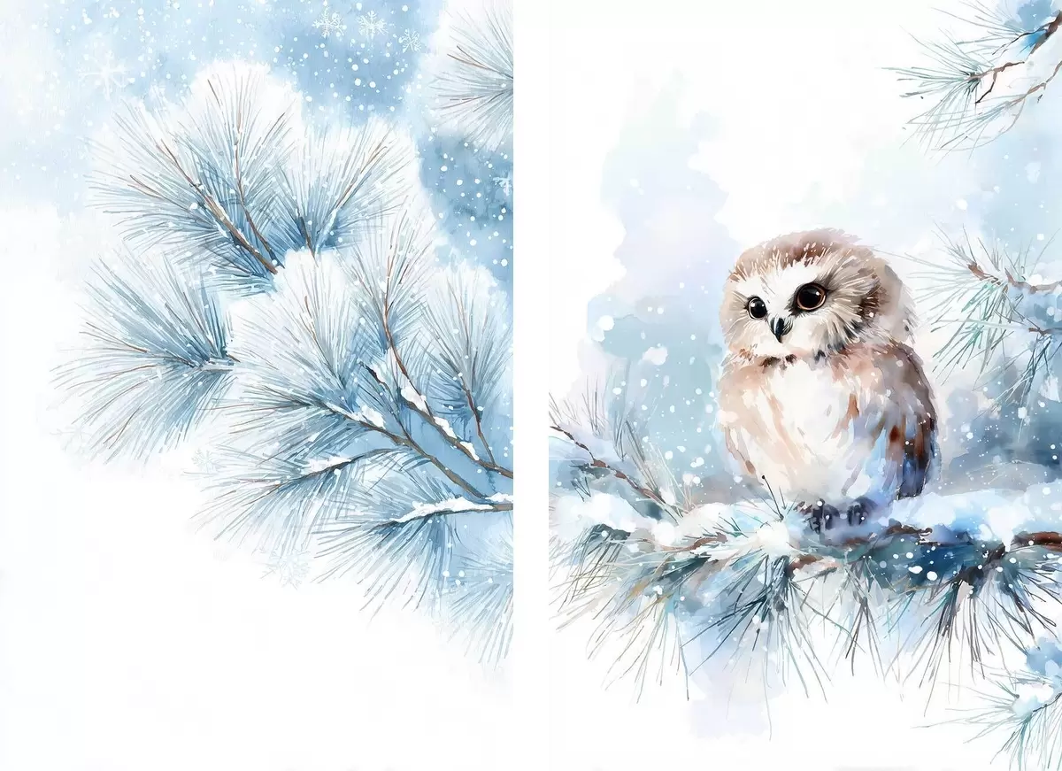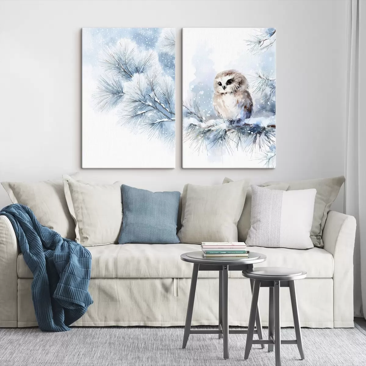 murales Bonito búho sobre una rama de pino cubierta de nieve, pintado al estilo acuarela. m01168