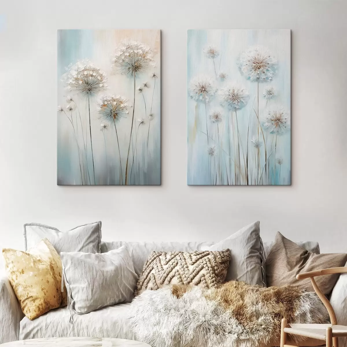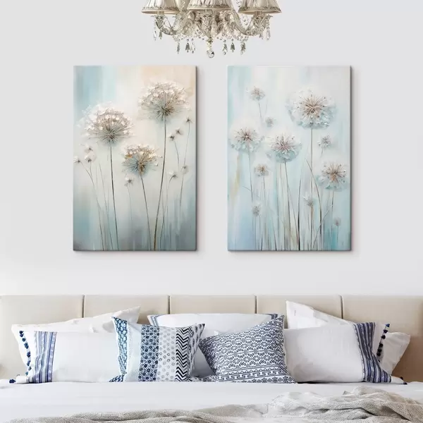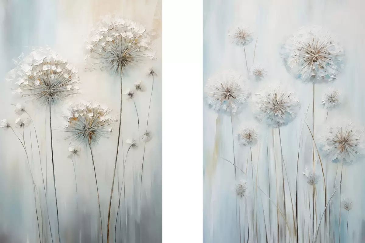 murales Estilo pictórico texturizado de dientes de león sobre un fondo azul y blanco suave. m30048