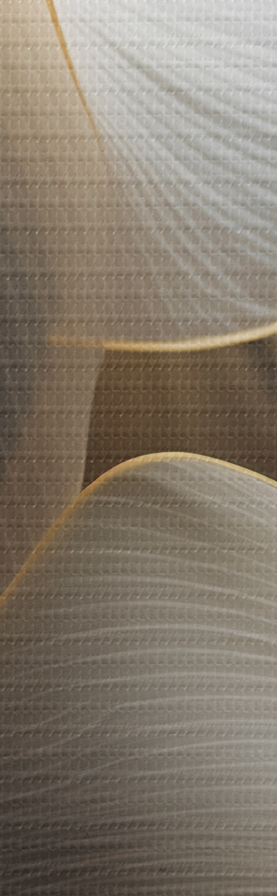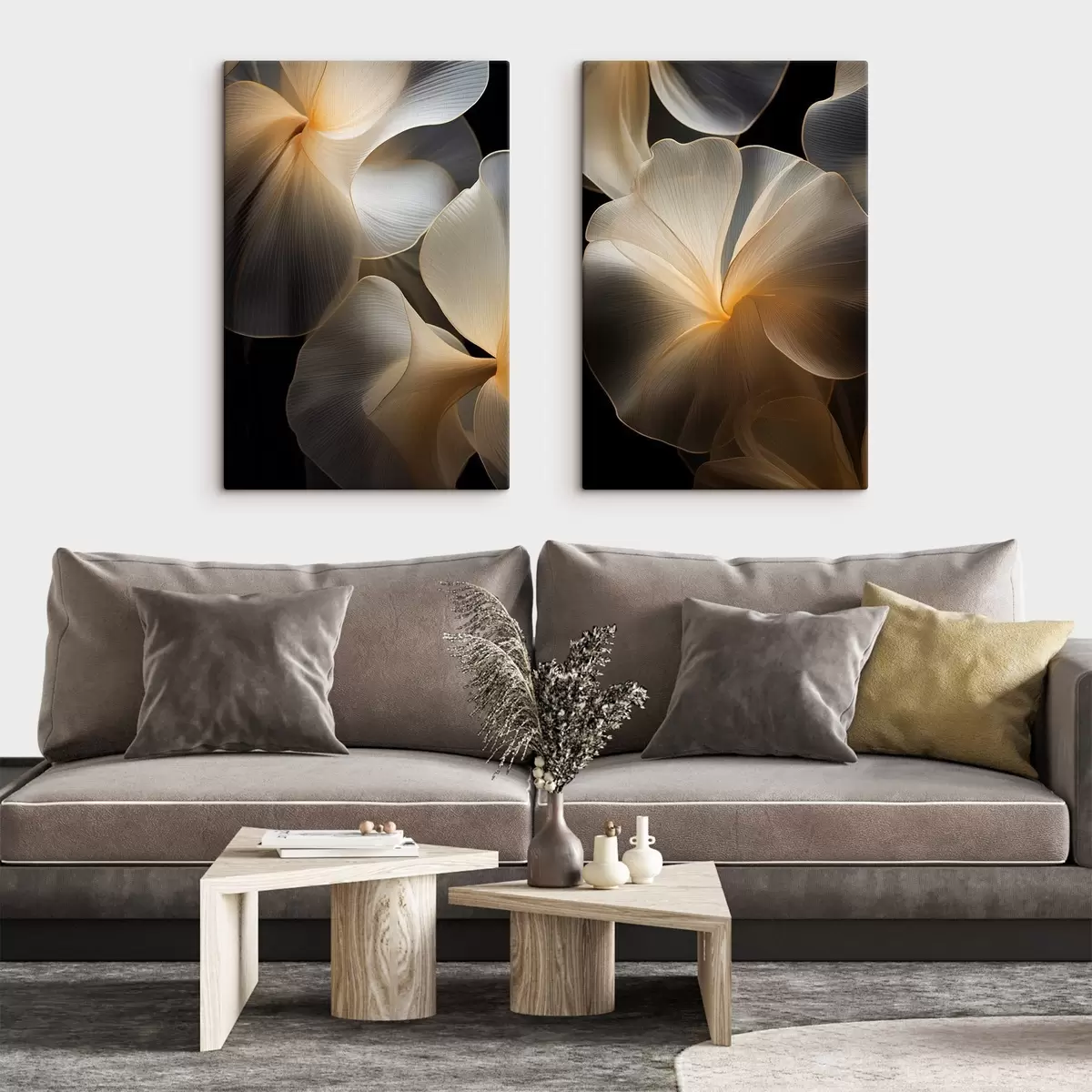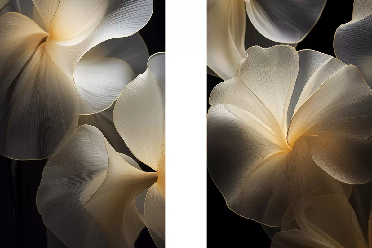murales Pétalos abstractos fluidos y translúcidos con líneas delicadas, sobre un fondo oscuro. m30050