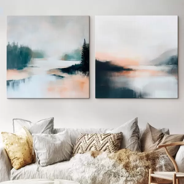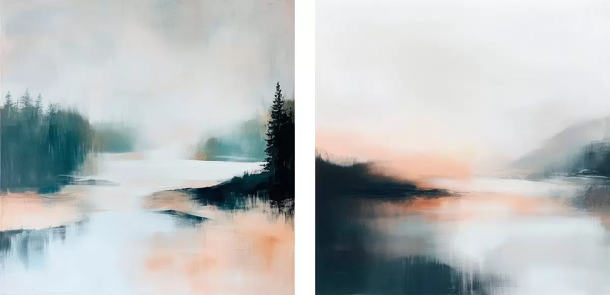 murales Paisaje brumoso con coníferas y un lago, pintado en un estilo contemporáneo m30357