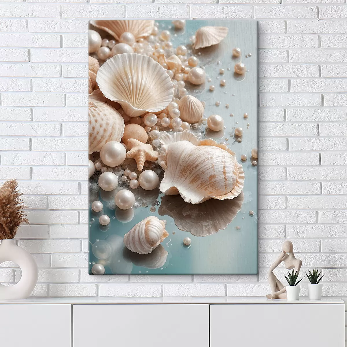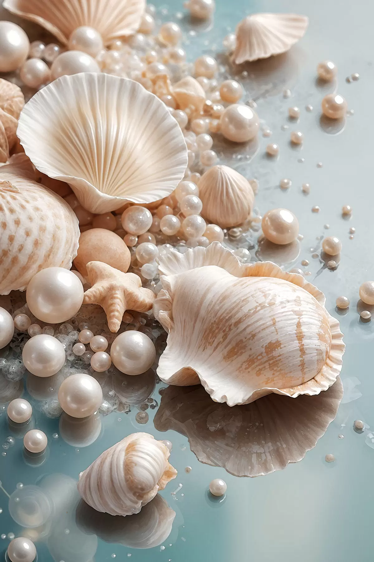 murales Surtido de conchas y perlas sobre un fondo azul claro s38769