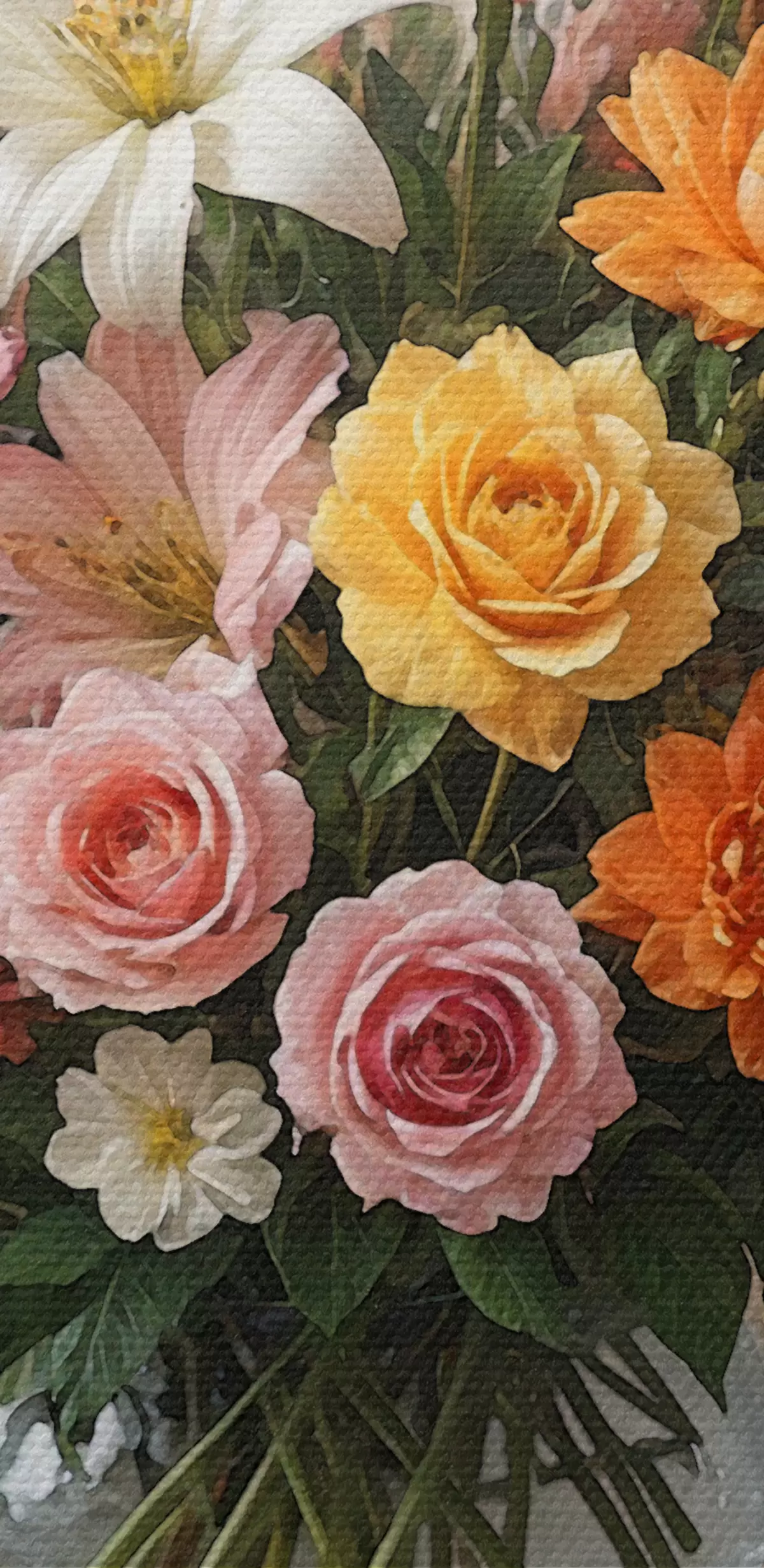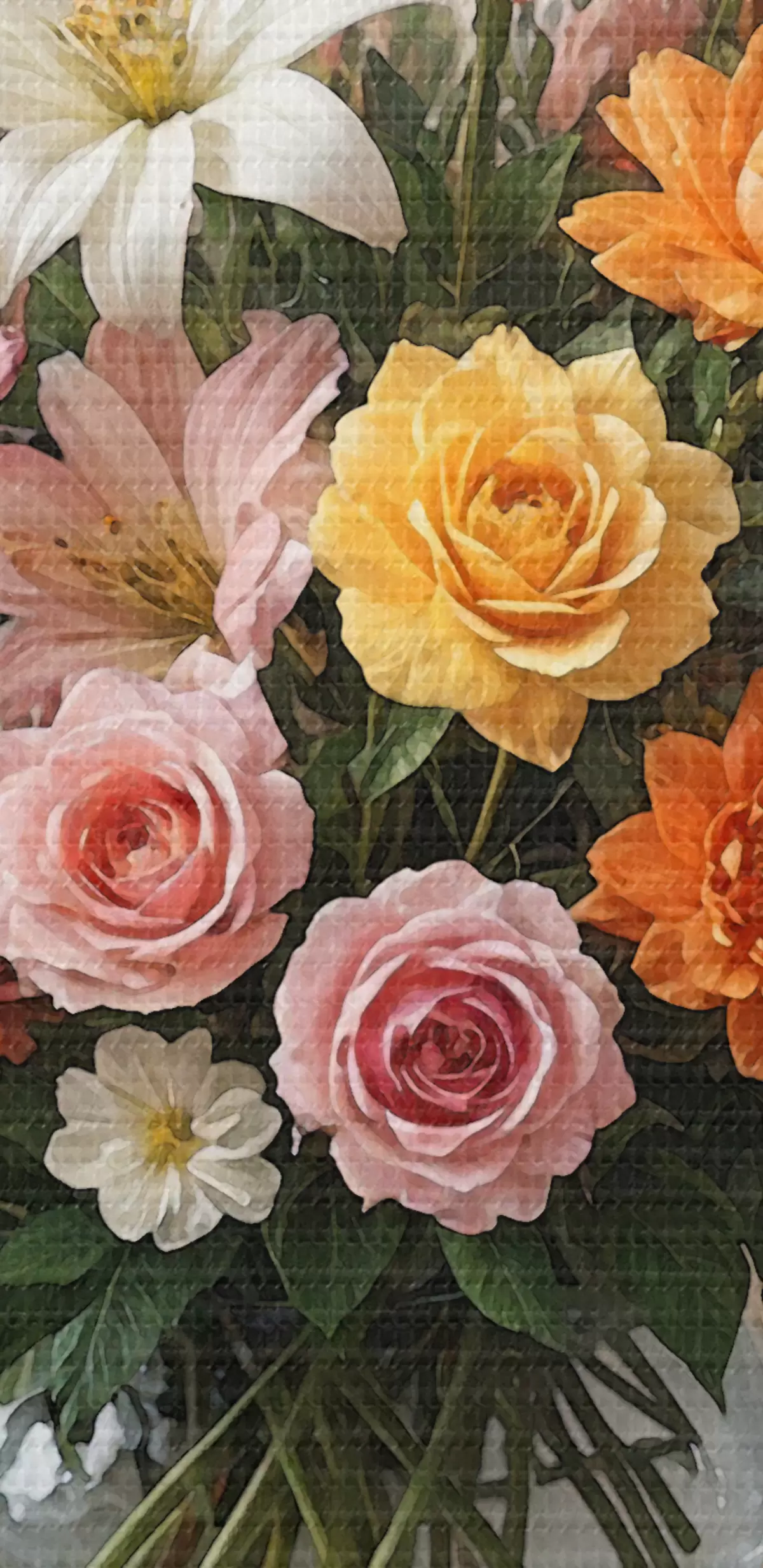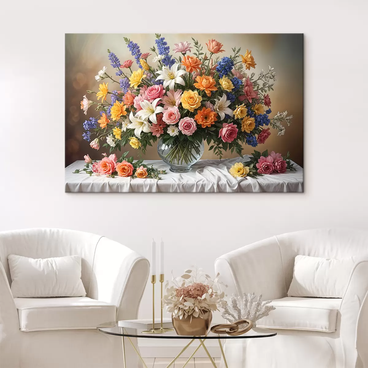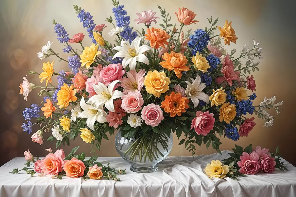 murales Un vibrante ramo de varias flores de colores en un jarrón de vidrio sobre un mantel blanco, pintura artística vintage s38825