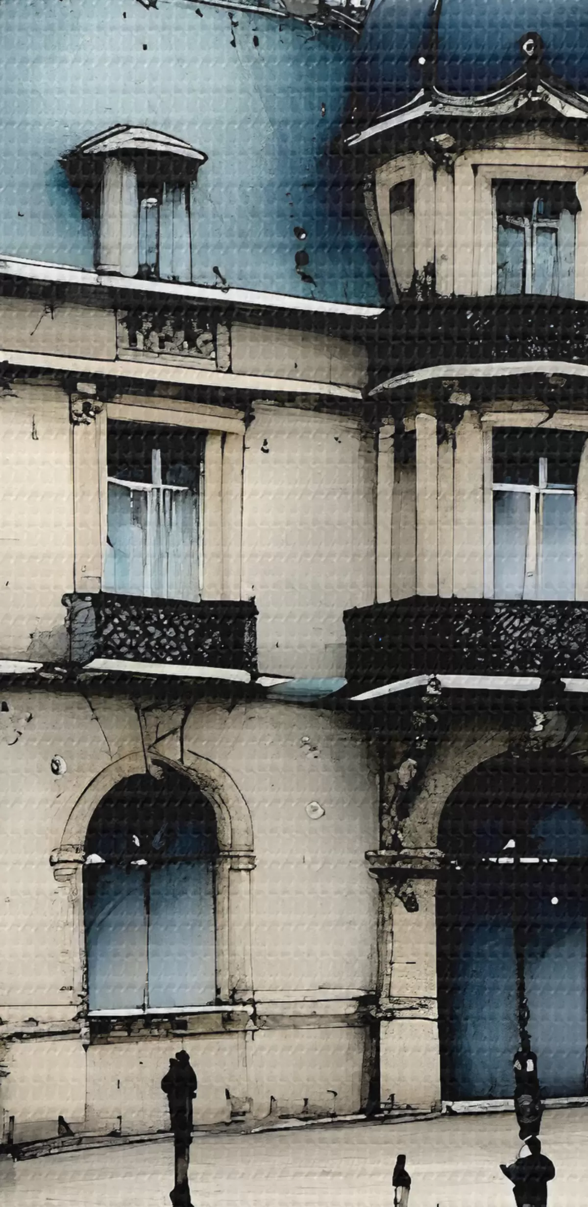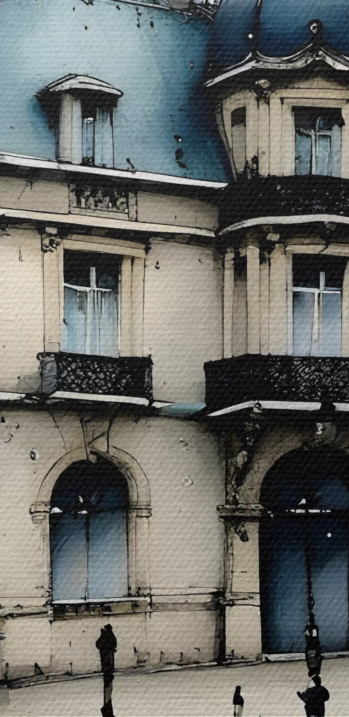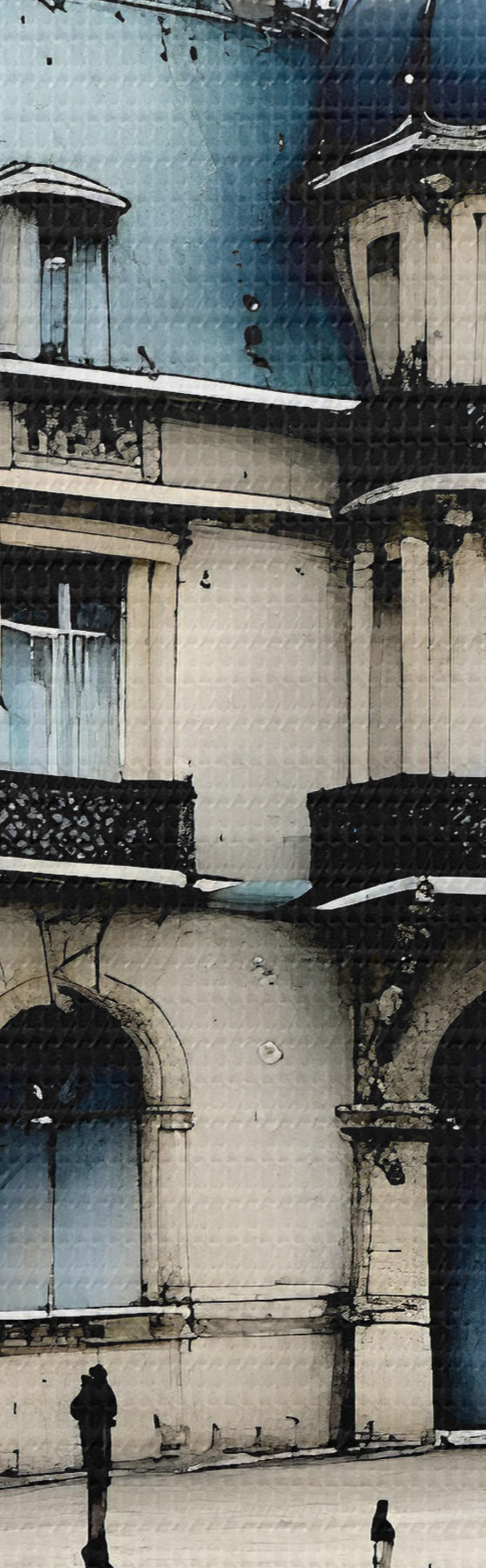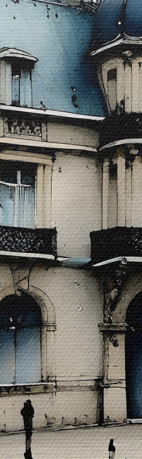 murales Un gran edificio con acuarela rodeado de farolas y árboles, en un día lluvioso s39391