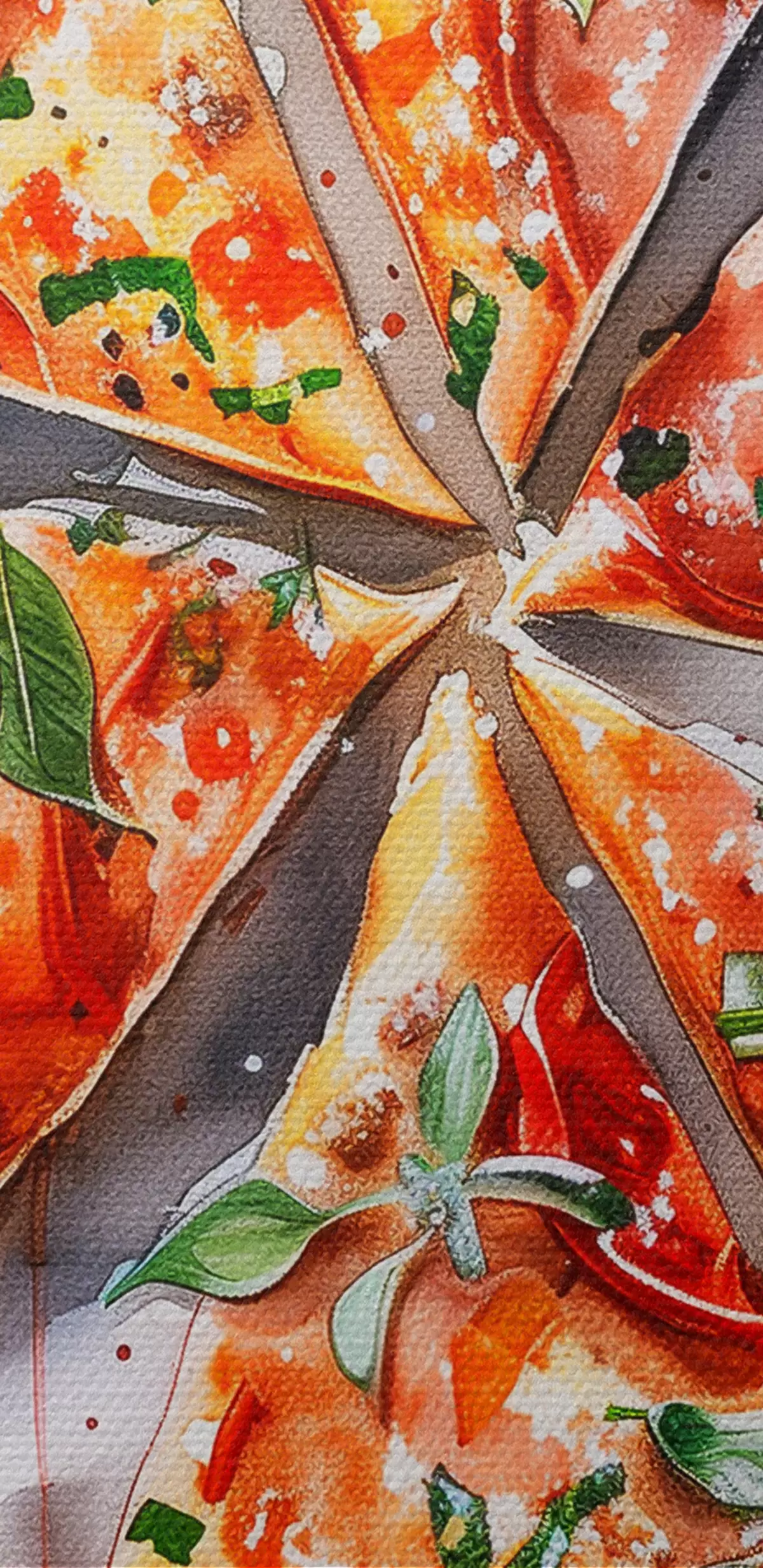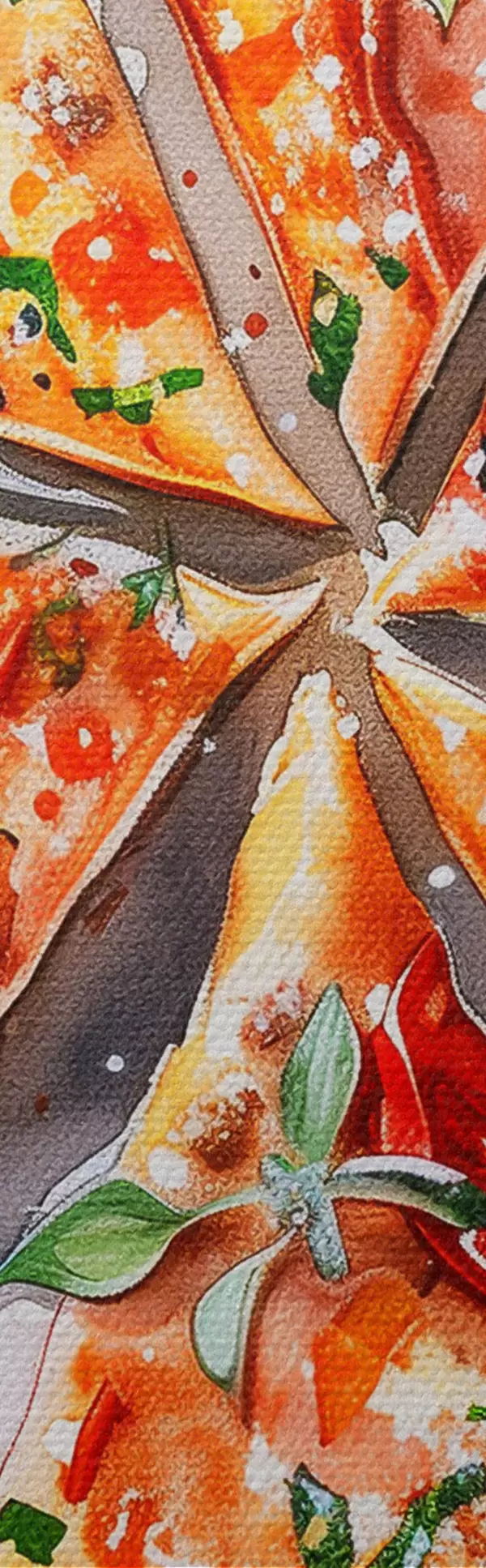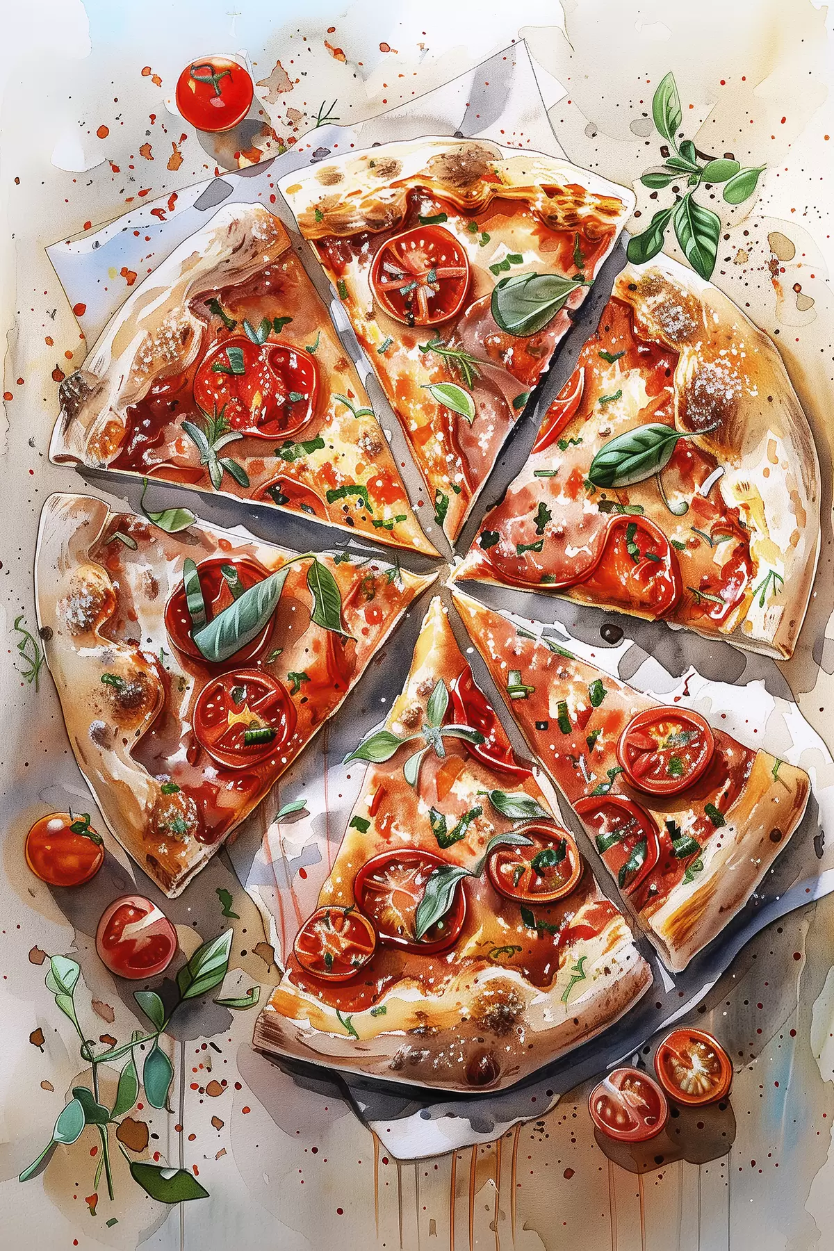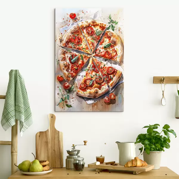 murales Pizza acuarela, deliciosa, tomates y queso, arte alimentario, mesa de madera s39704