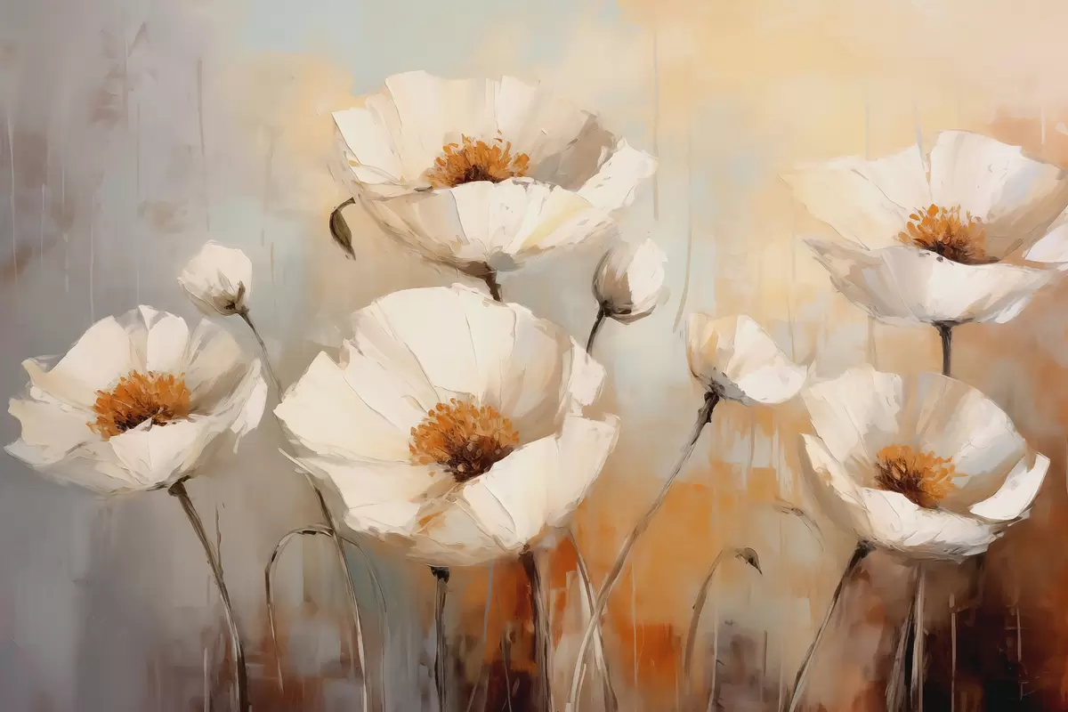 murales Cuadro al óleo de amapolas blancas, color azul y naranja s39815