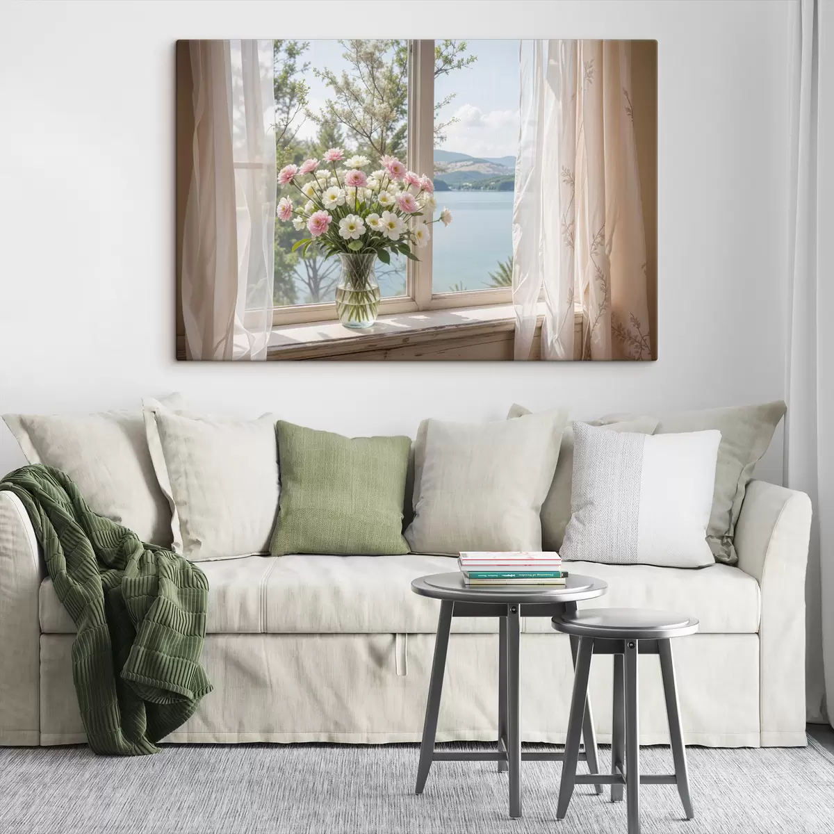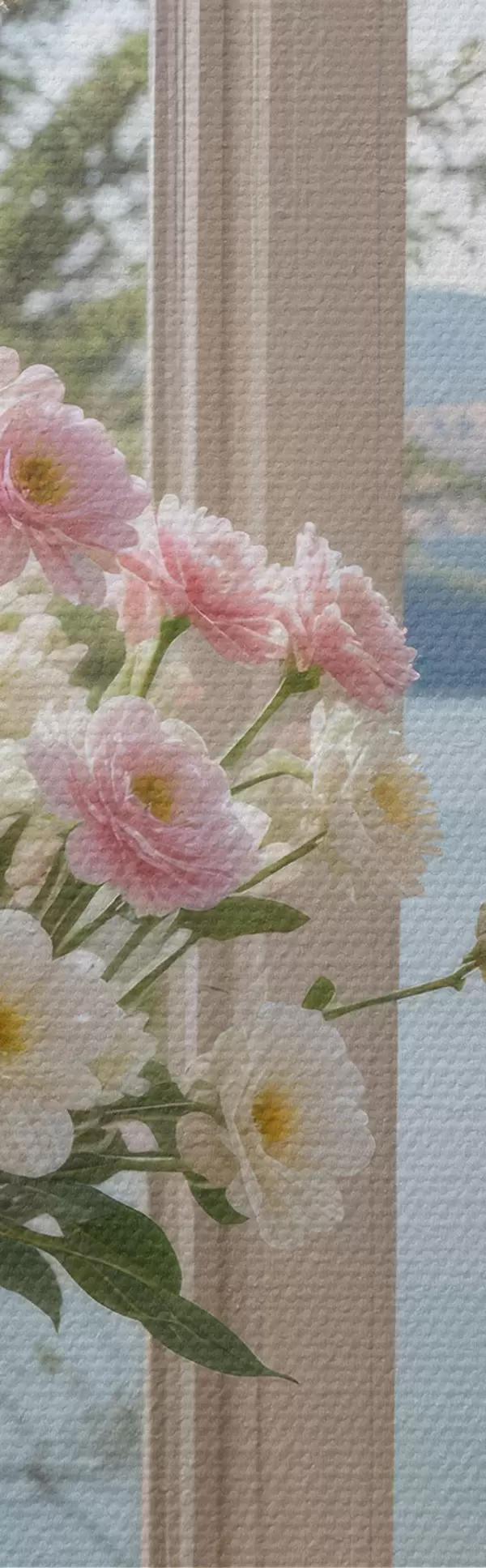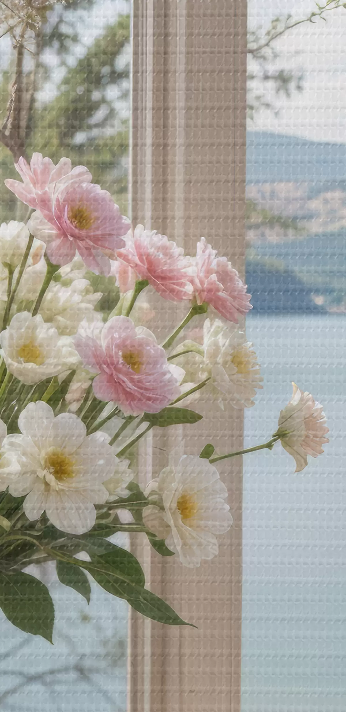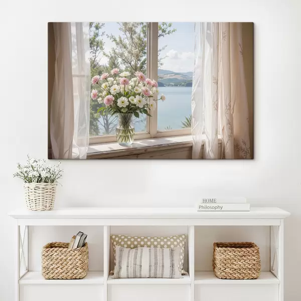 murales Un ramo de flores rosas y blancas en un jarrón de vidrio colocado en el alféizar de una ventana, con un pintoresco lago y montañas s40151