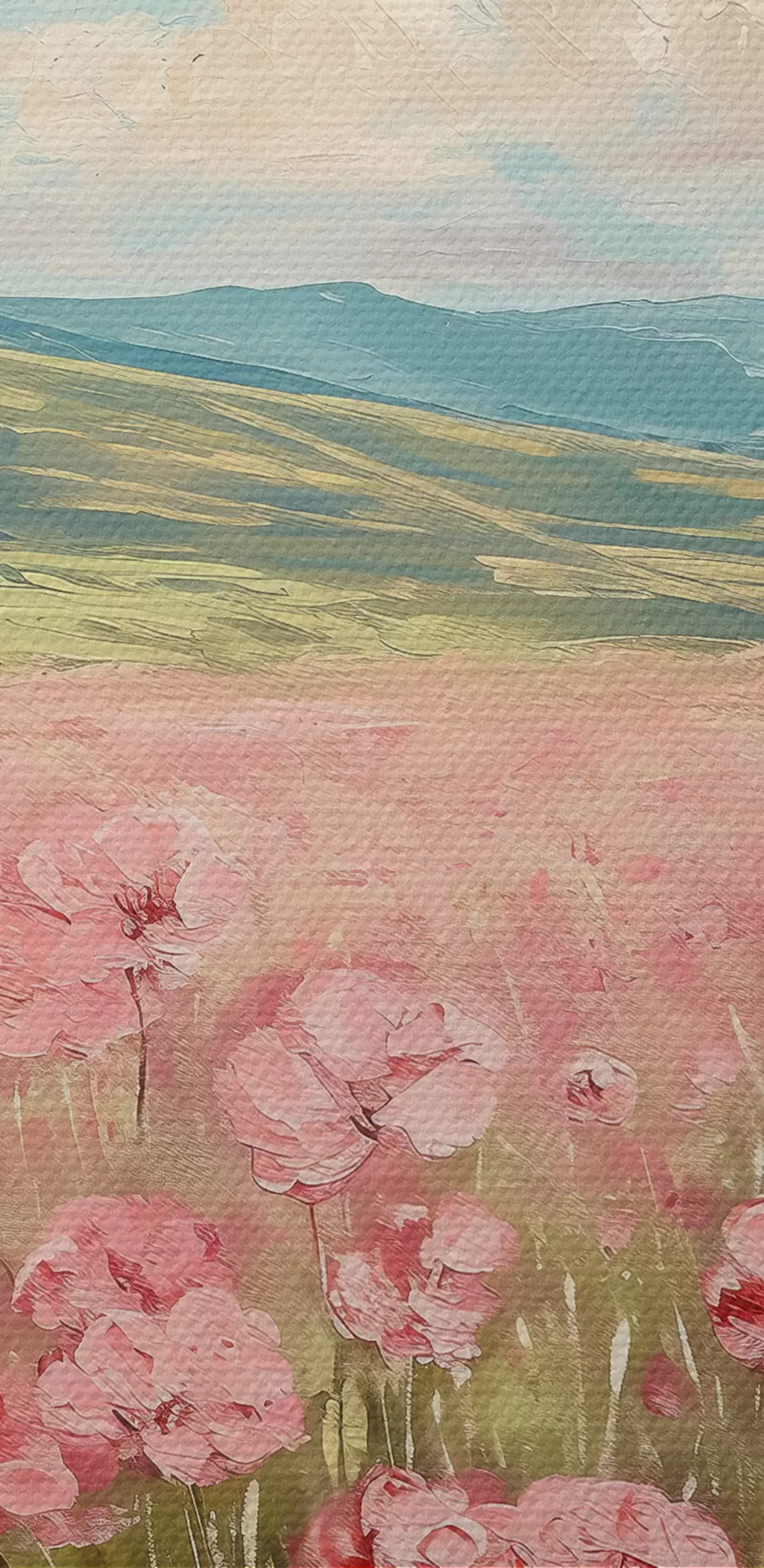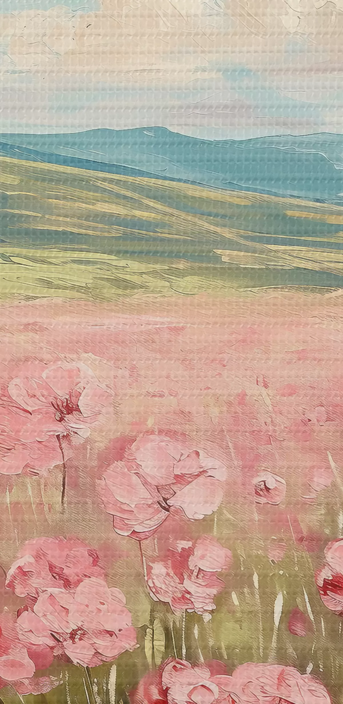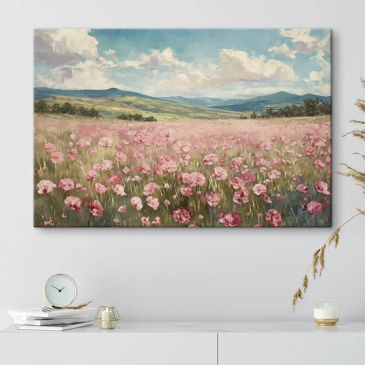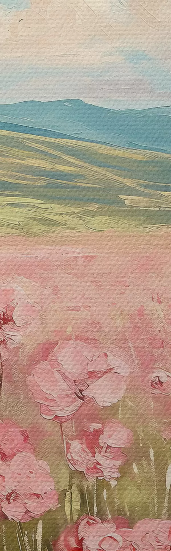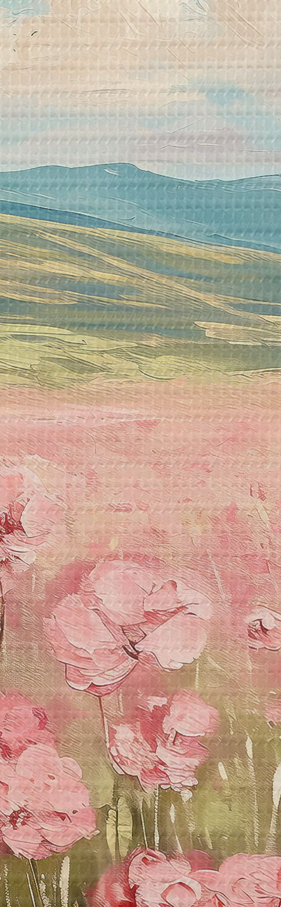 murales Prado con flores rosas, montañas, paisaje natural, cielo azul con nubes, acrílico s40232