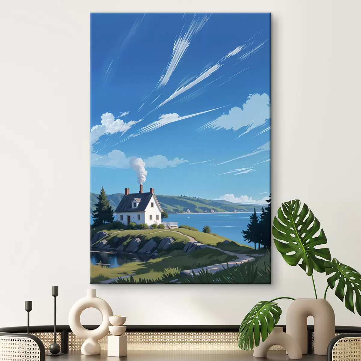 murales Una casa blanca en una colina cubierta de hierba con montañas al fondo y un cielo azul con nubes difusas s40587