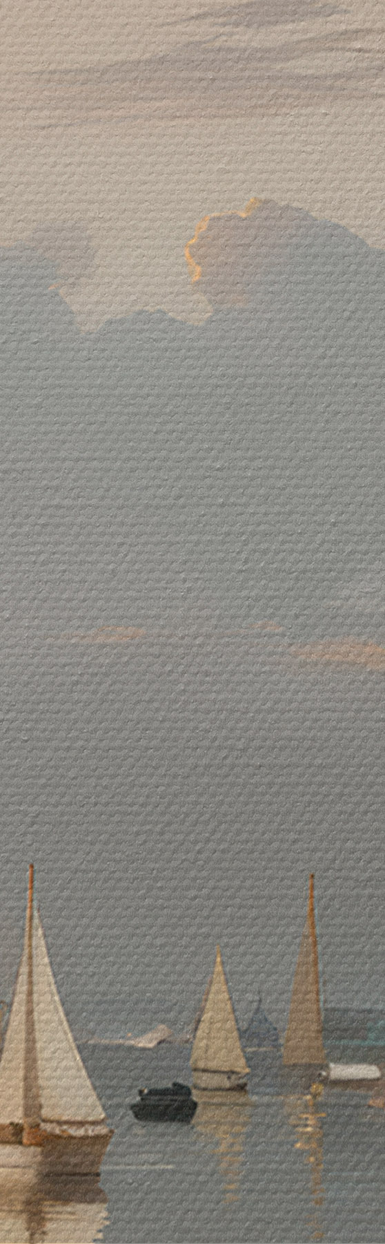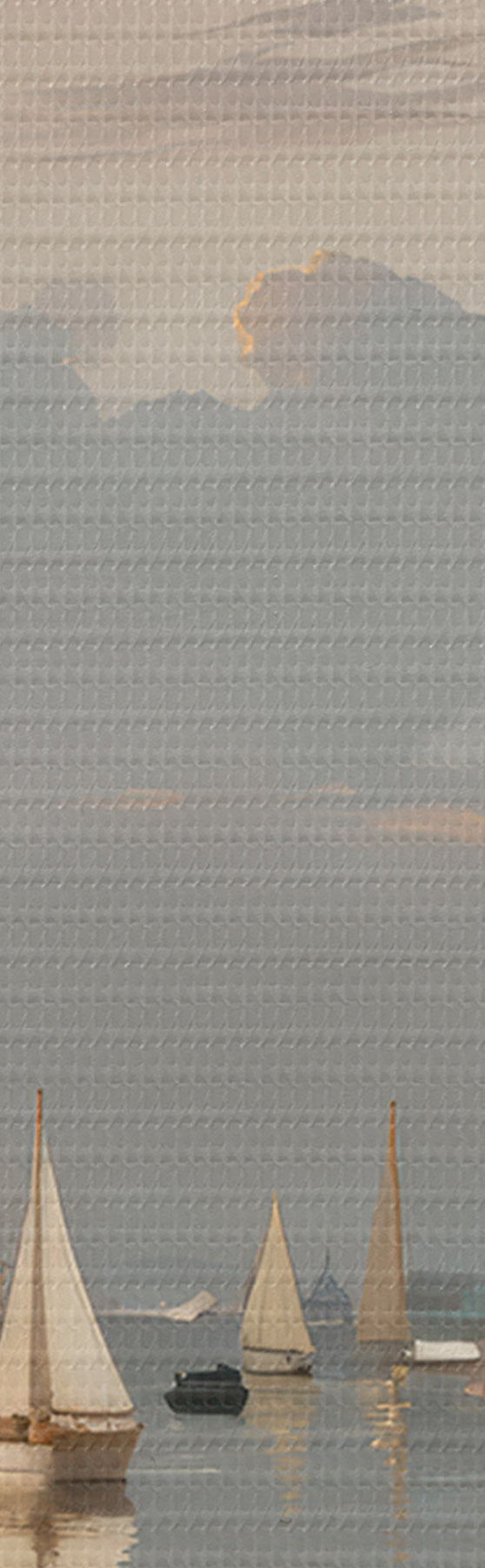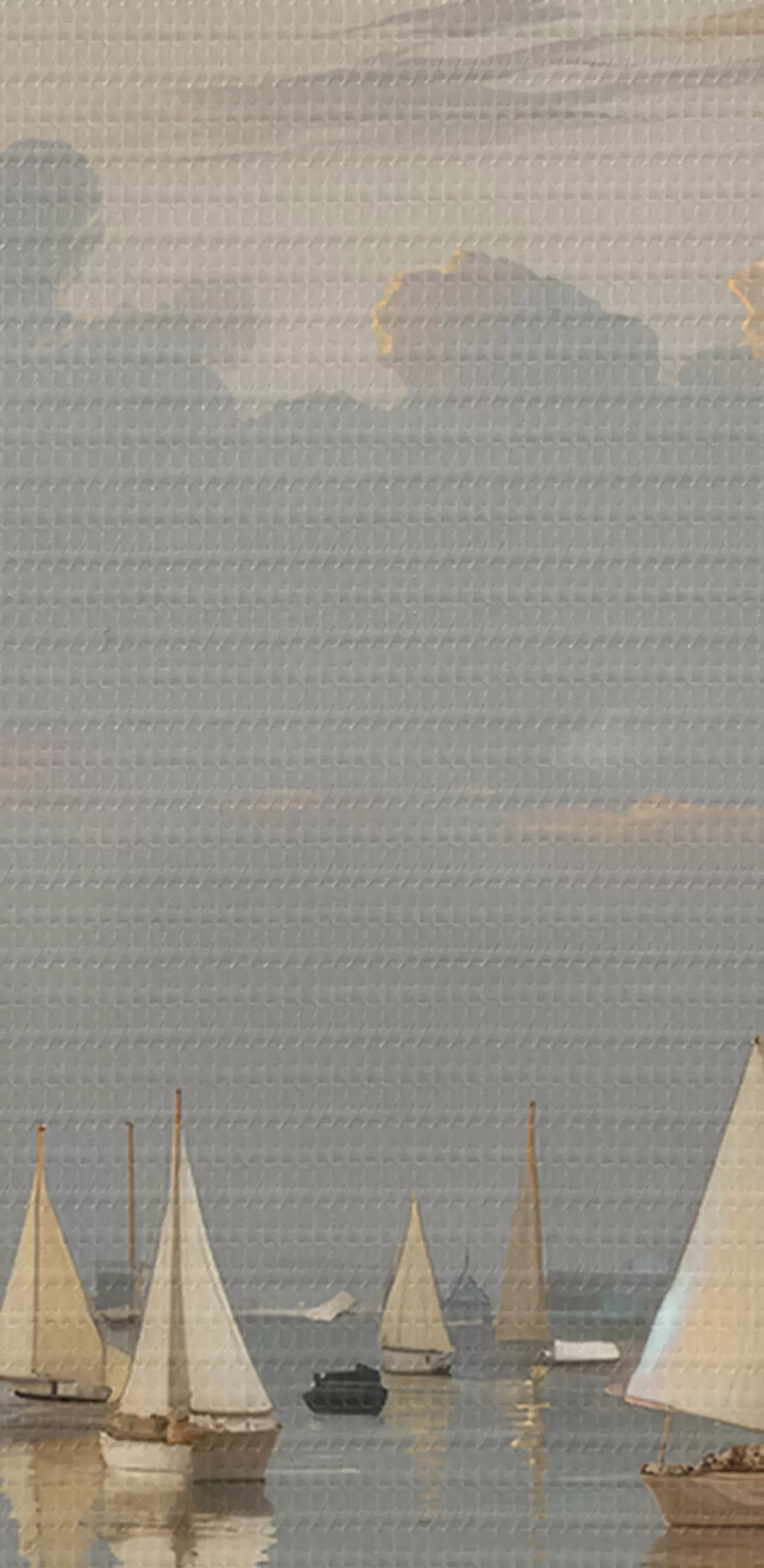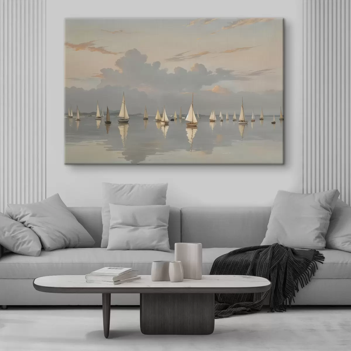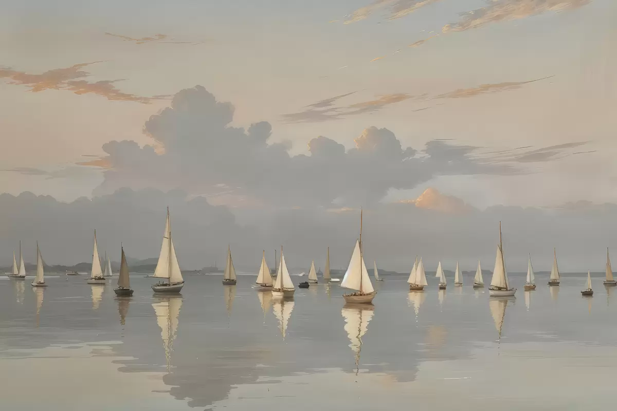 murales Una flota de veleros blancos en una masa de agua tranquila y reflectante al atardecer, con un cielo nublado de fondo s40615