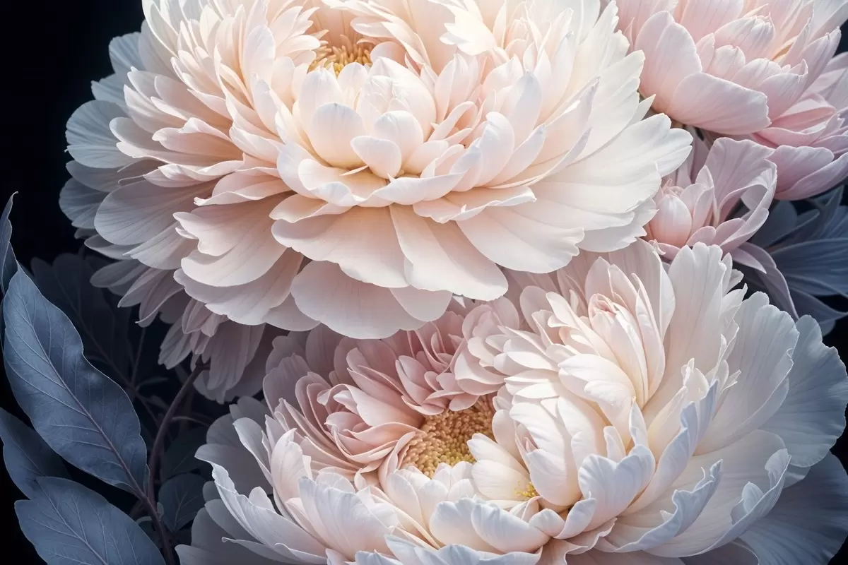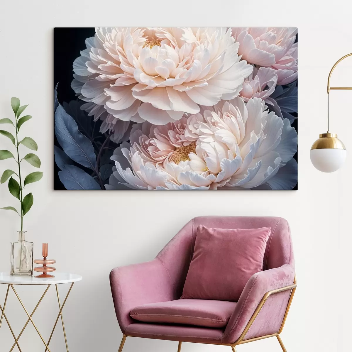 murales Delicadas peonías rosa pastel con suaves y esponjosos pétalos y hojas azules sobre un fondo oscuro s41092