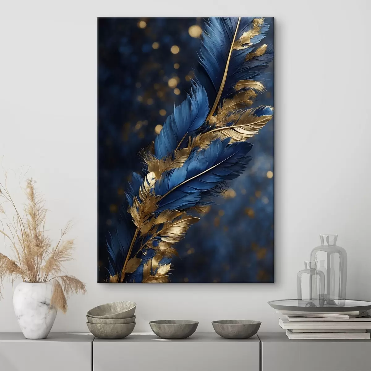 murales Plumas azul-amarillo sobre fondo borroso s41296