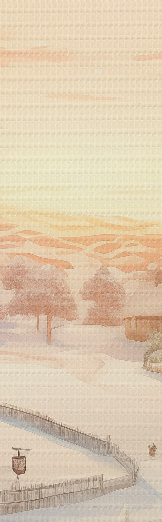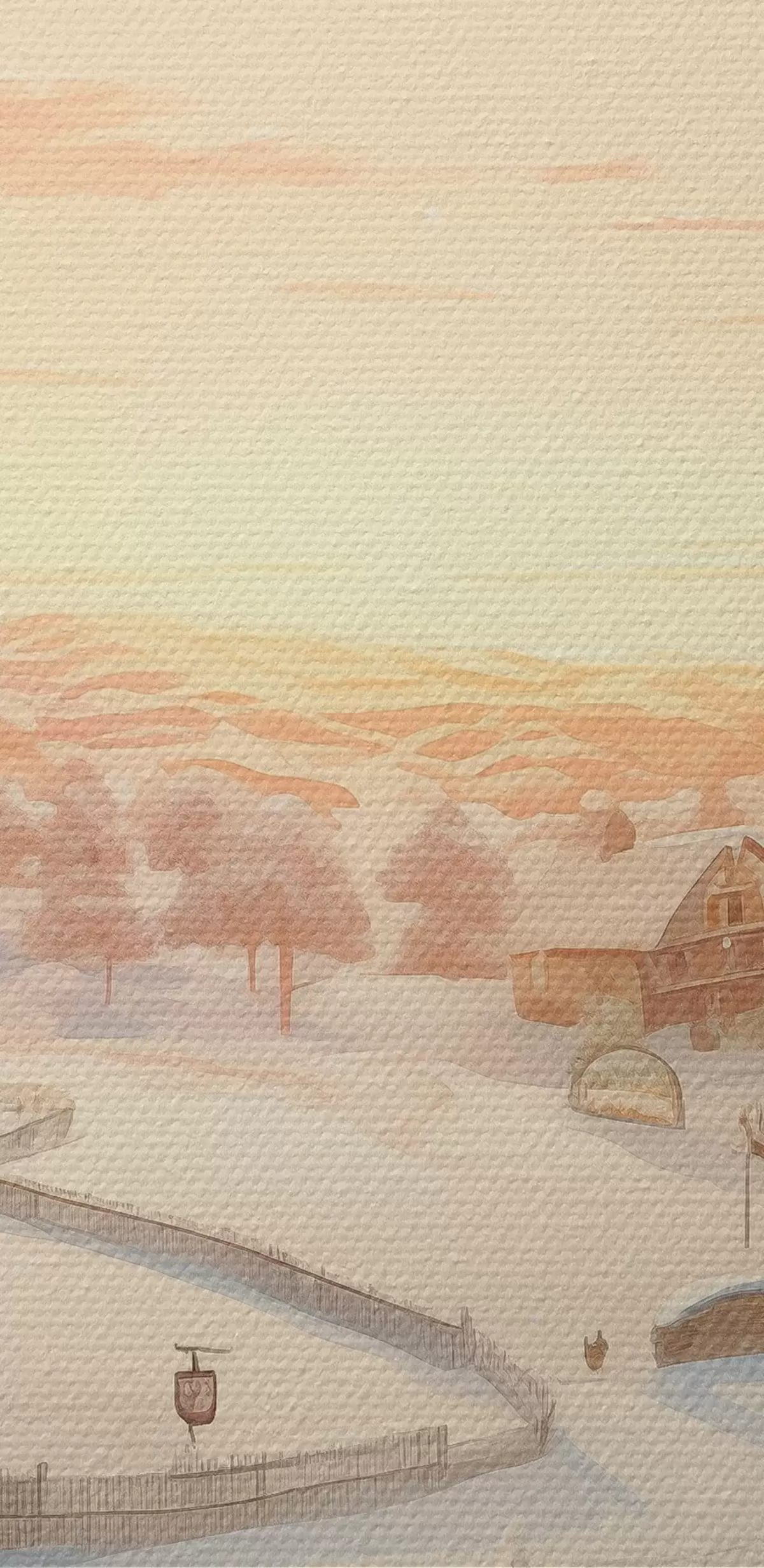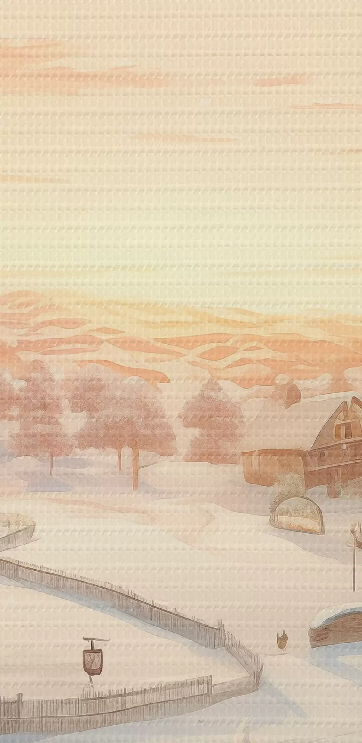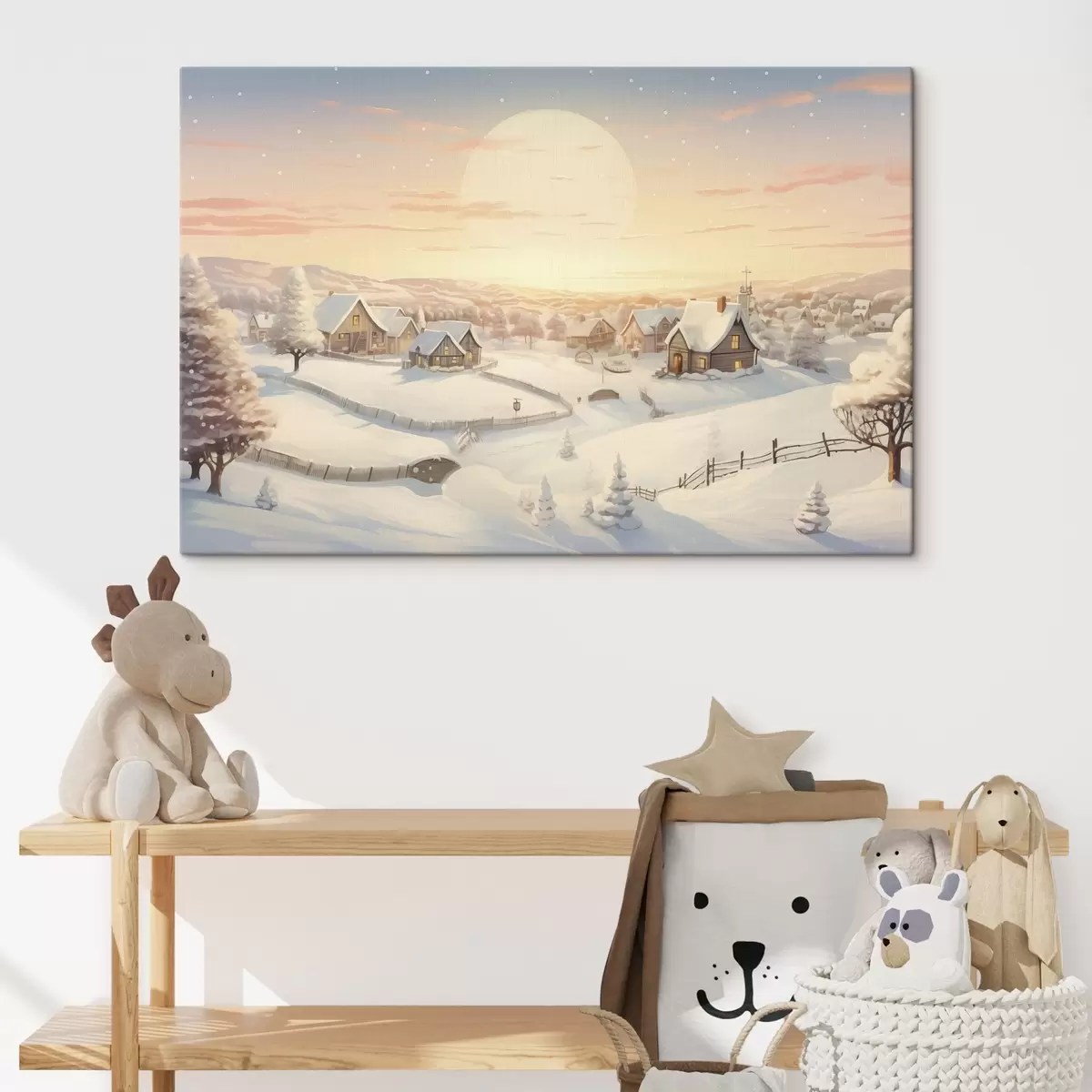 murales Pueblo de invierno al atardecer, casas cubiertas de nieve, pinos s41380