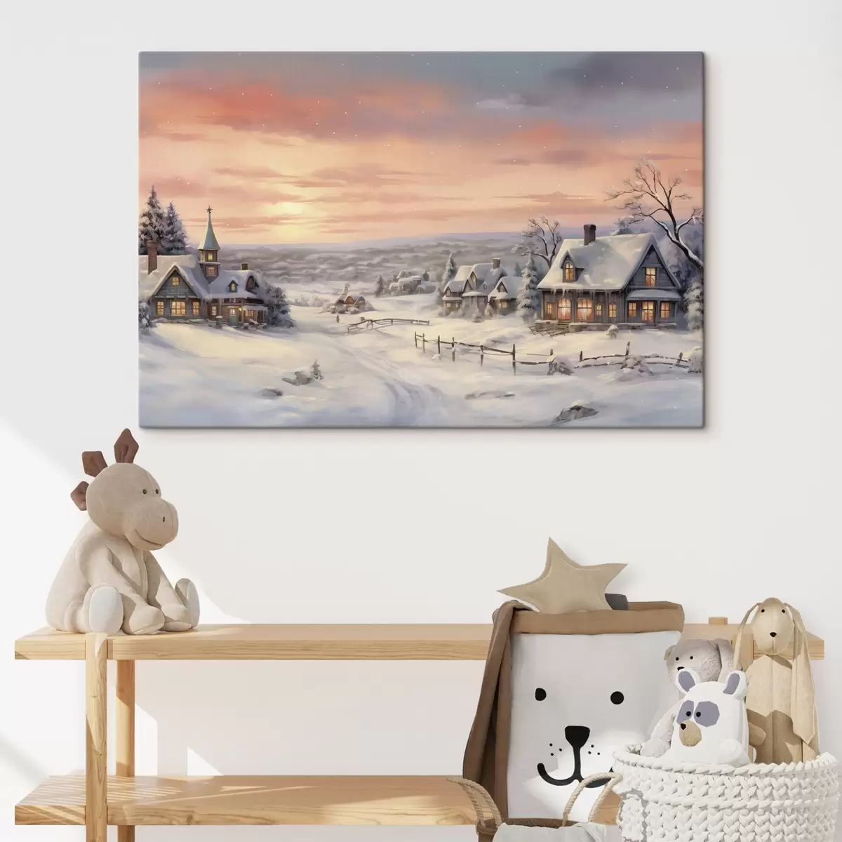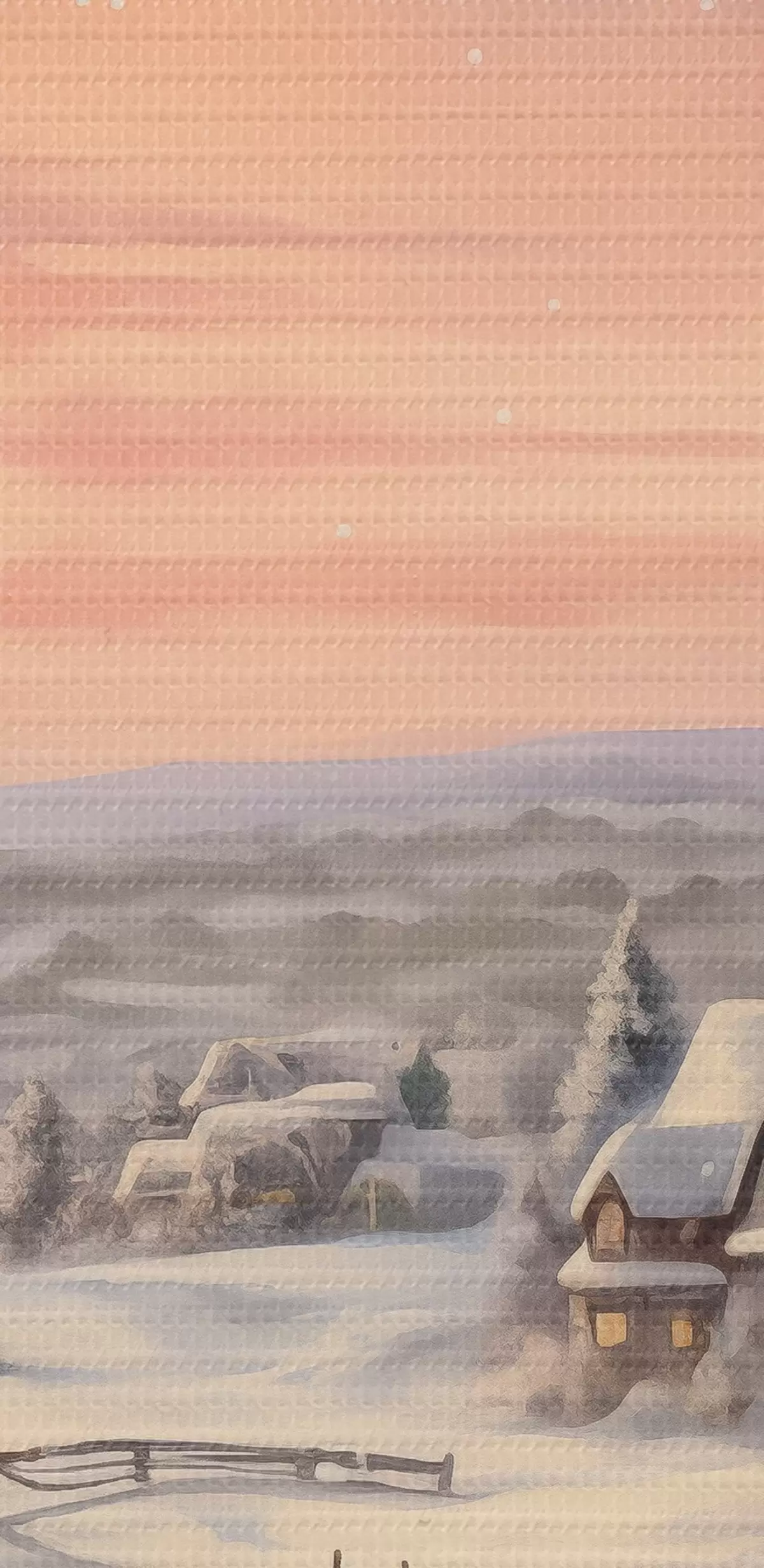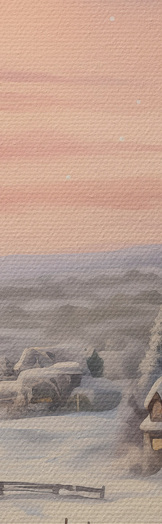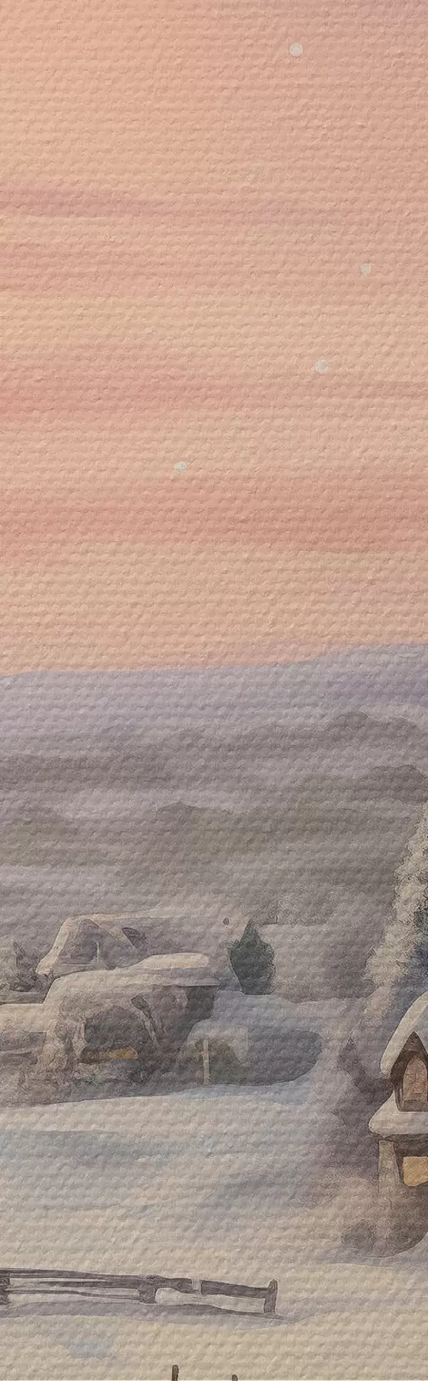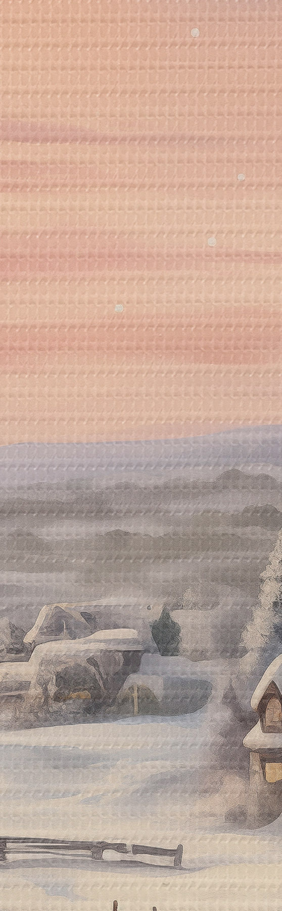 murales Puesta de sol en el pueblo de invierno, rústico, acuarela, copos de nieve s41386