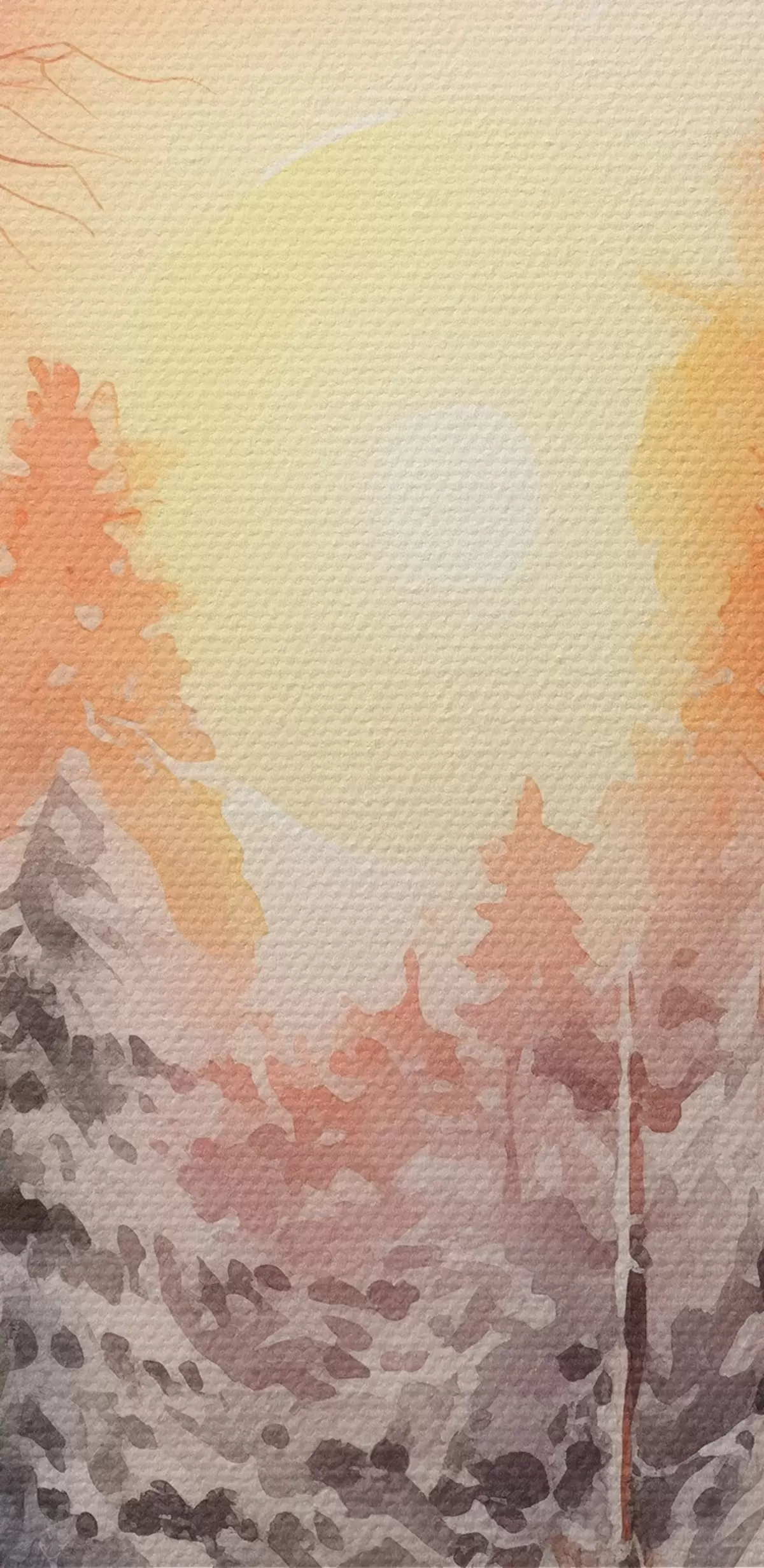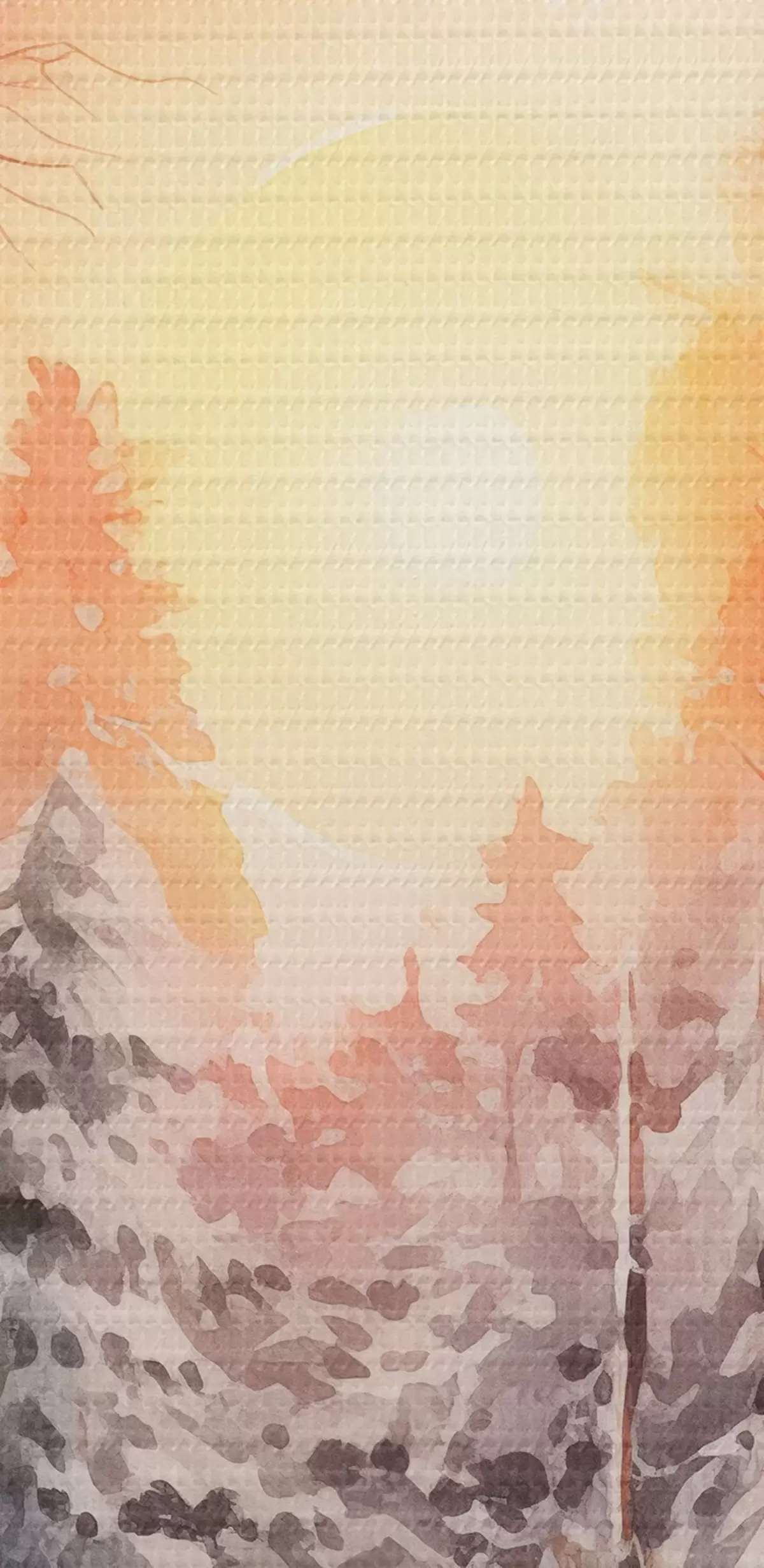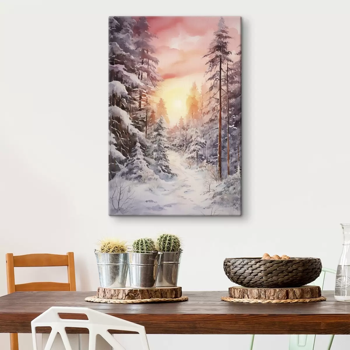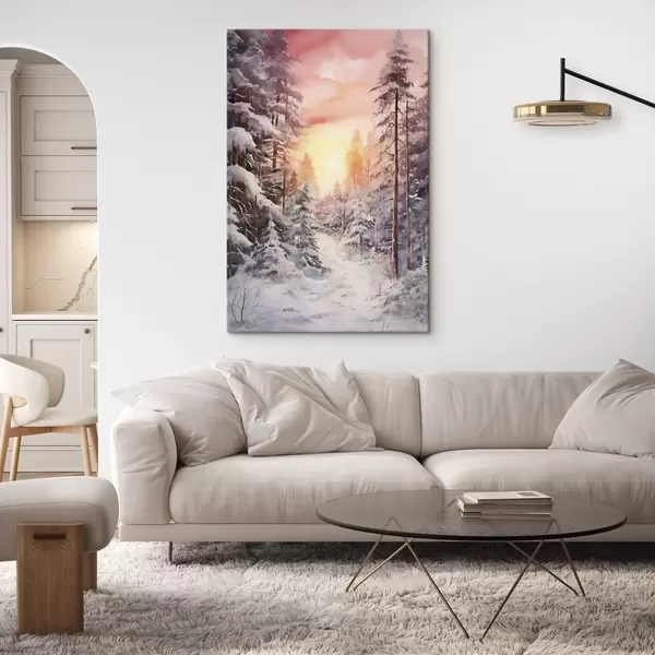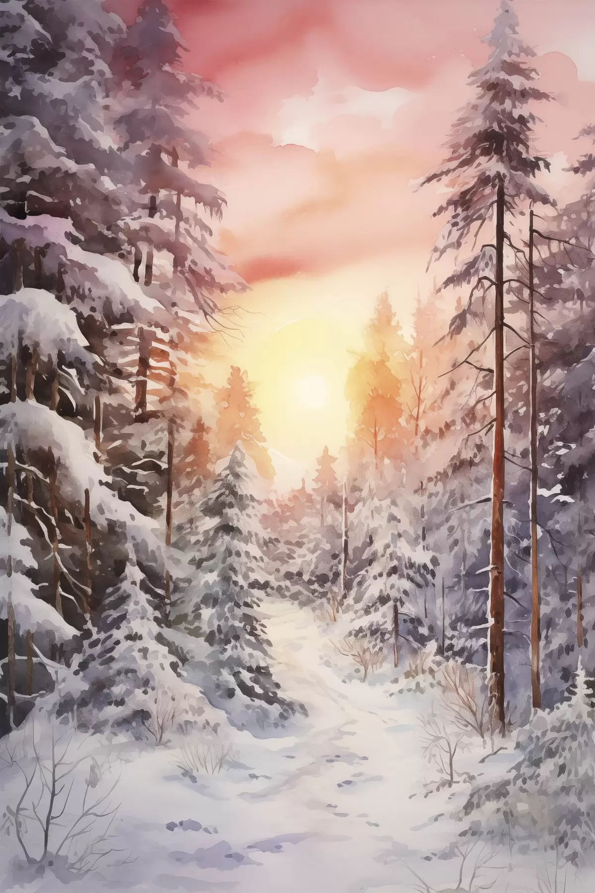 murales Hermoso invierno, acuarela bosque, nevado, árboles, cielo rosa, puesta de sol s41641