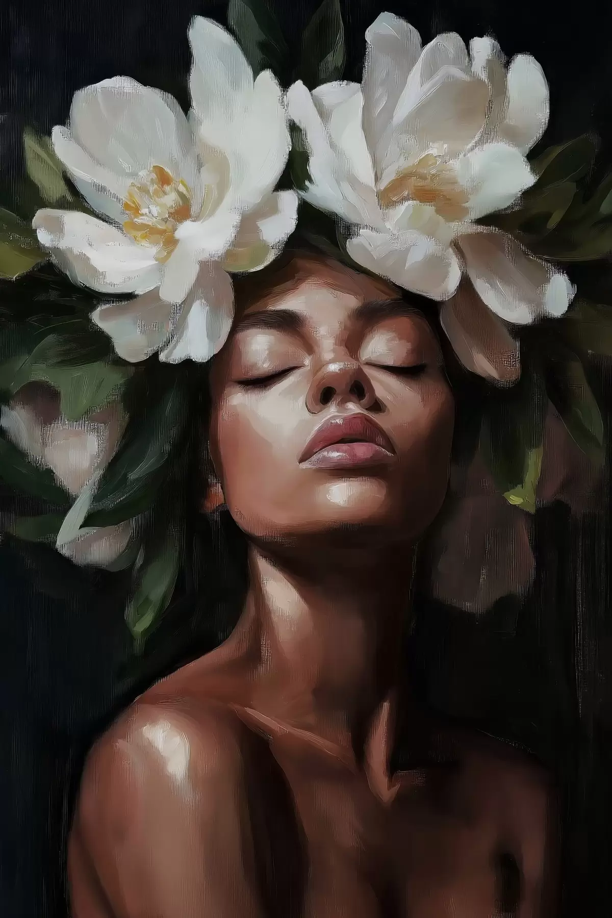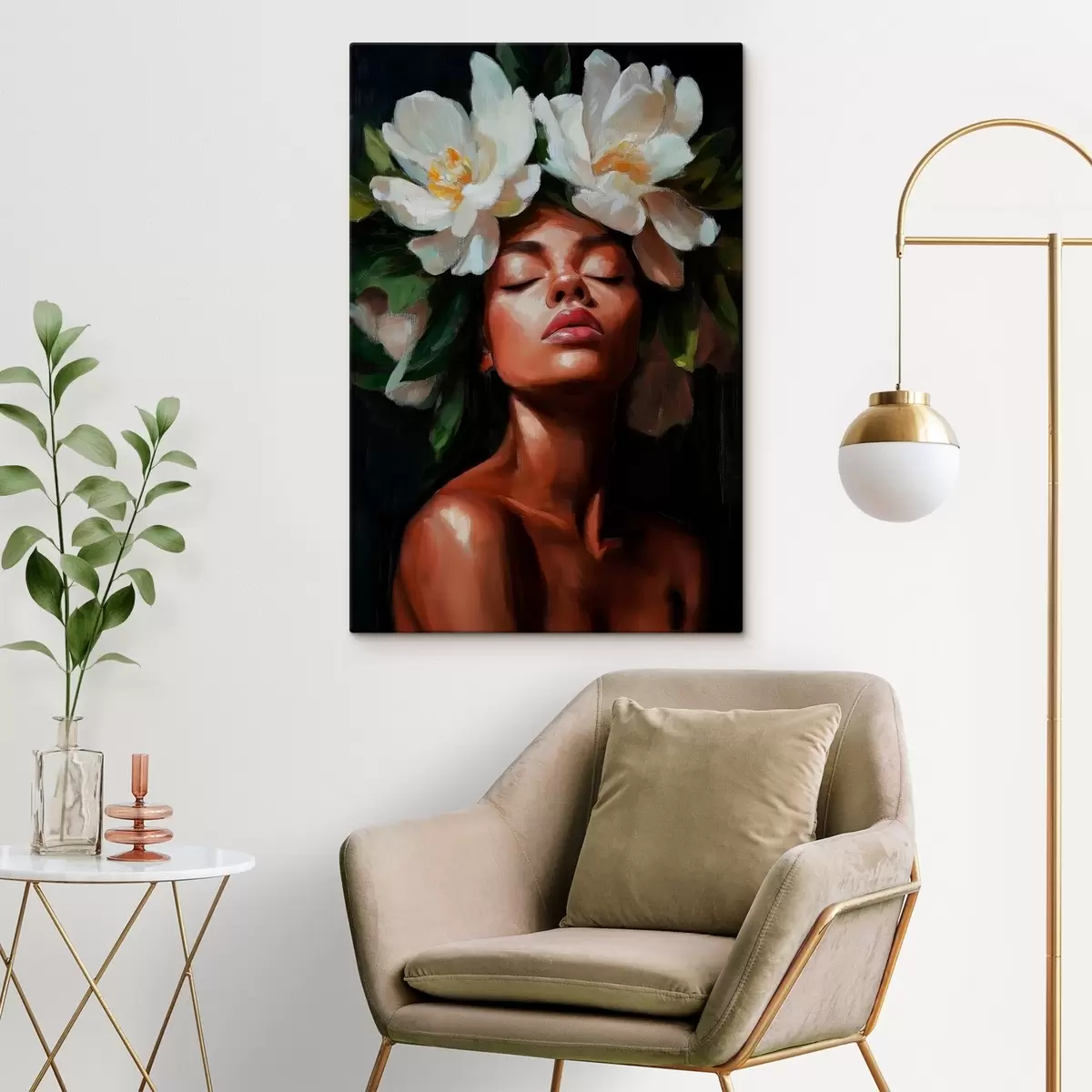murales Retrato femenino con flores blancas en el pelo sobre fondo oscuro s41824