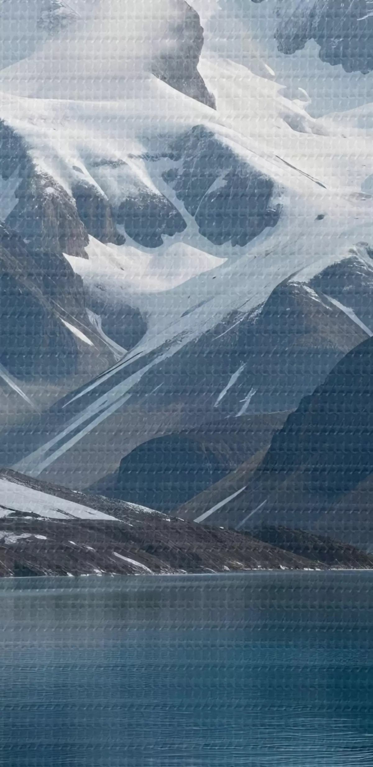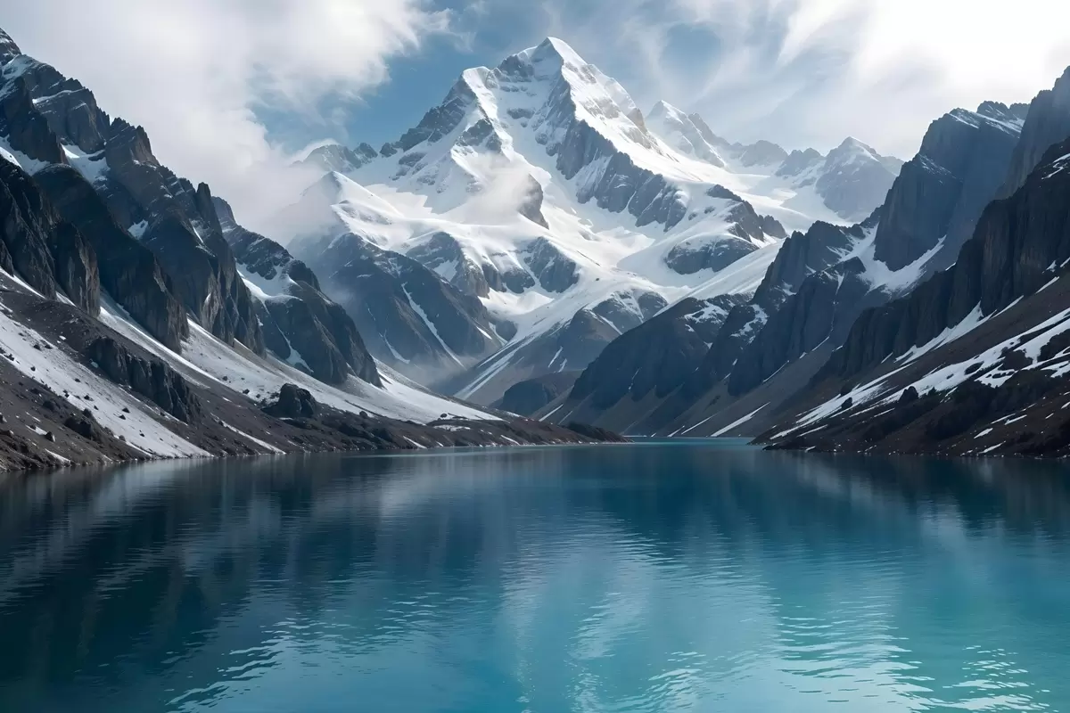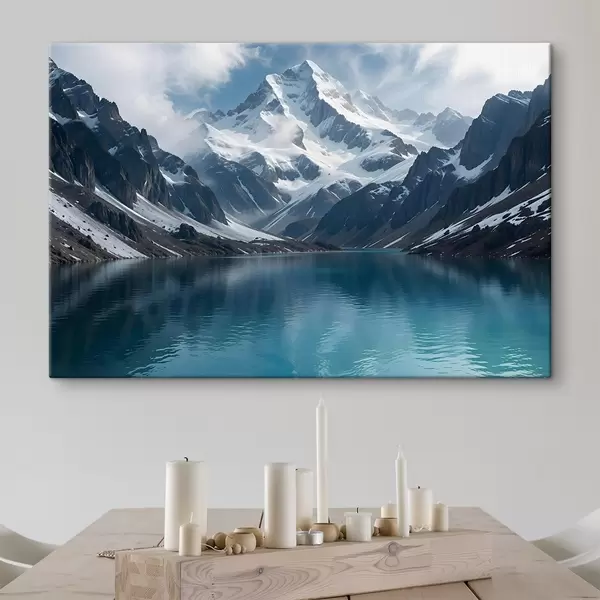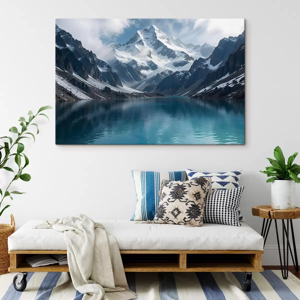 murales Un pico de montaña nevado reflejado en un sereno lago turquesa, rodeado de terreno rocoso y dramáticas nubes s42232