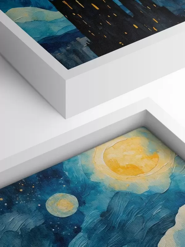 Vendemos cuadros en bastidor: se trata de un marco de madera sobre el que se extiende el lienzo. Este cuadro no necesita marco; puedes colgarlo directamente en la pared.