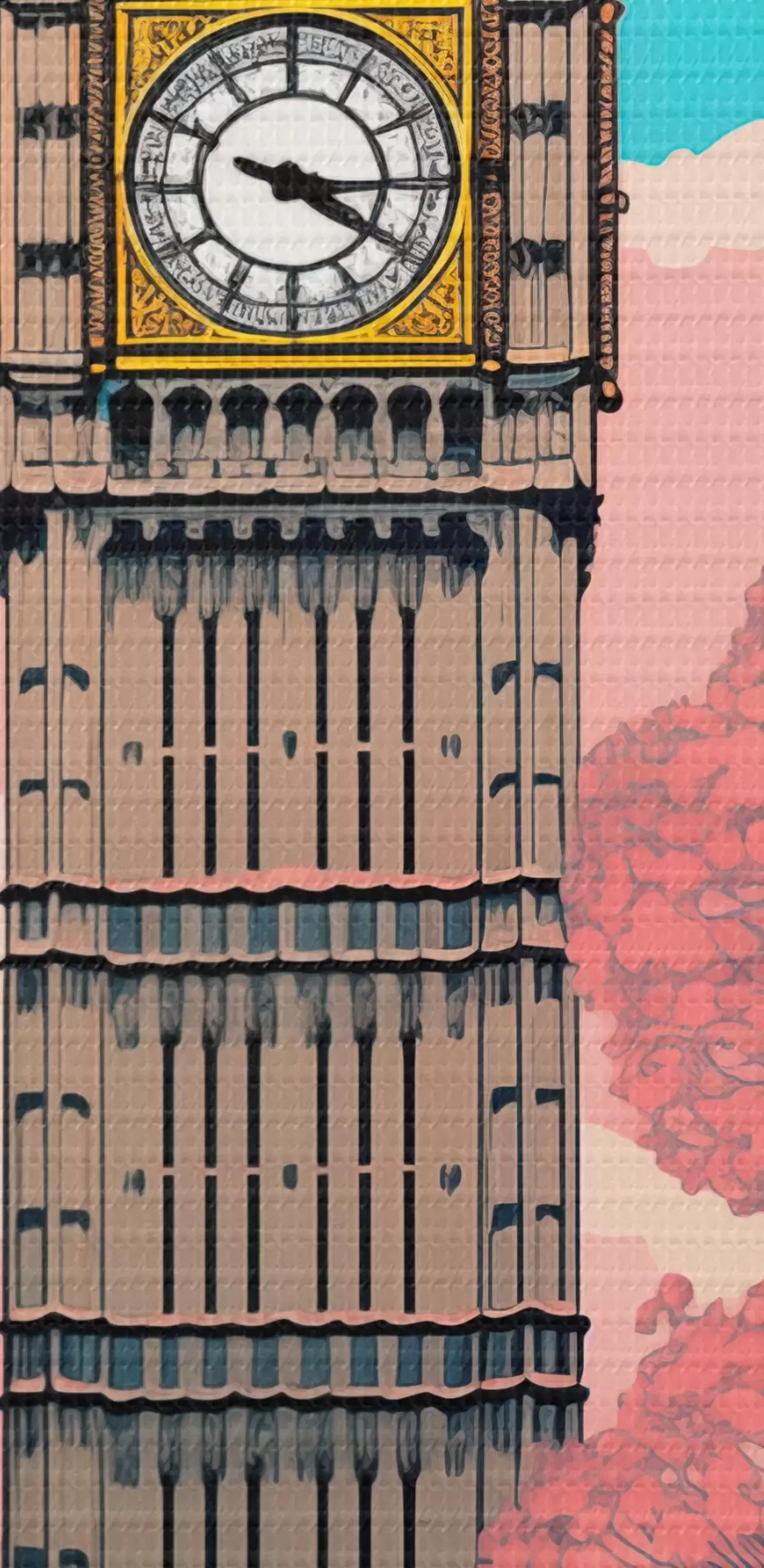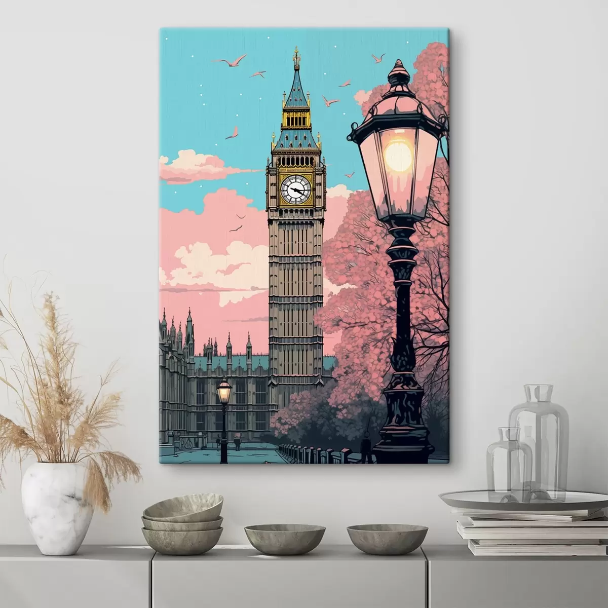 murales Una vista del Big Ben con árboles de color rosa primaveral, un cielo azul brillante y una farola antigua en primer plano s42578