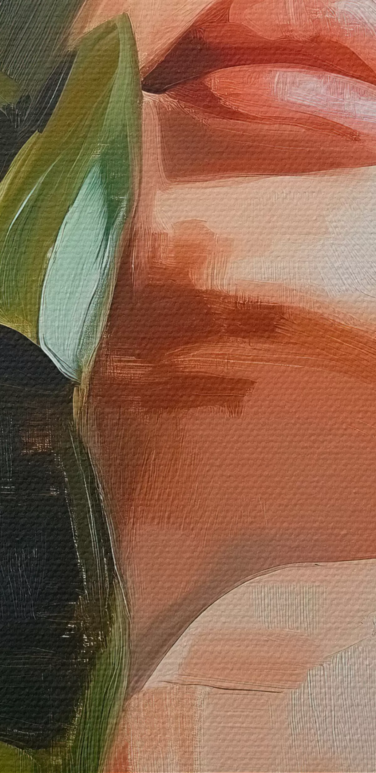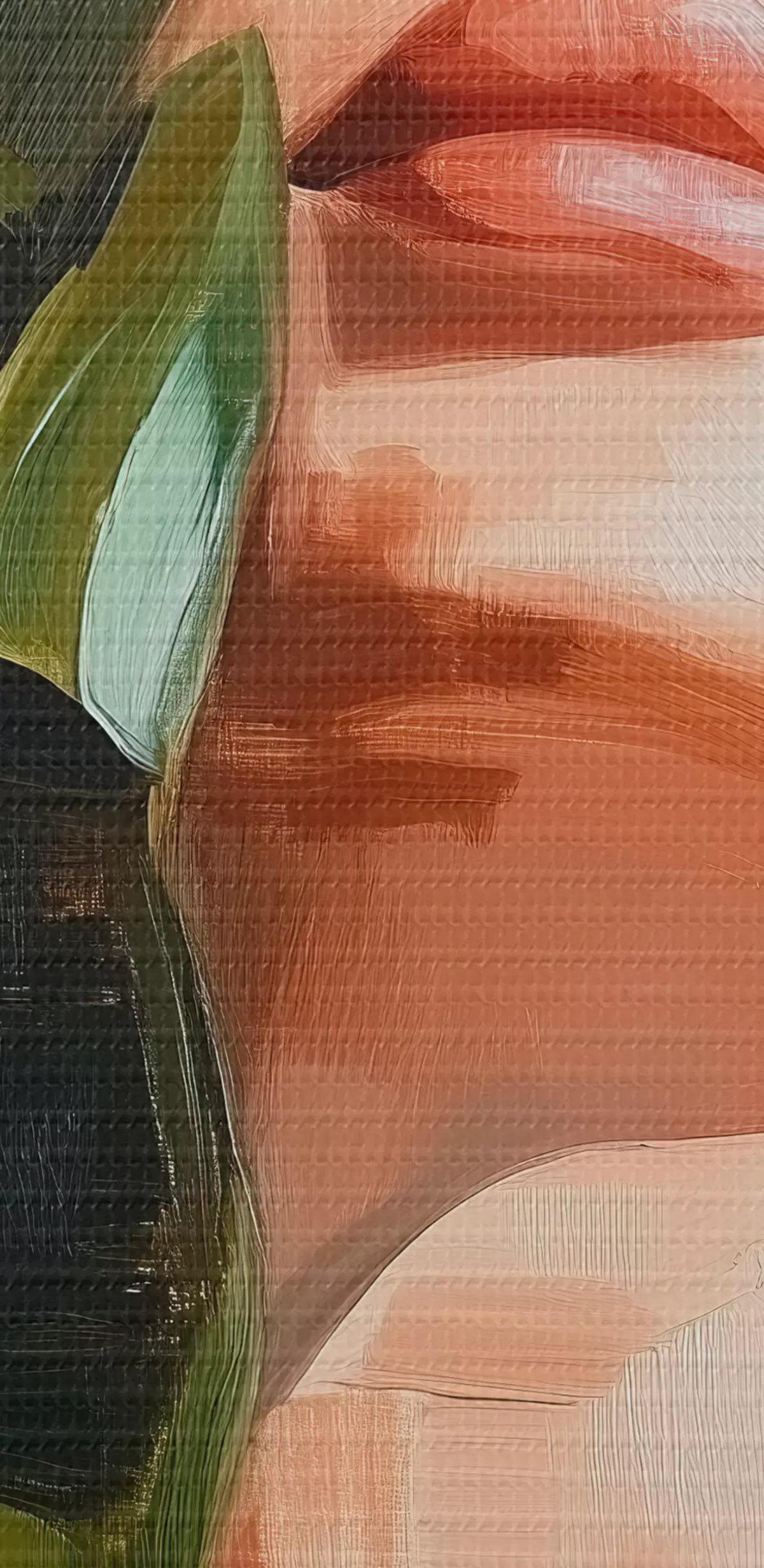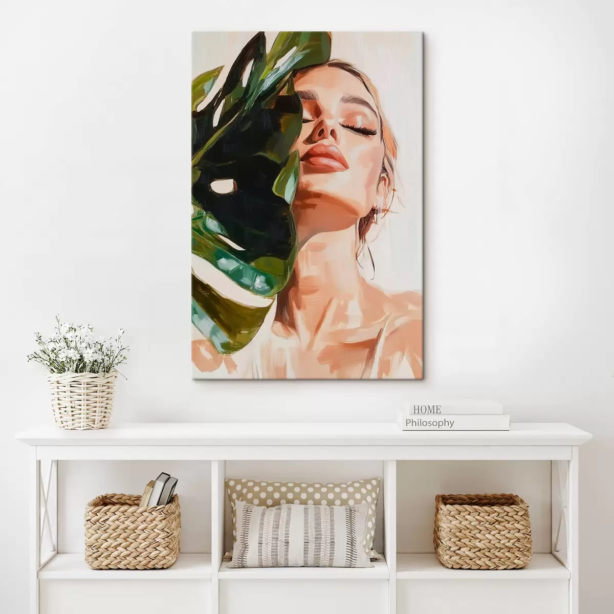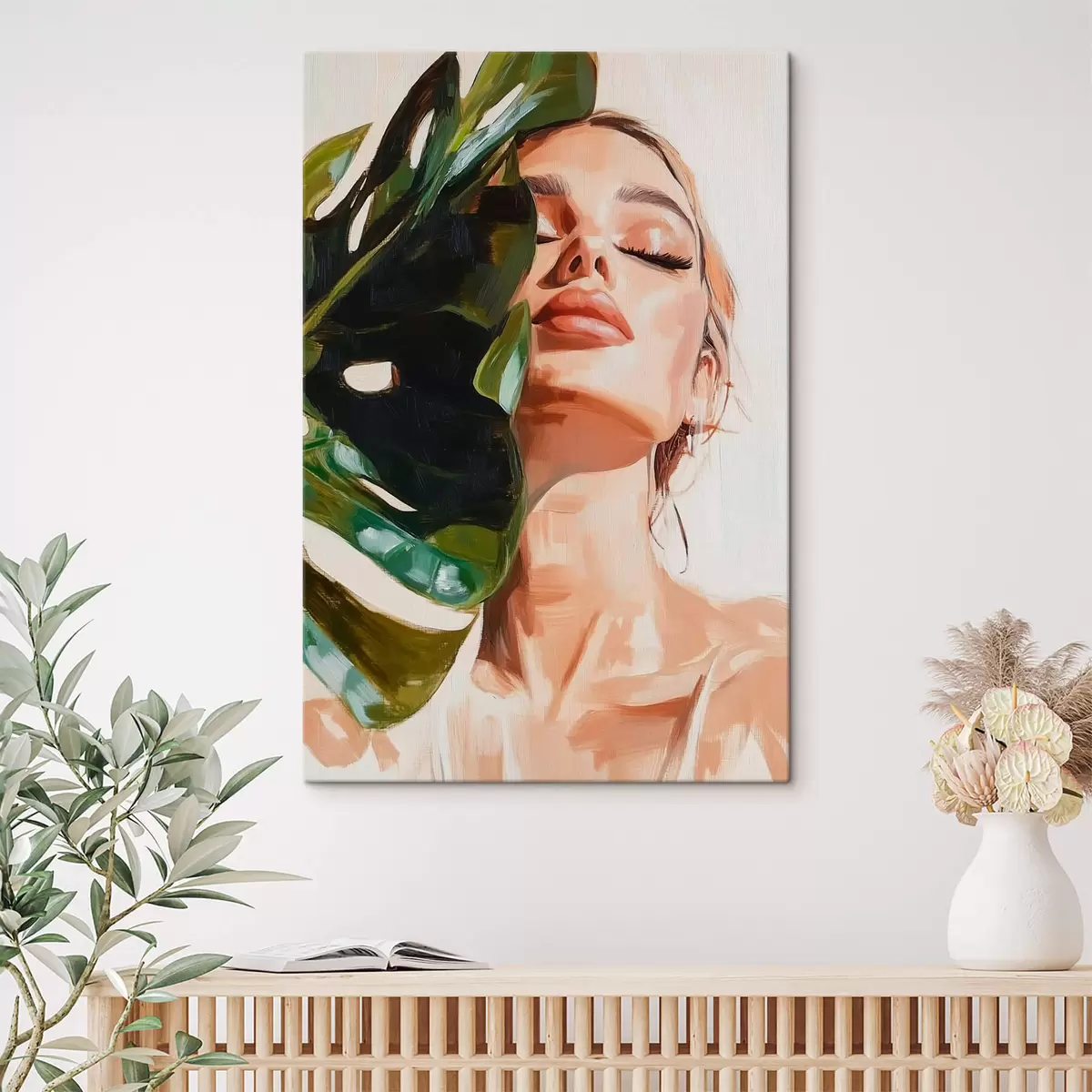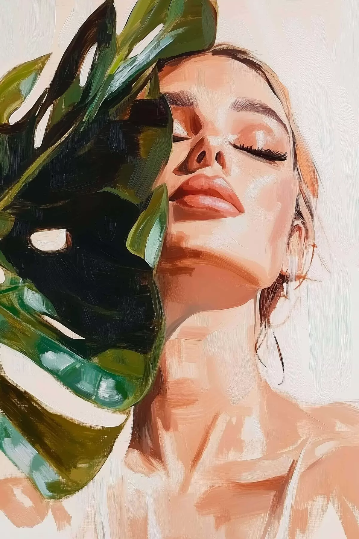 murales Retrato de mujer con una hoja de monstera con pinceladas de imitación s42597