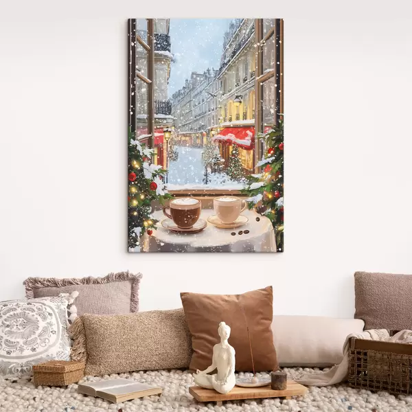 murales Acogedora cafetería de invierno, tazas de café, estilo acrílico, arquitectura antigua de la ciudad s42795