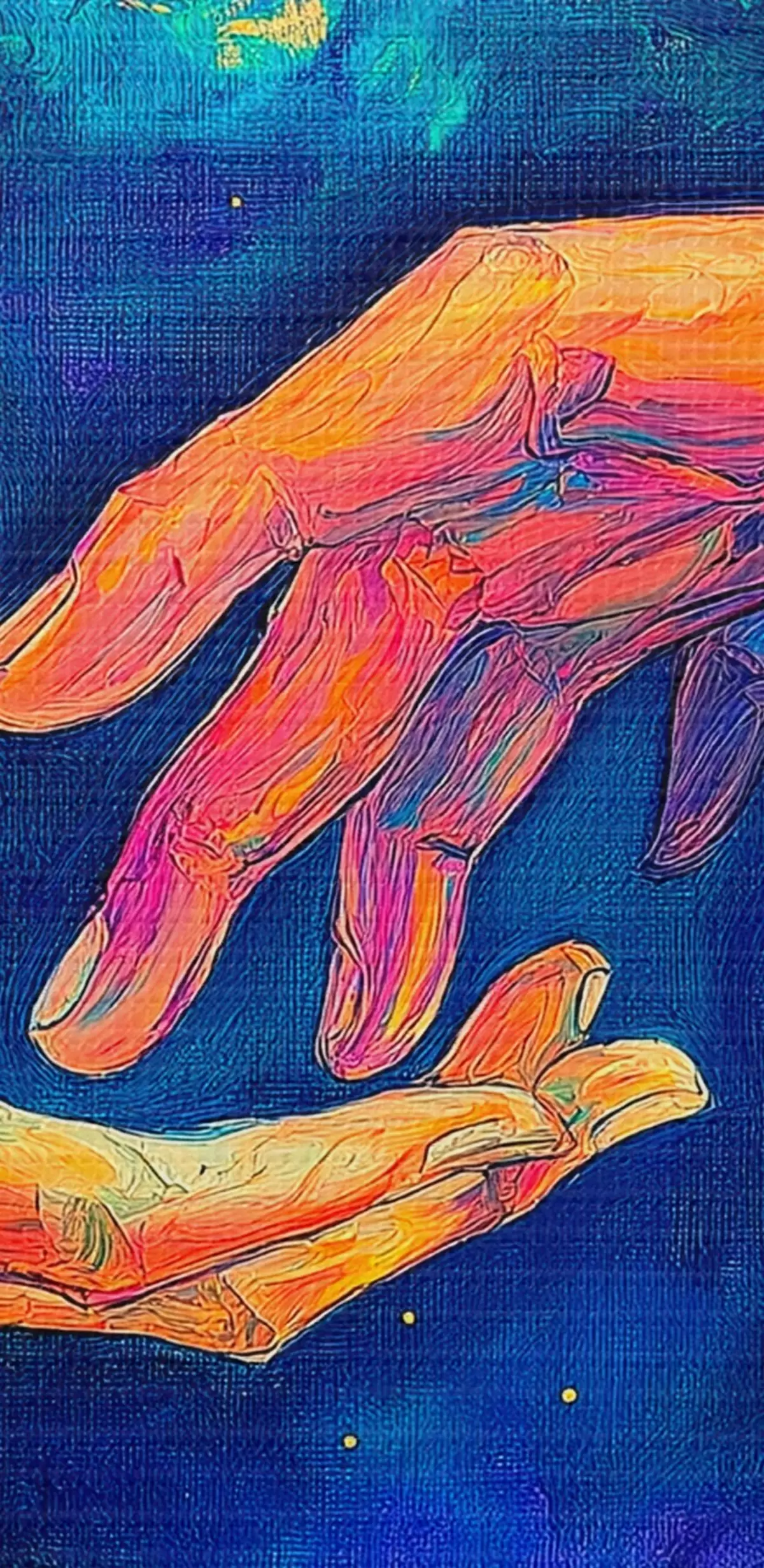murales Composición abstracta de dos manos que se tienden una a otra, en una paleta de colores vibrantes sobre un fondo cósmico s42937