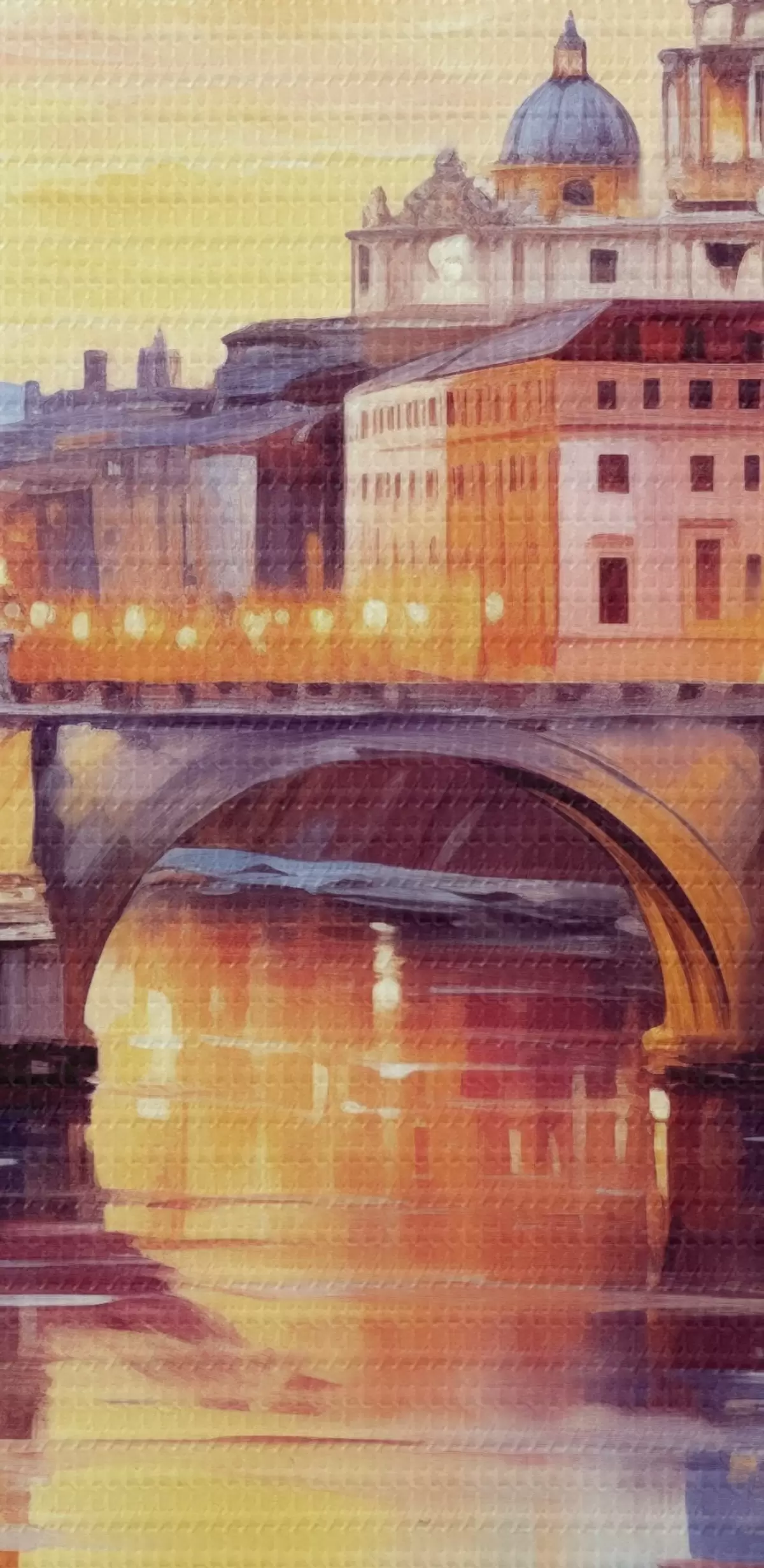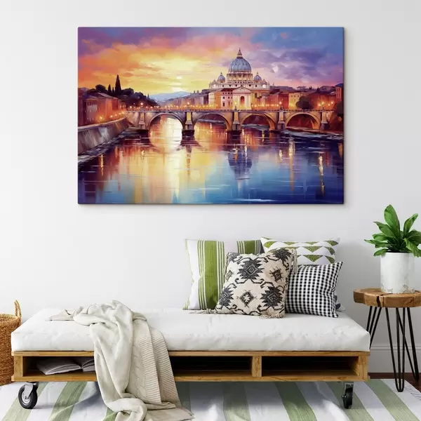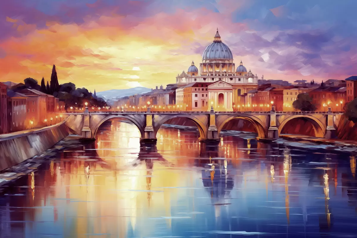 murales Basílica de San Pedro y puente sobre el río al atardecer, colores cálidos, reflejo en el agua, estilo pintura al óleo s43396