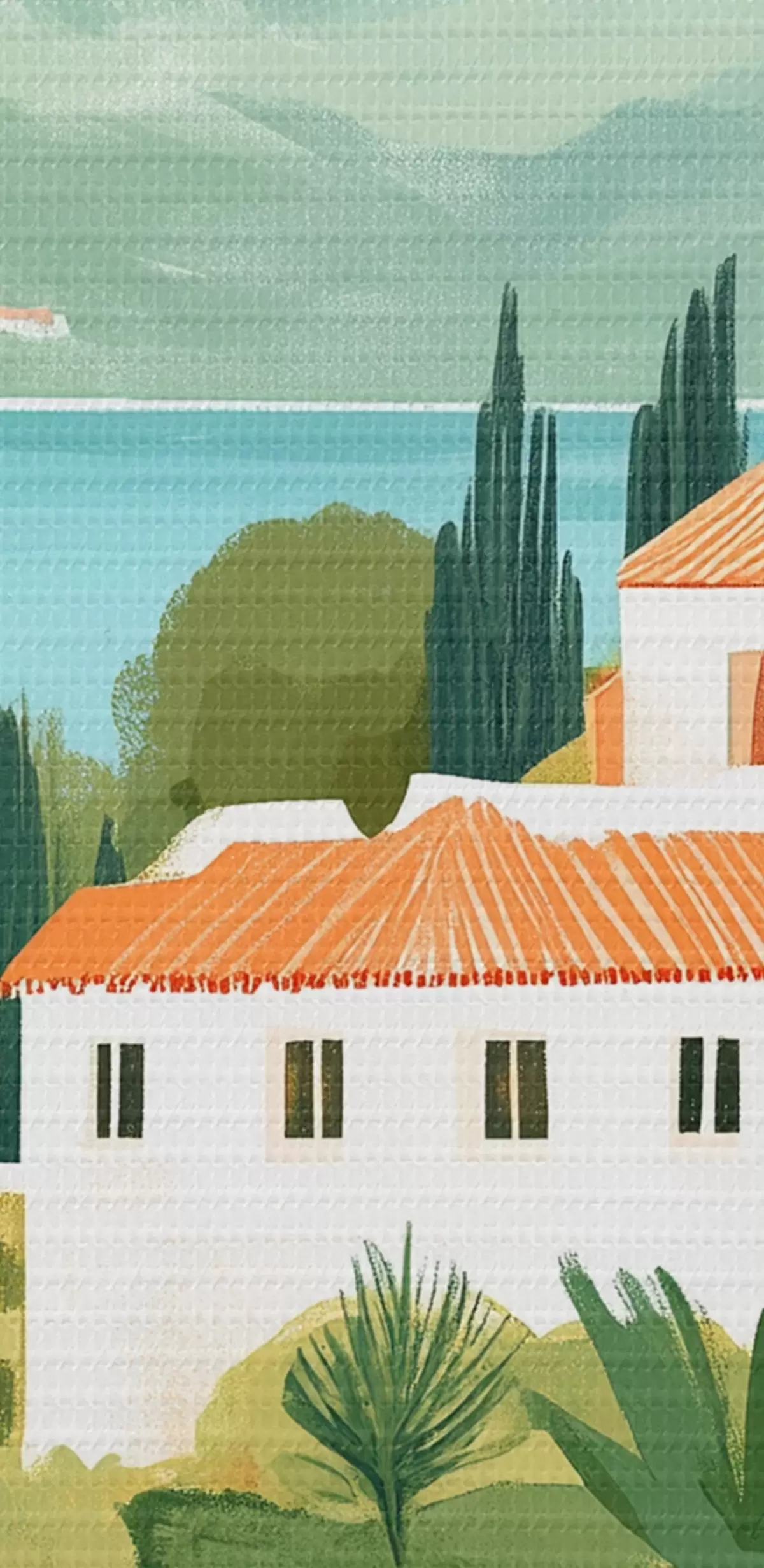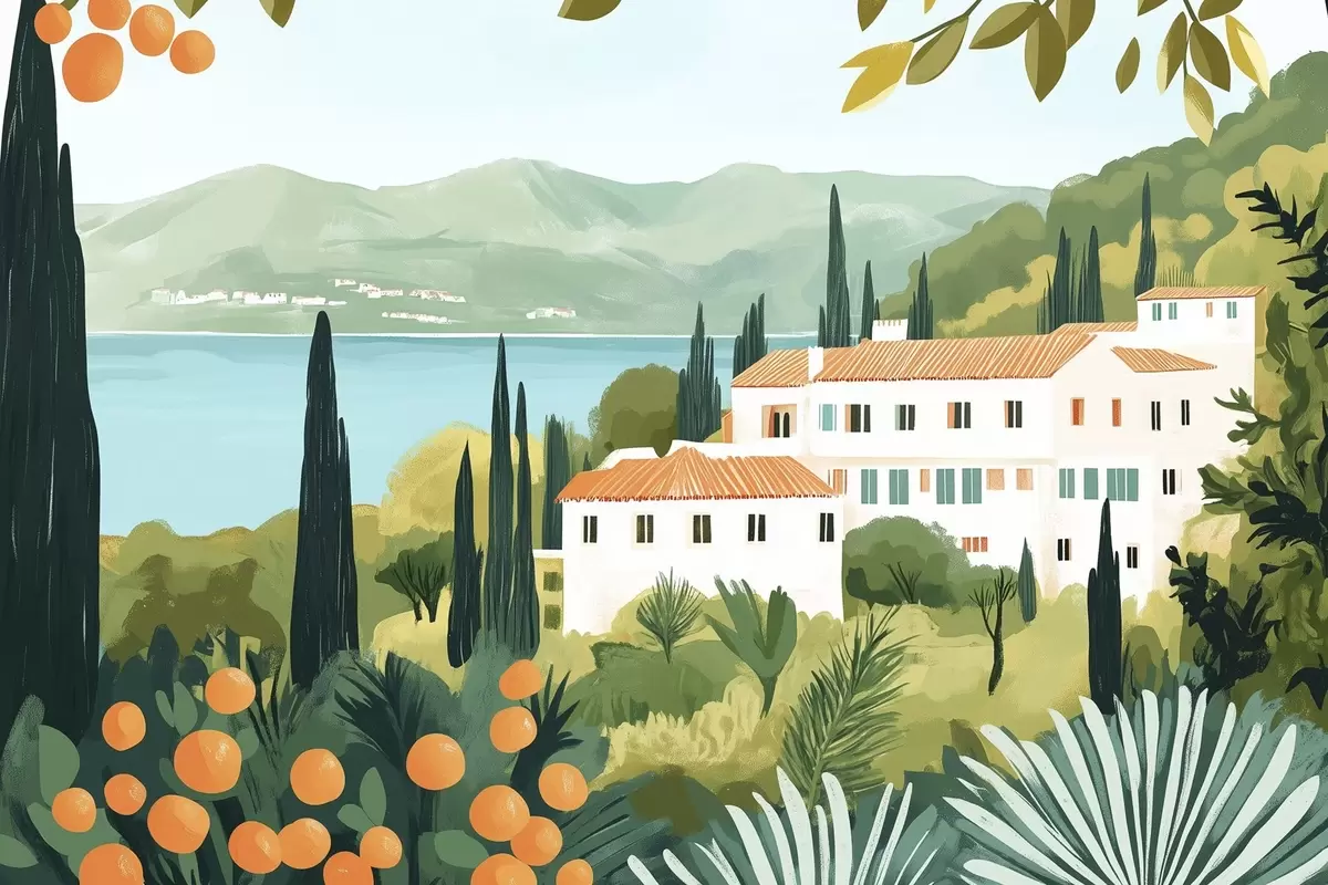 murales Paisajes mediterráneos con naranjos y casas, costa del mar s44027