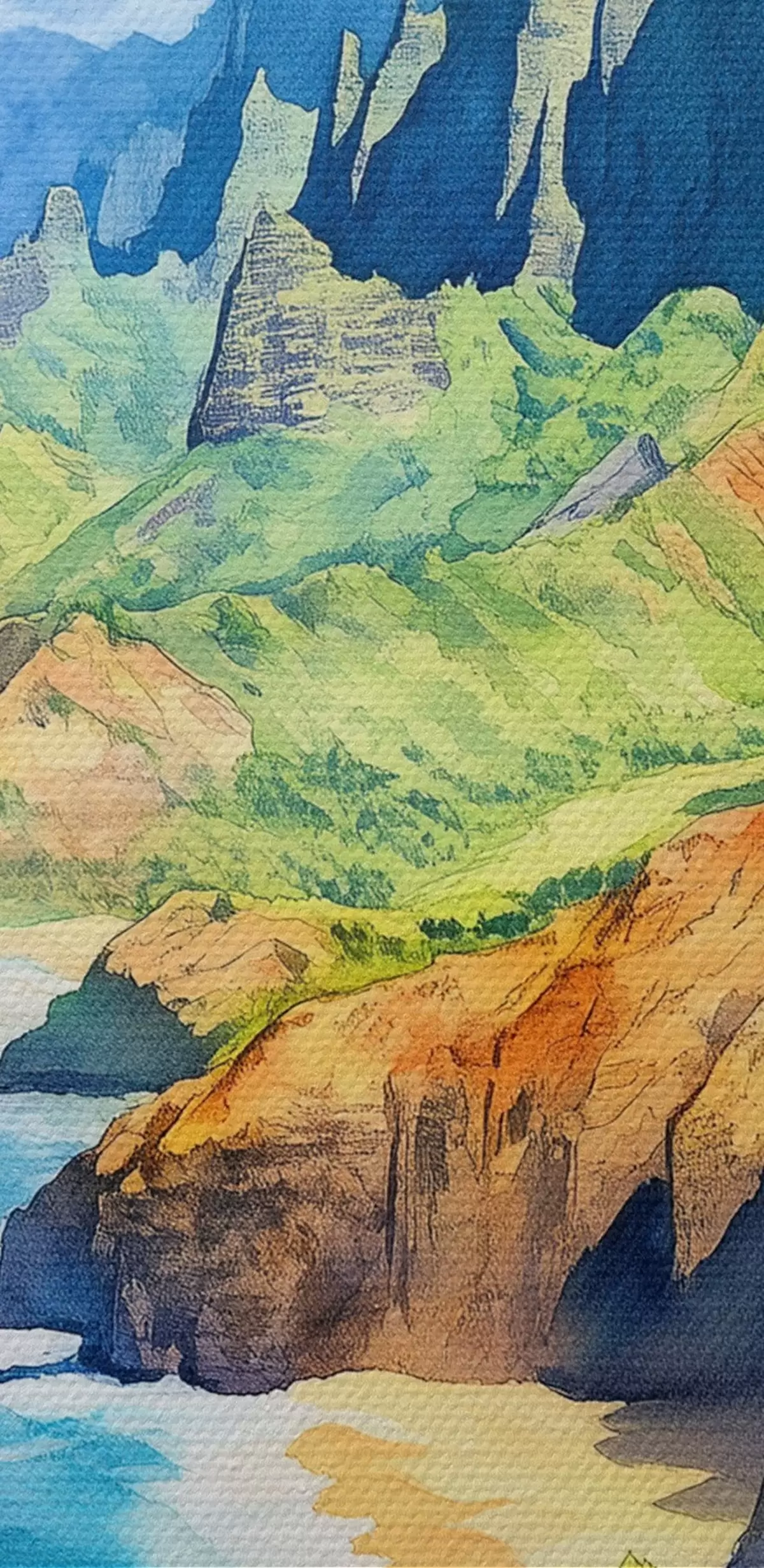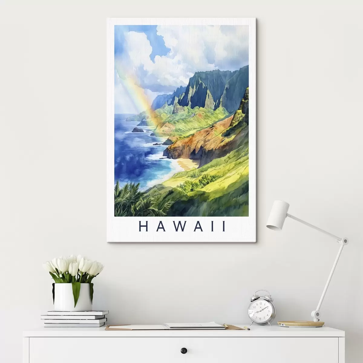 murales Isla de Hawai, estilo acuarela, arco iris, montañas verdes, océano s44141