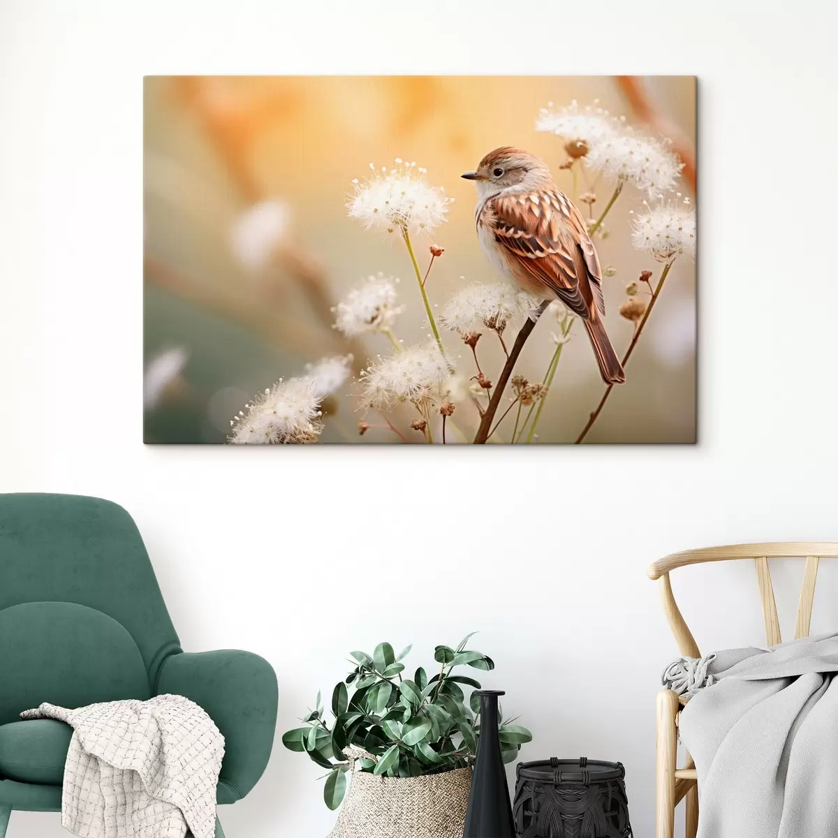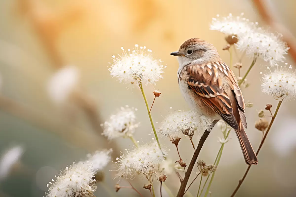murales Un pájaro posado en una rama con flores blancas, enfoque suave, fondo de naturaleza s44393