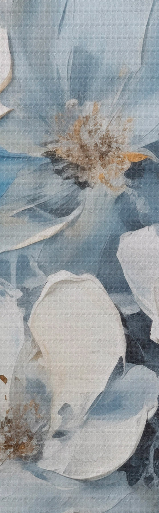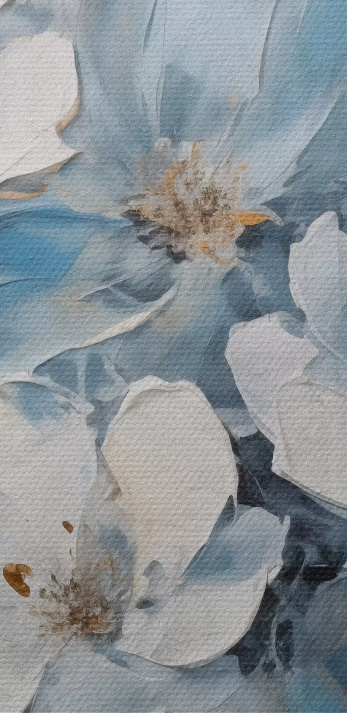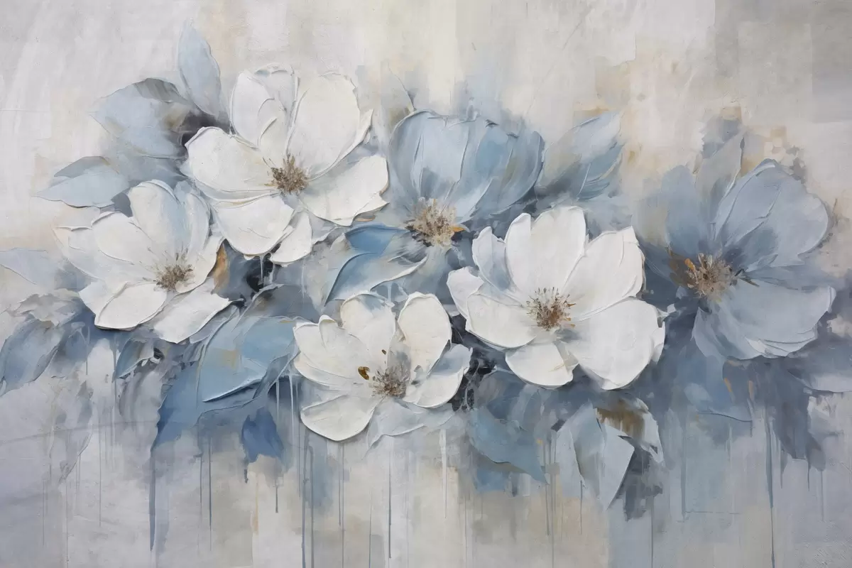 murales Flores blancas con hojas azules, sobre fondo beige claro, con pinceladas visibles s44395