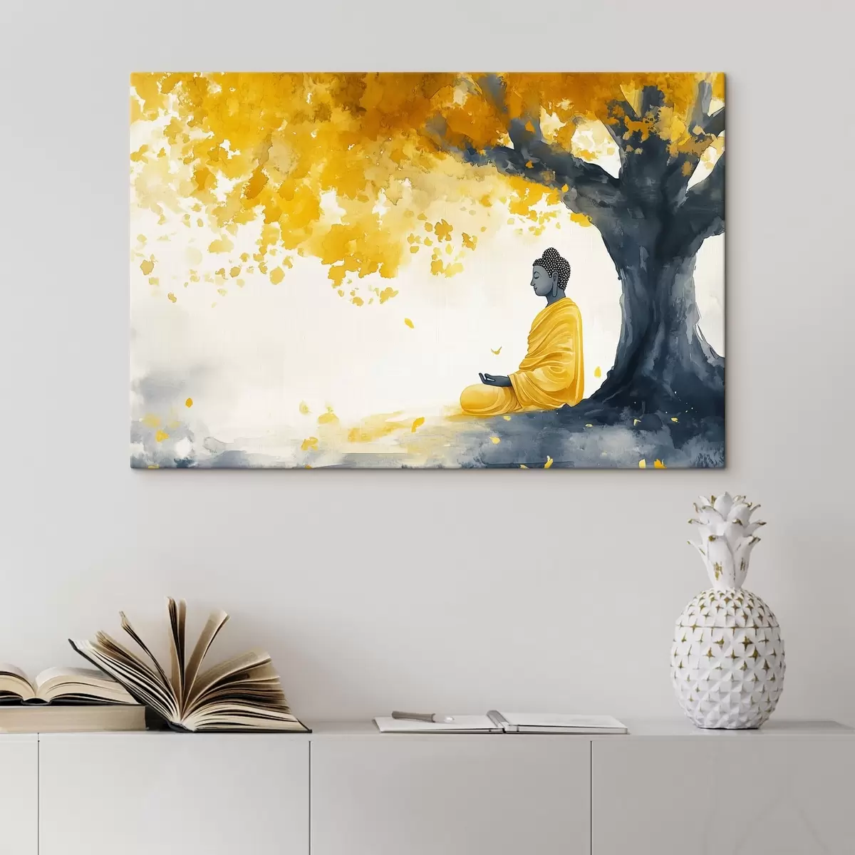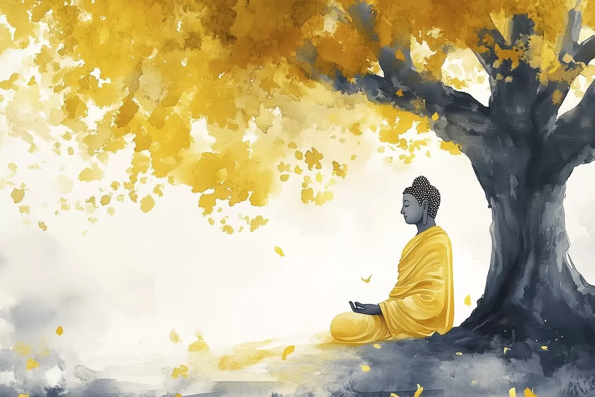 murales Buda meditando bajo el árbol, colores amarillo y gris s44509