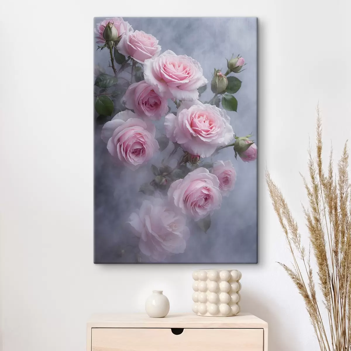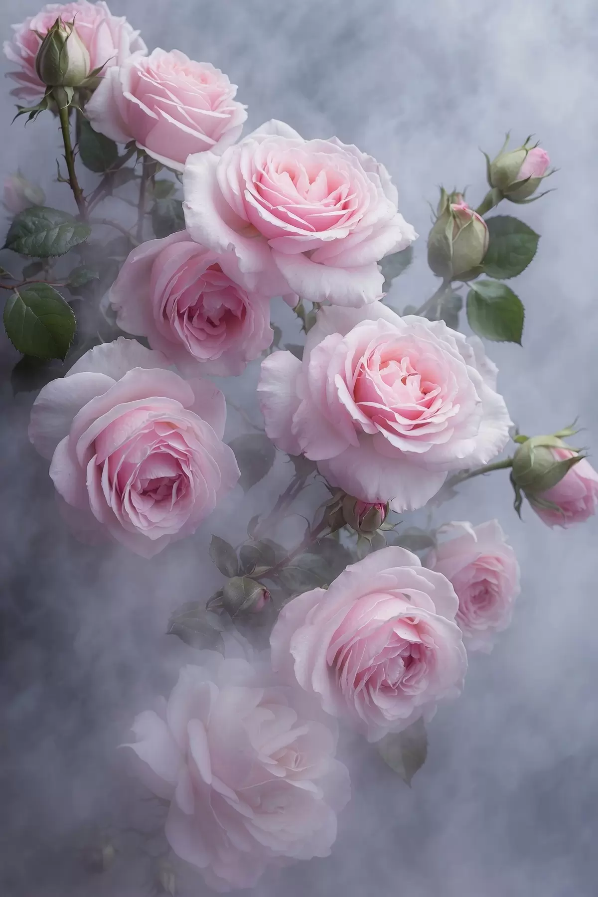 murales Rosas suavemente rosadas en la niebla con hojas verdes s44892