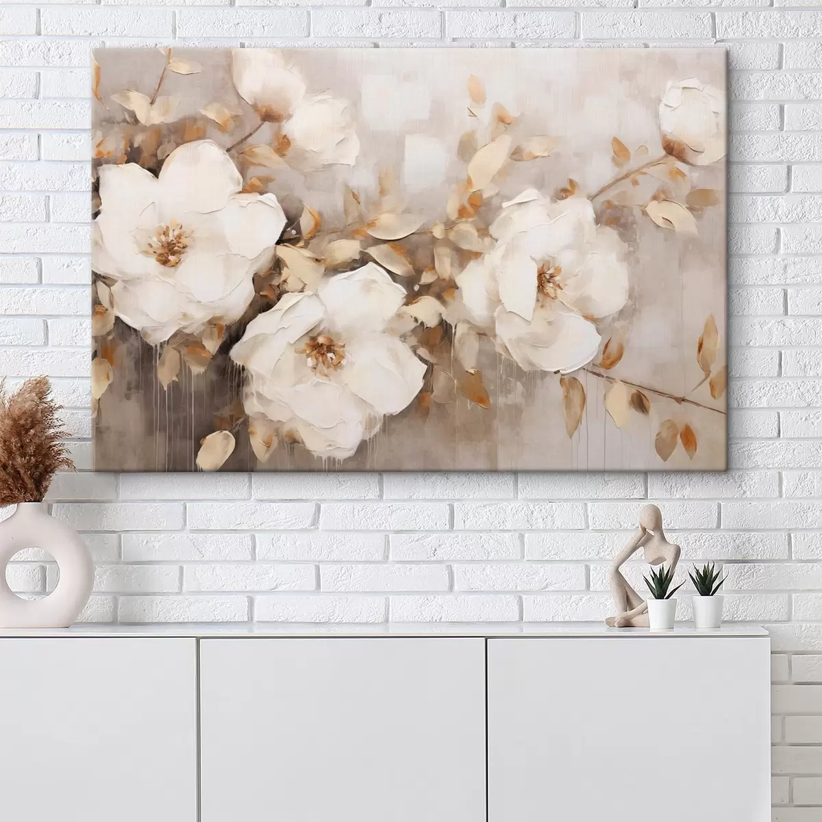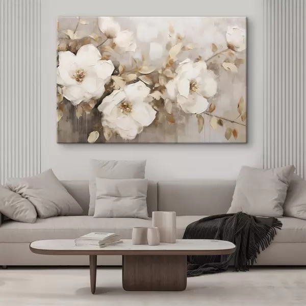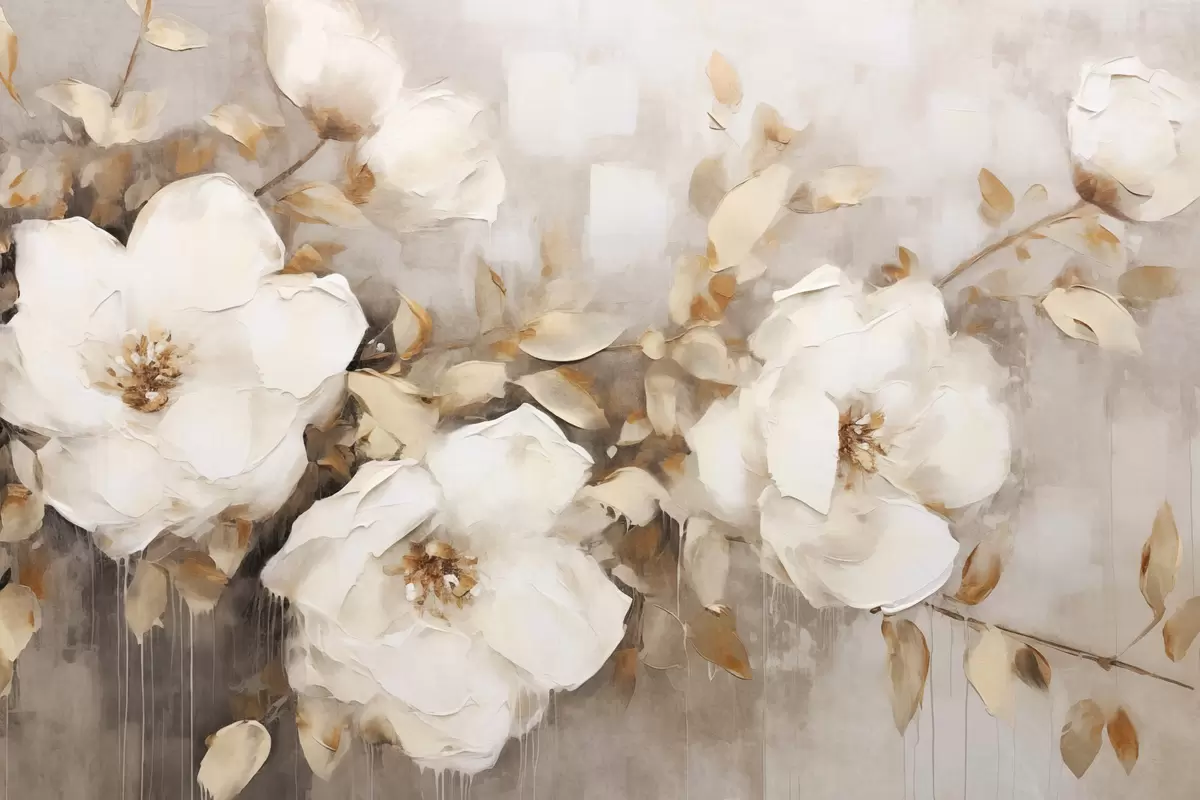 murales Flores blancas con hojas marrones en un fondo beige, imitación de pintura al óleo, arreglo floral, arte botánico s44922
