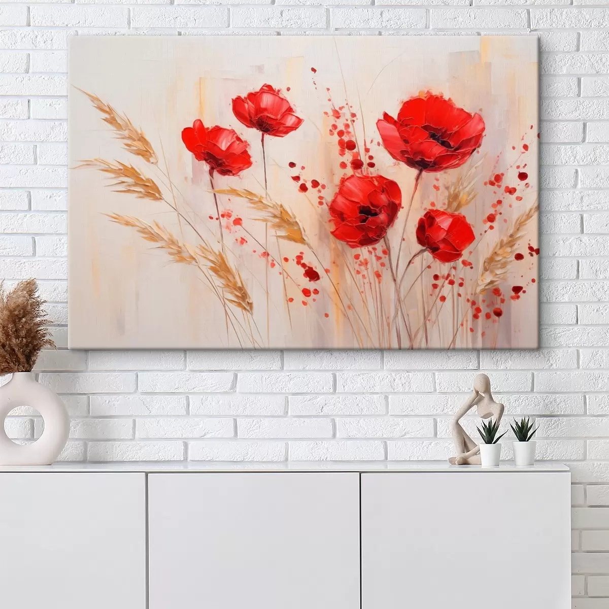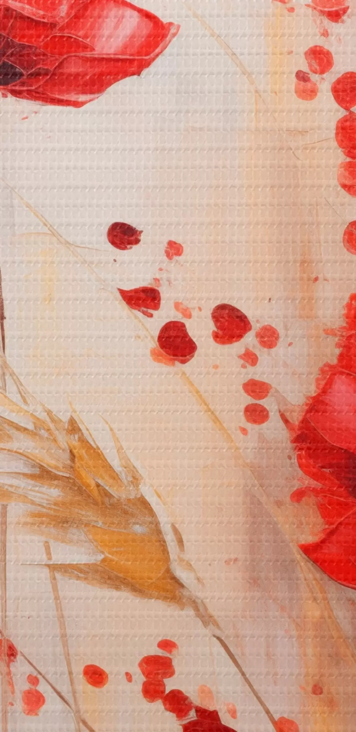 murales Flores rojas de amapola con tallos amarillos de trigo, sobre un fondo suave y neutro con salpicaduras de pintura roja s44926
