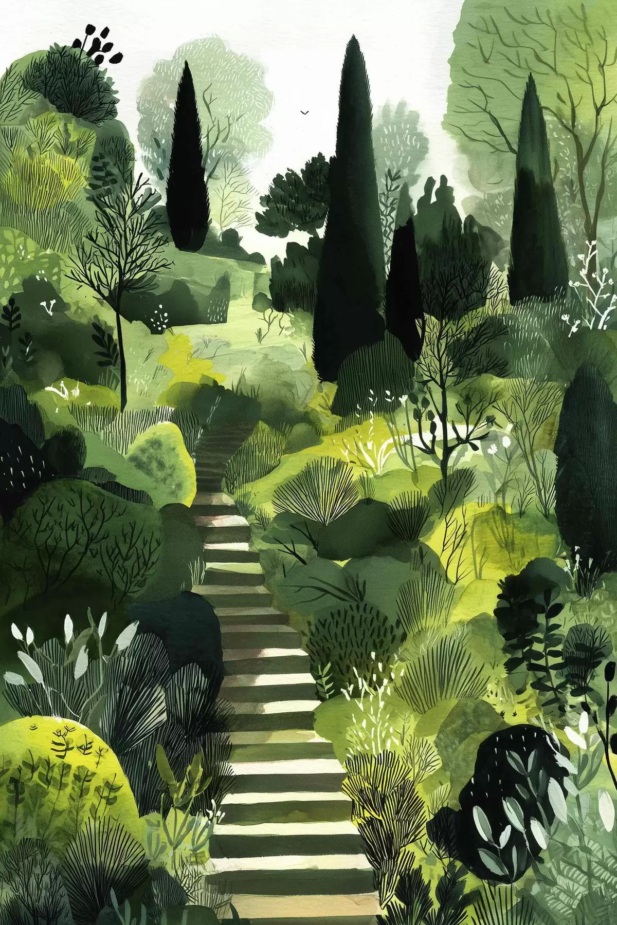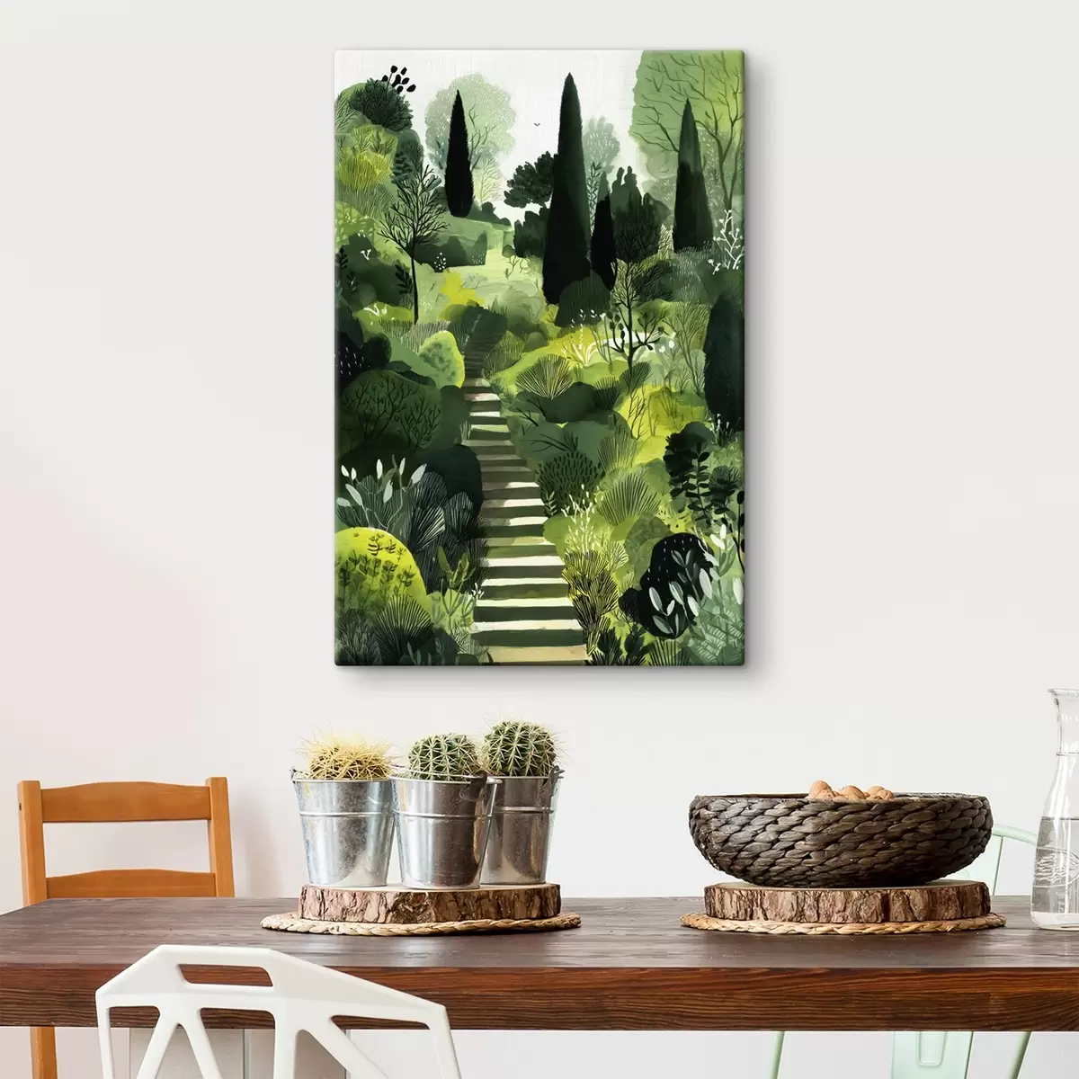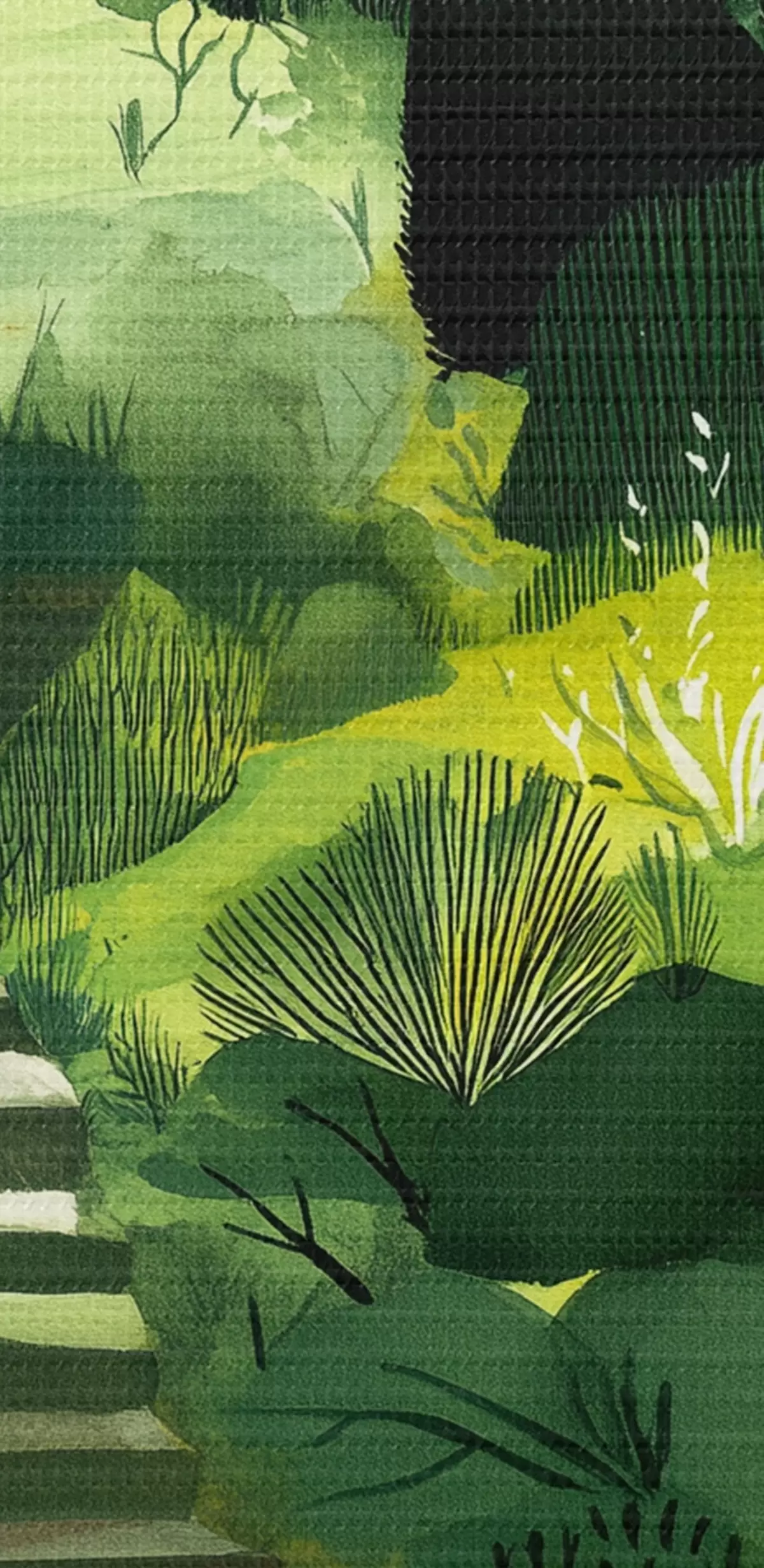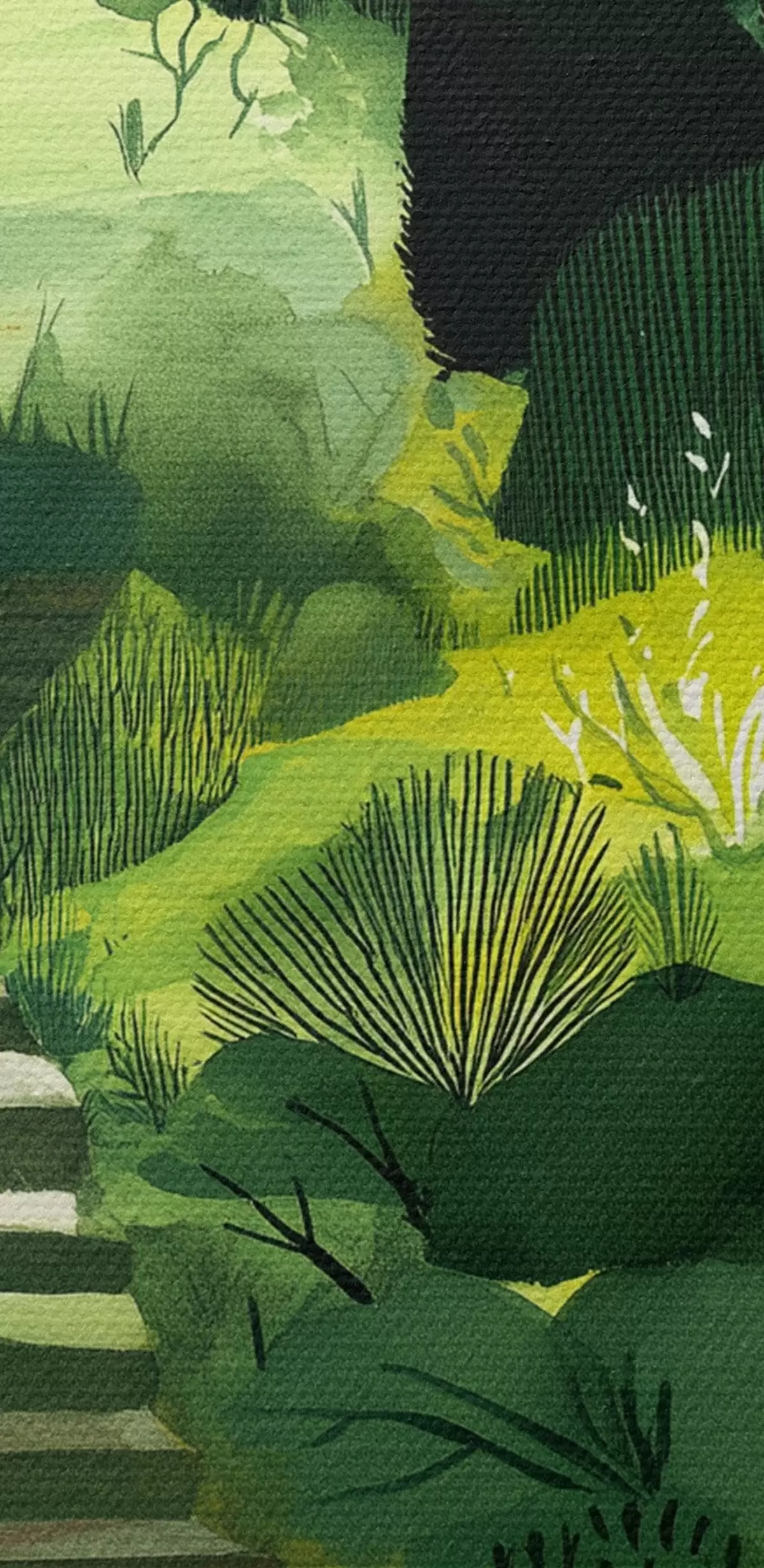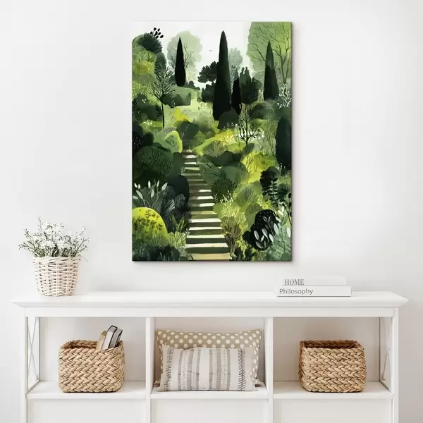 murales Colinas verdes con árboles y arbustos, escaleras de hormigón, colores exuberantes s44980