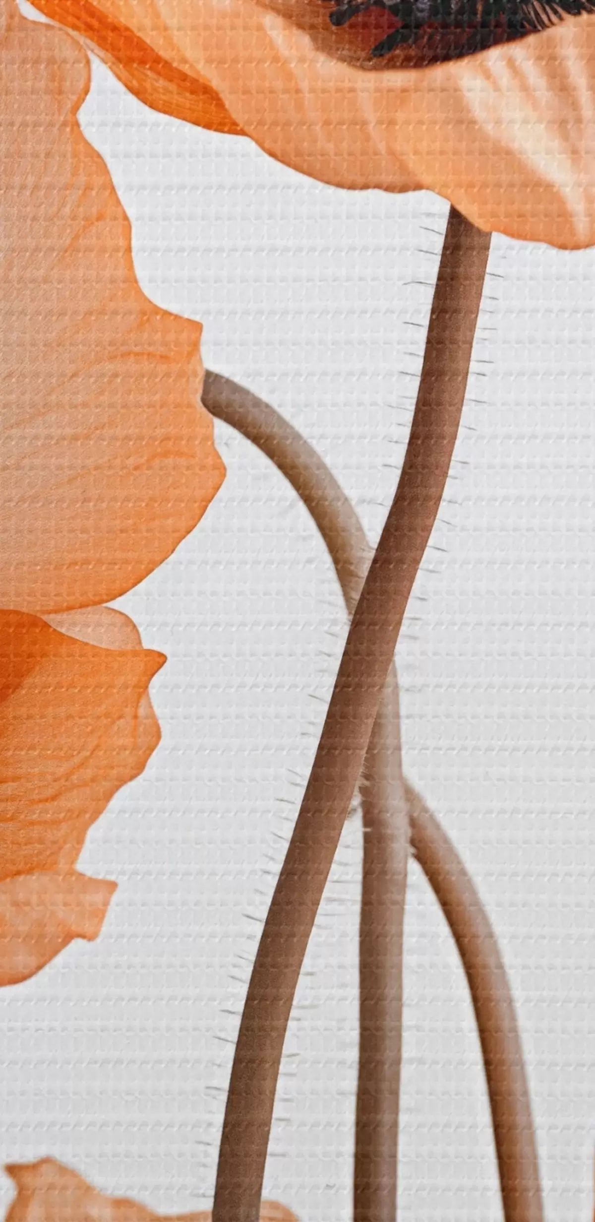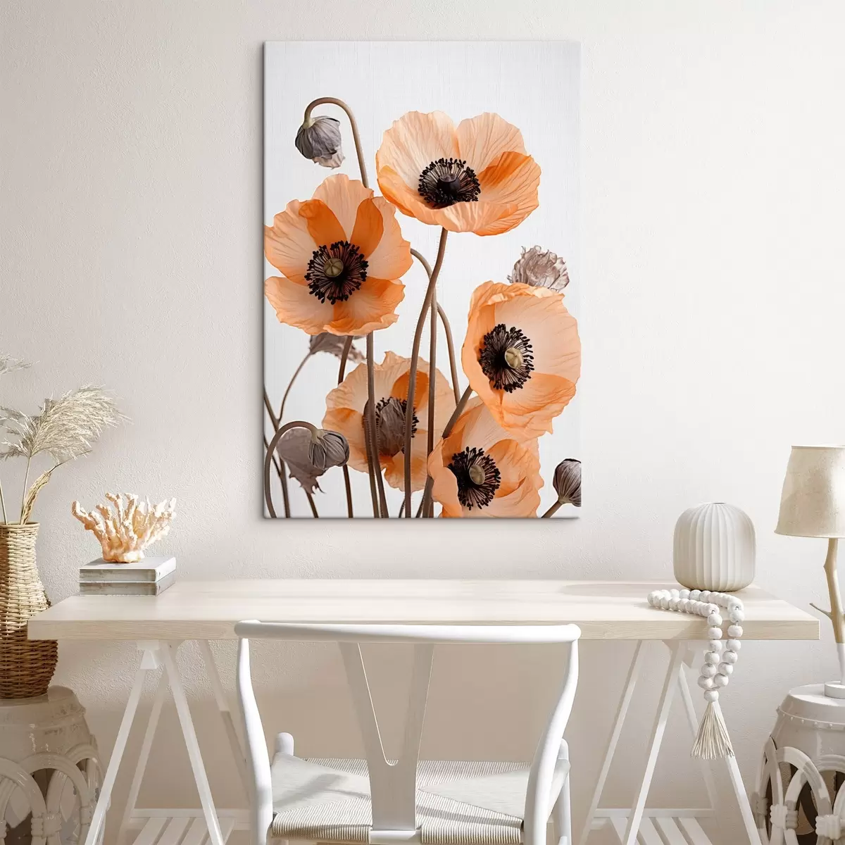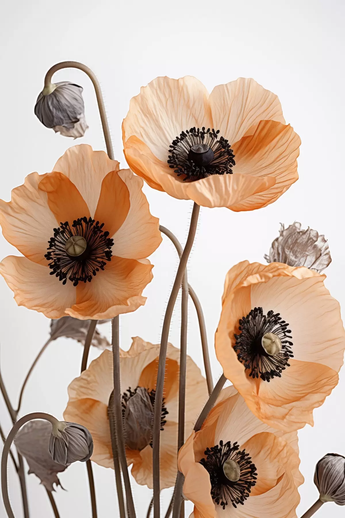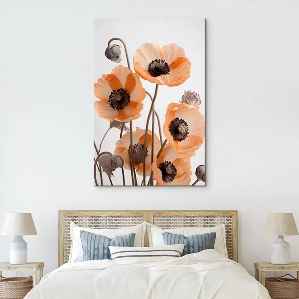 murales Amapolas naranjas, flores secas sobre fondo claro, iluminación suave, pétalos delicados, arreglo floral s45167