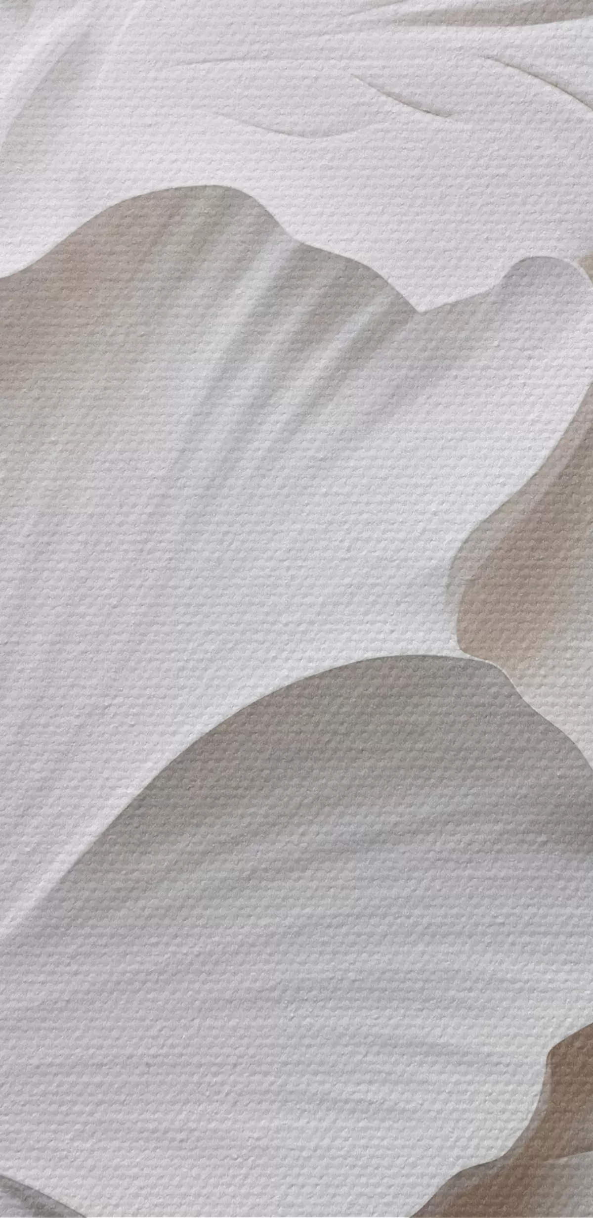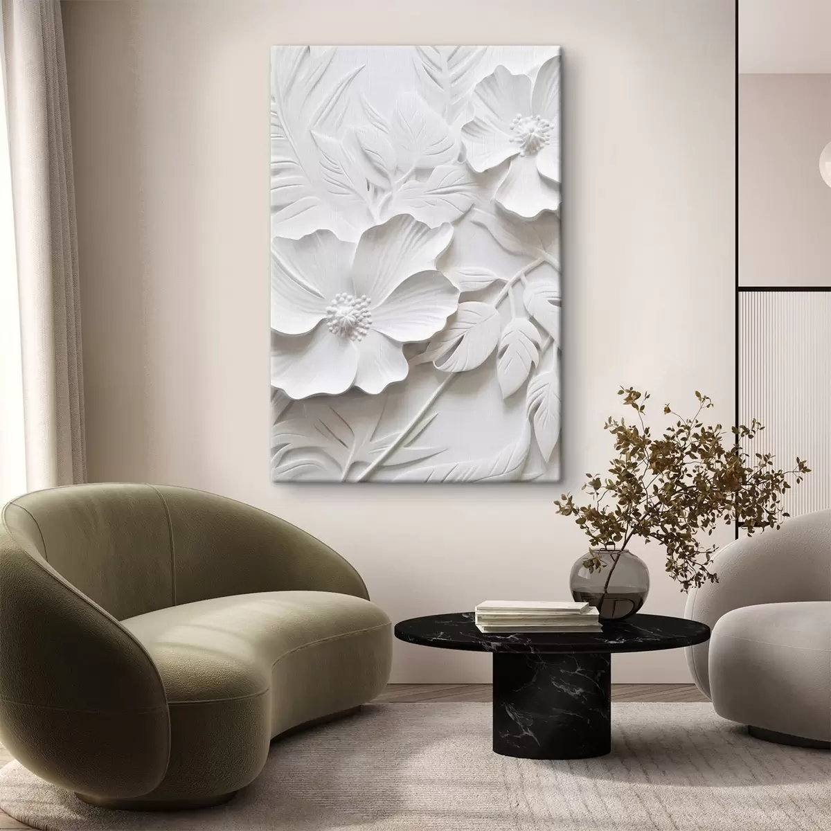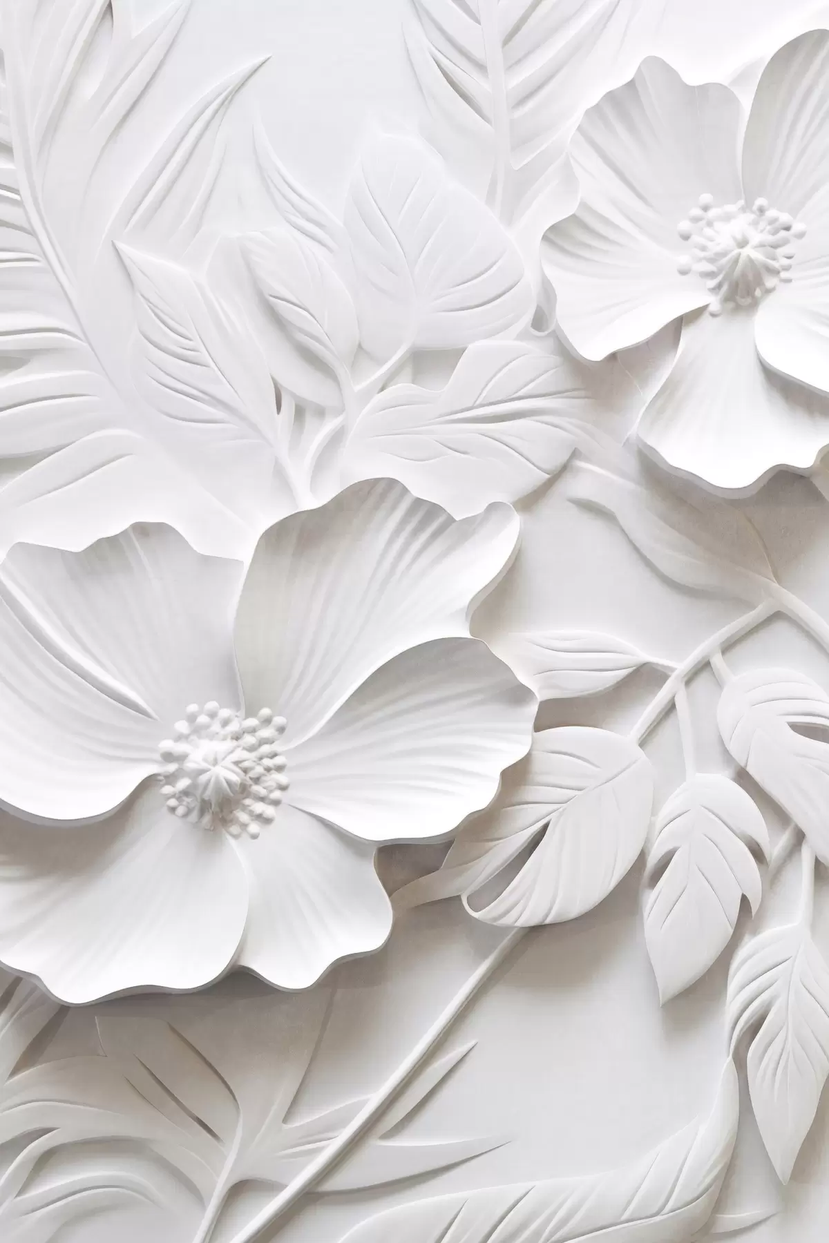 murales Flores blancas minimalistas decorativas con hojas, imitación relieve, fondo blanco s45180