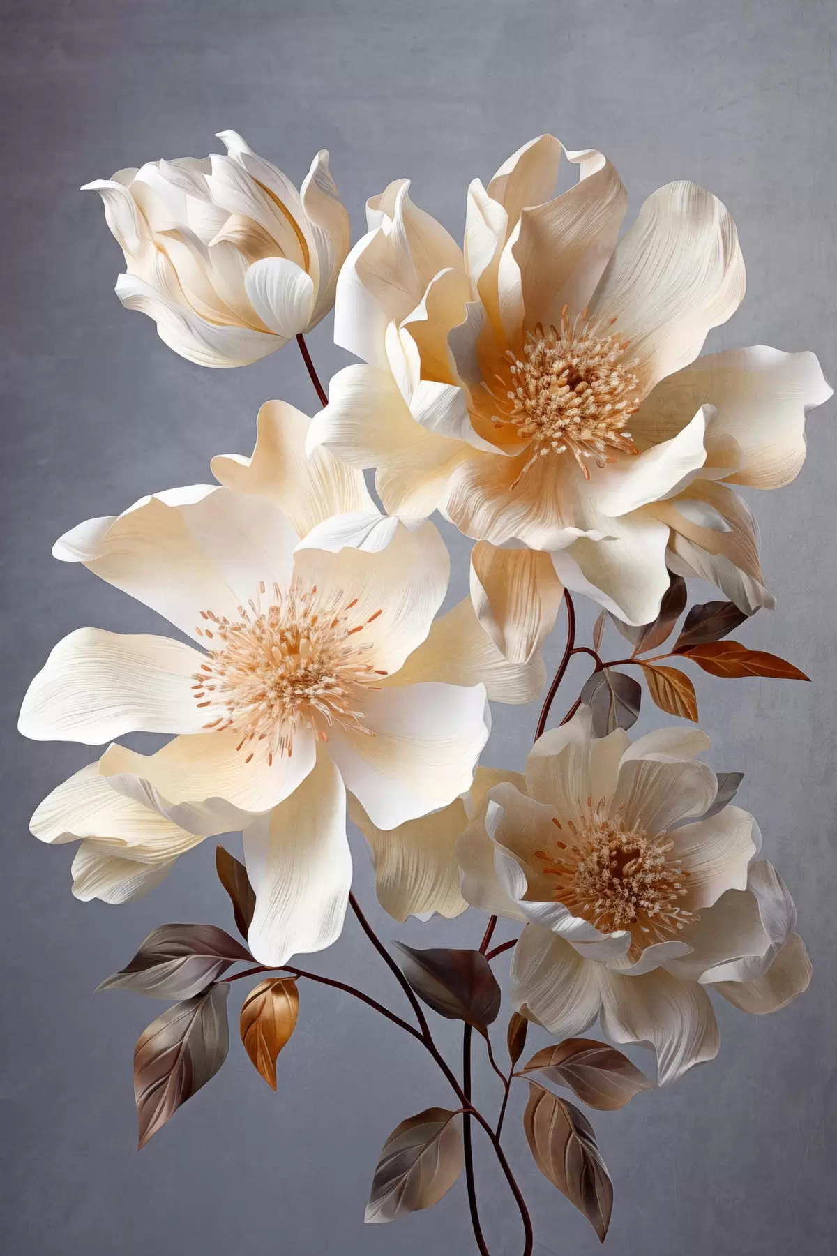 murales Flores texturizadas con pistilos naranjas y hojas naranjas sobre fondo gris, luz suave, elegante, detallado, realista s45181
