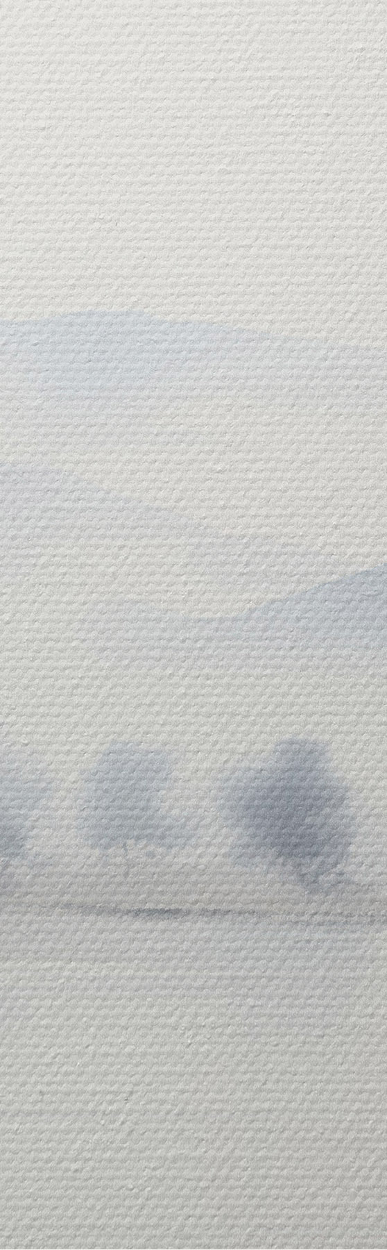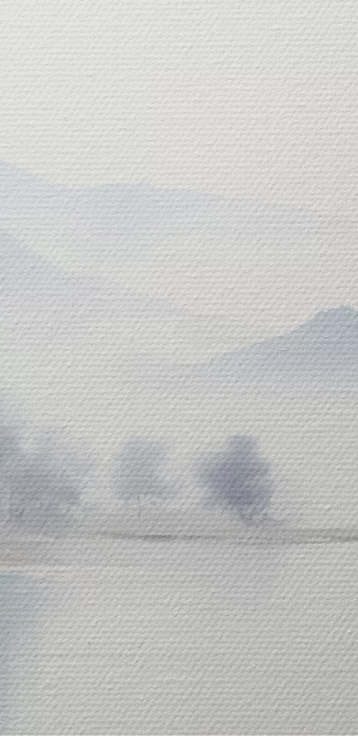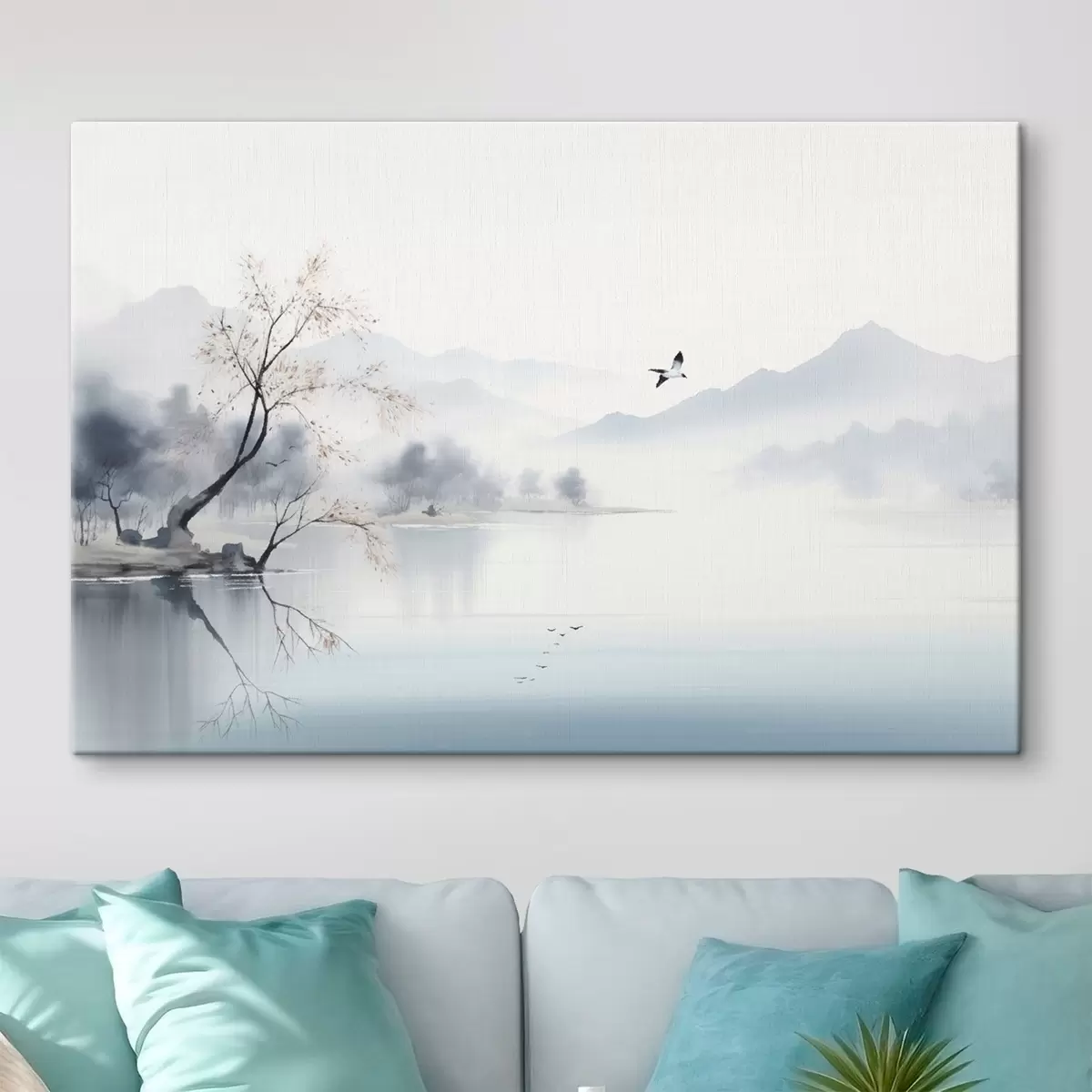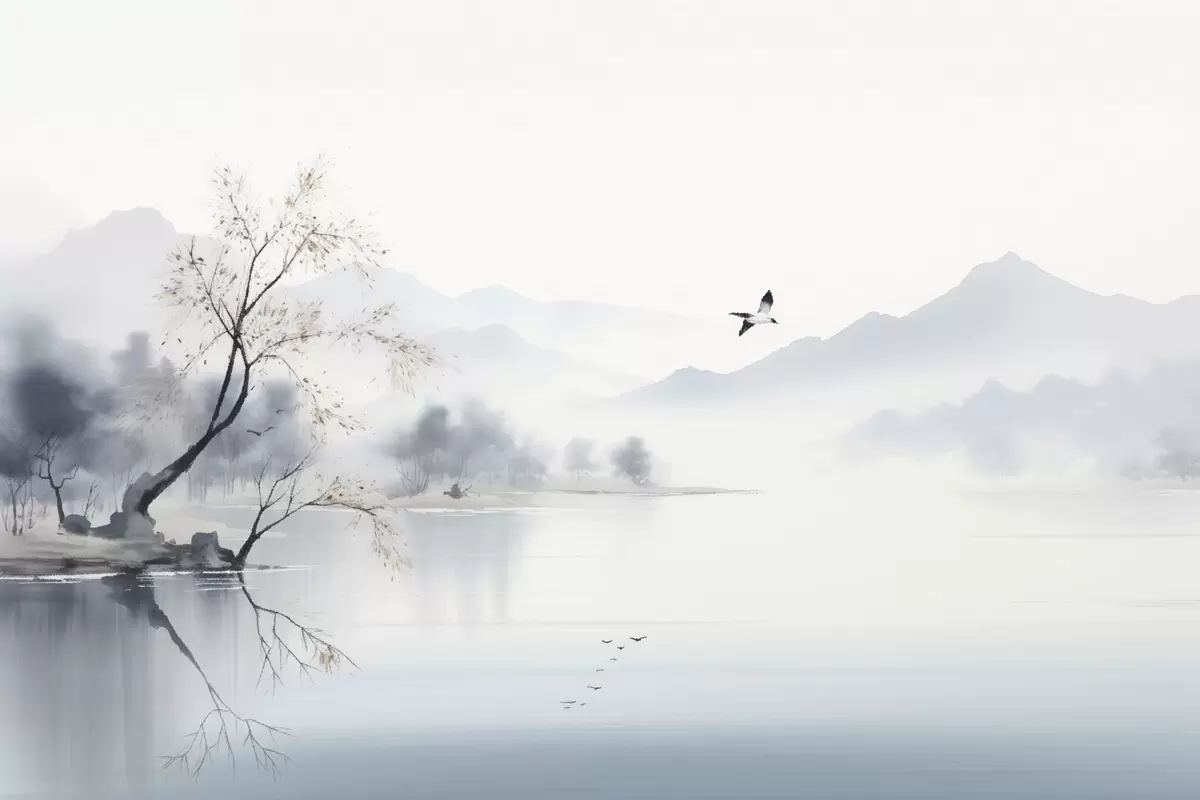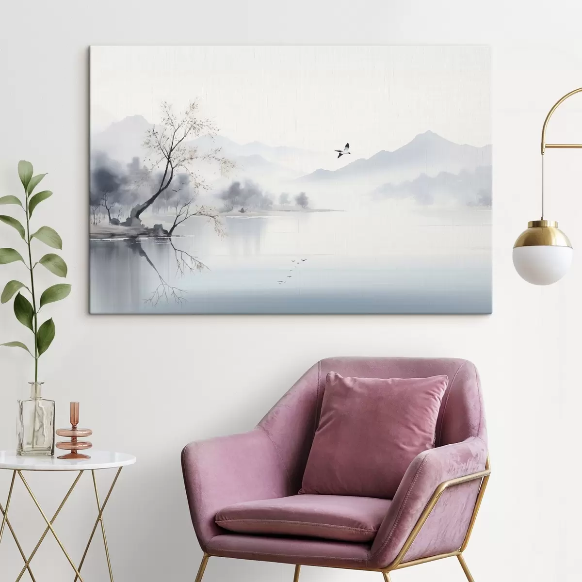 murales Paisaje brumoso con un árbol, montañas y pájaros s45518