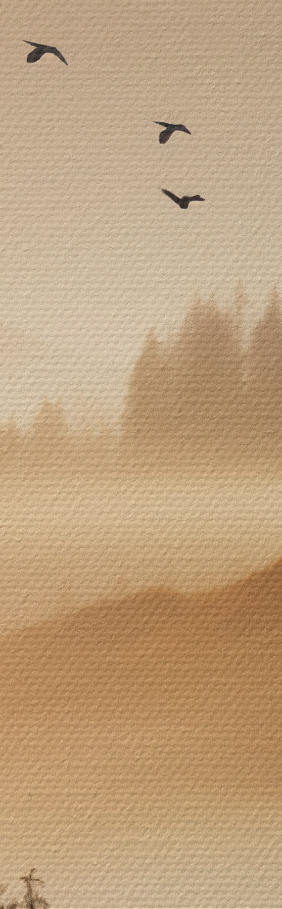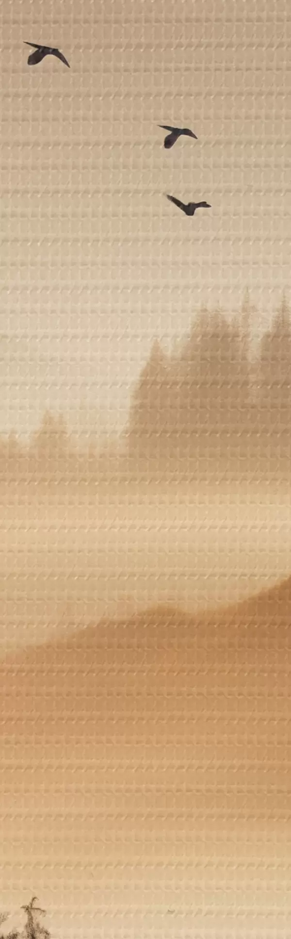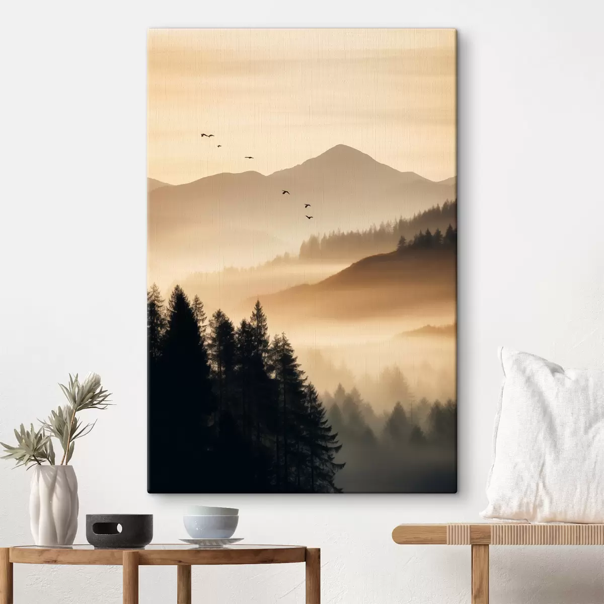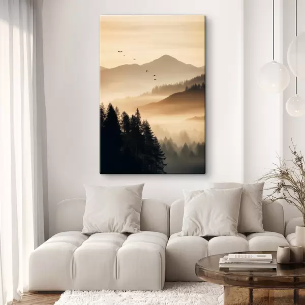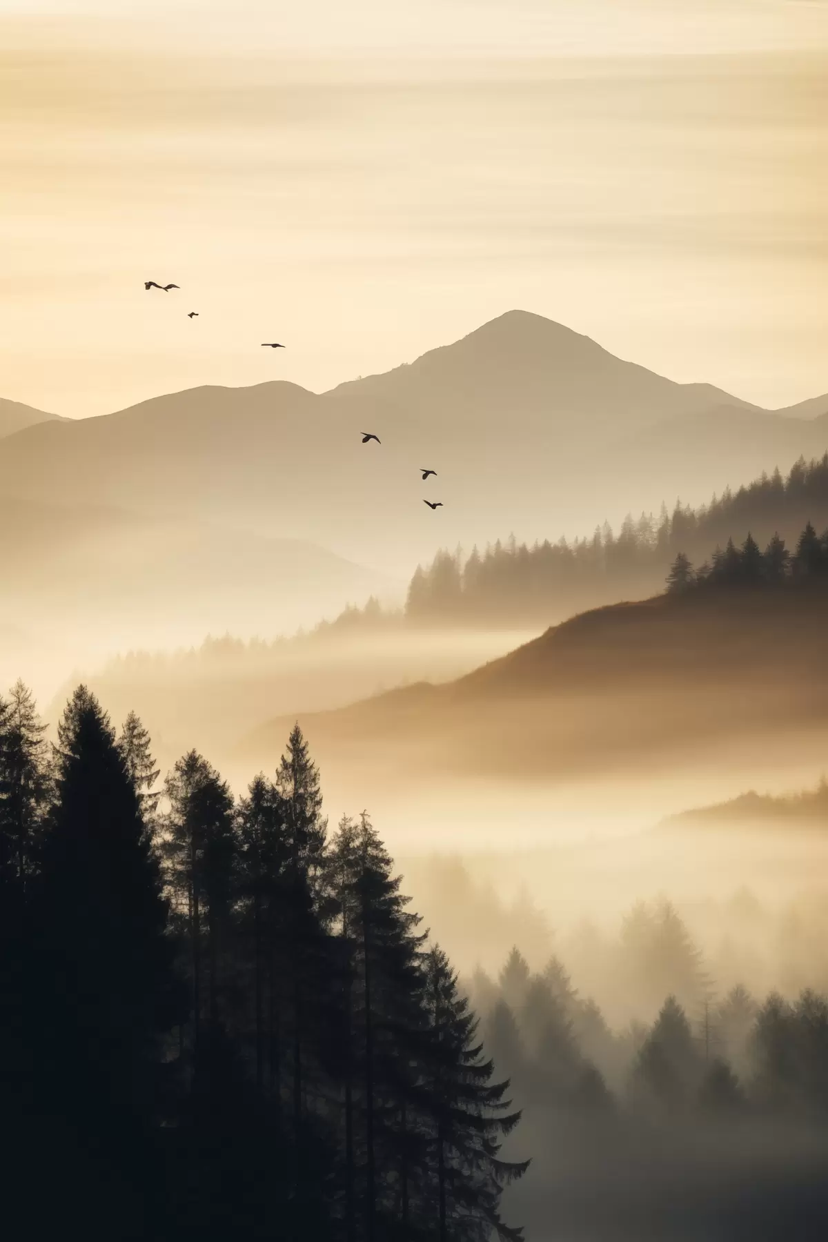 murales Un paisaje montañoso con un bosque y pájaros volando en el cielo , todo cubierto por una espesa capa de niebla durante el amanecer s45563