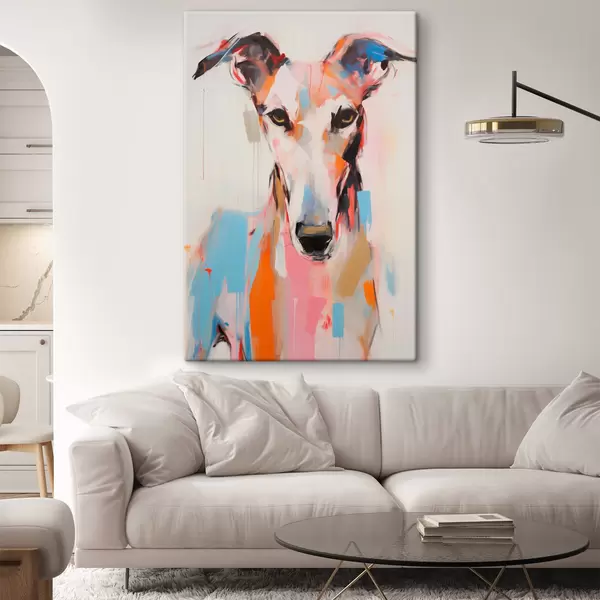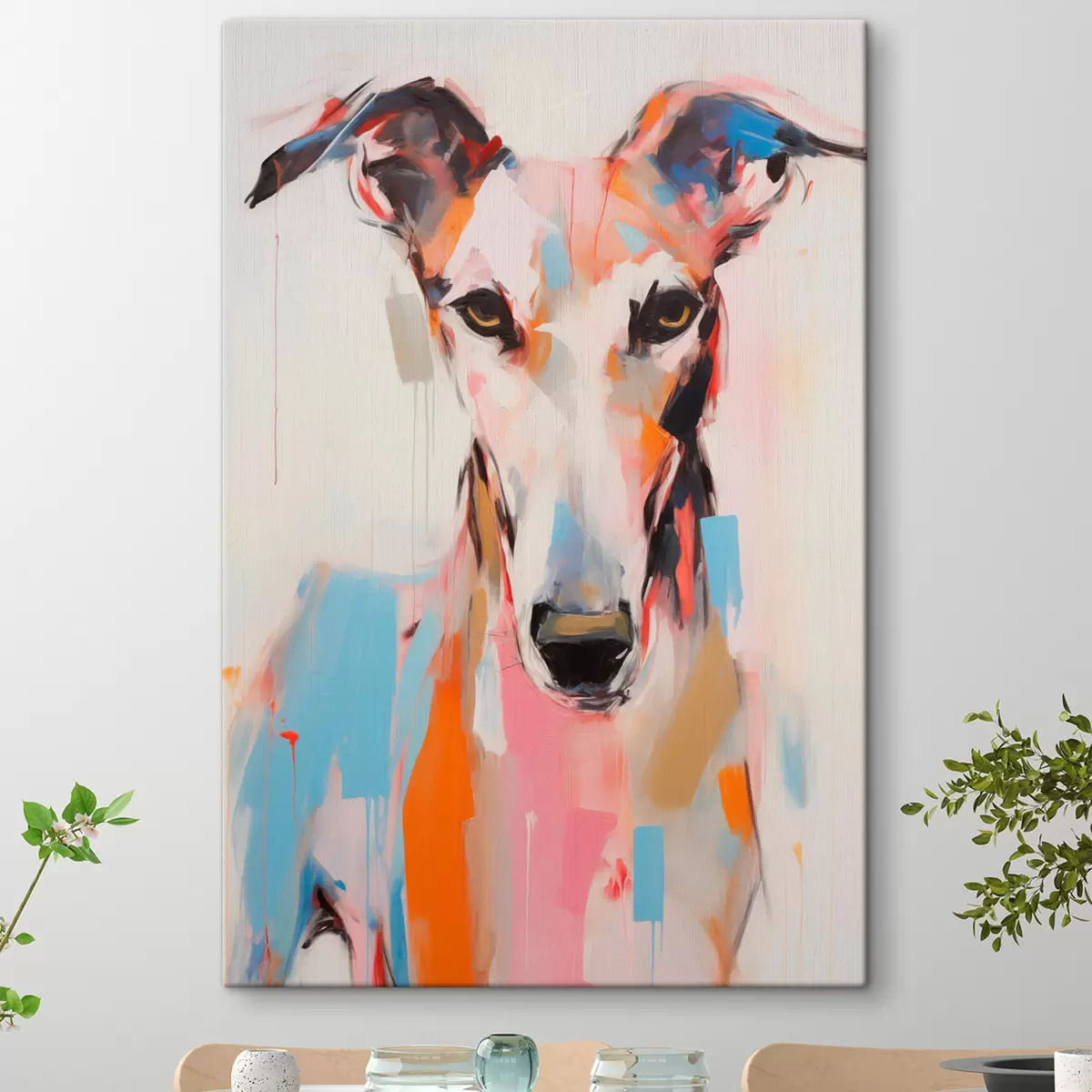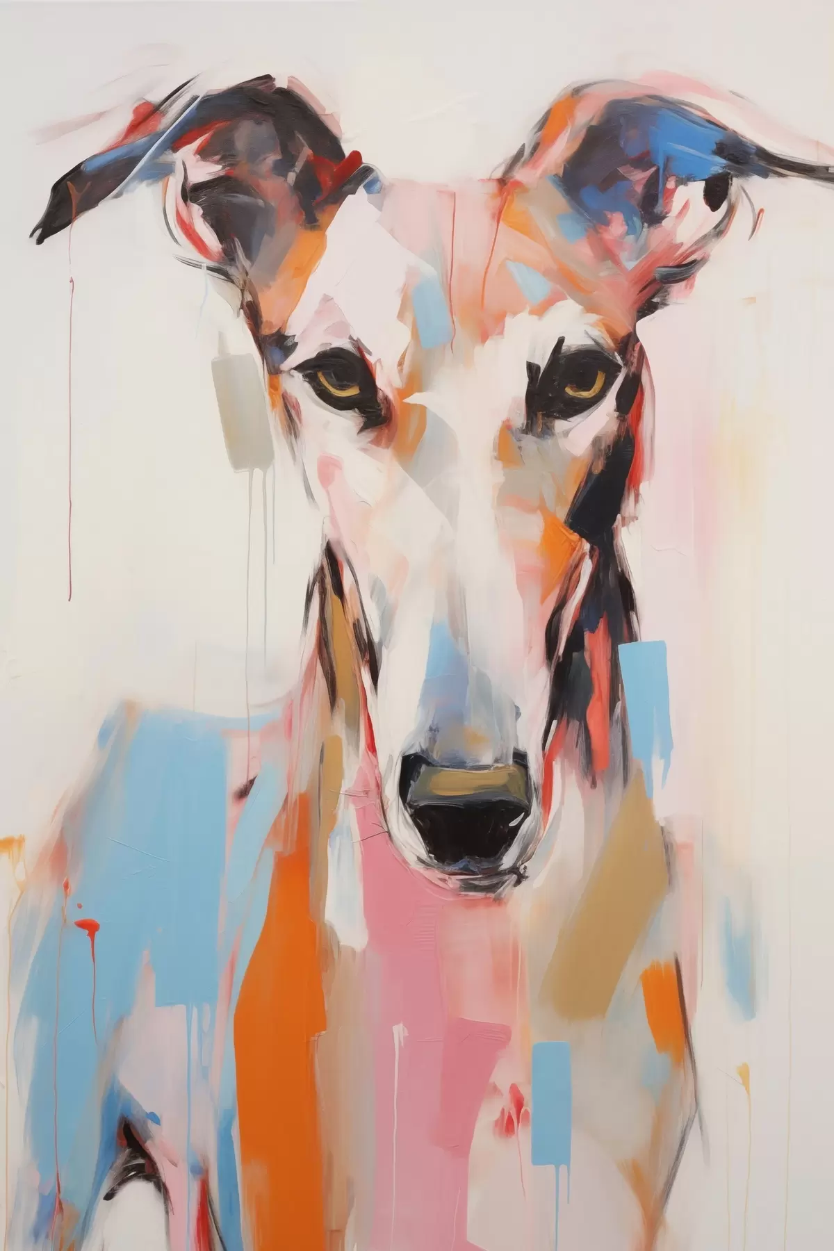 murales Un perro galgo, pintado con colores vibrantes como el naranja, el rosa y el azul, sobre un fondo blanco liso s45565