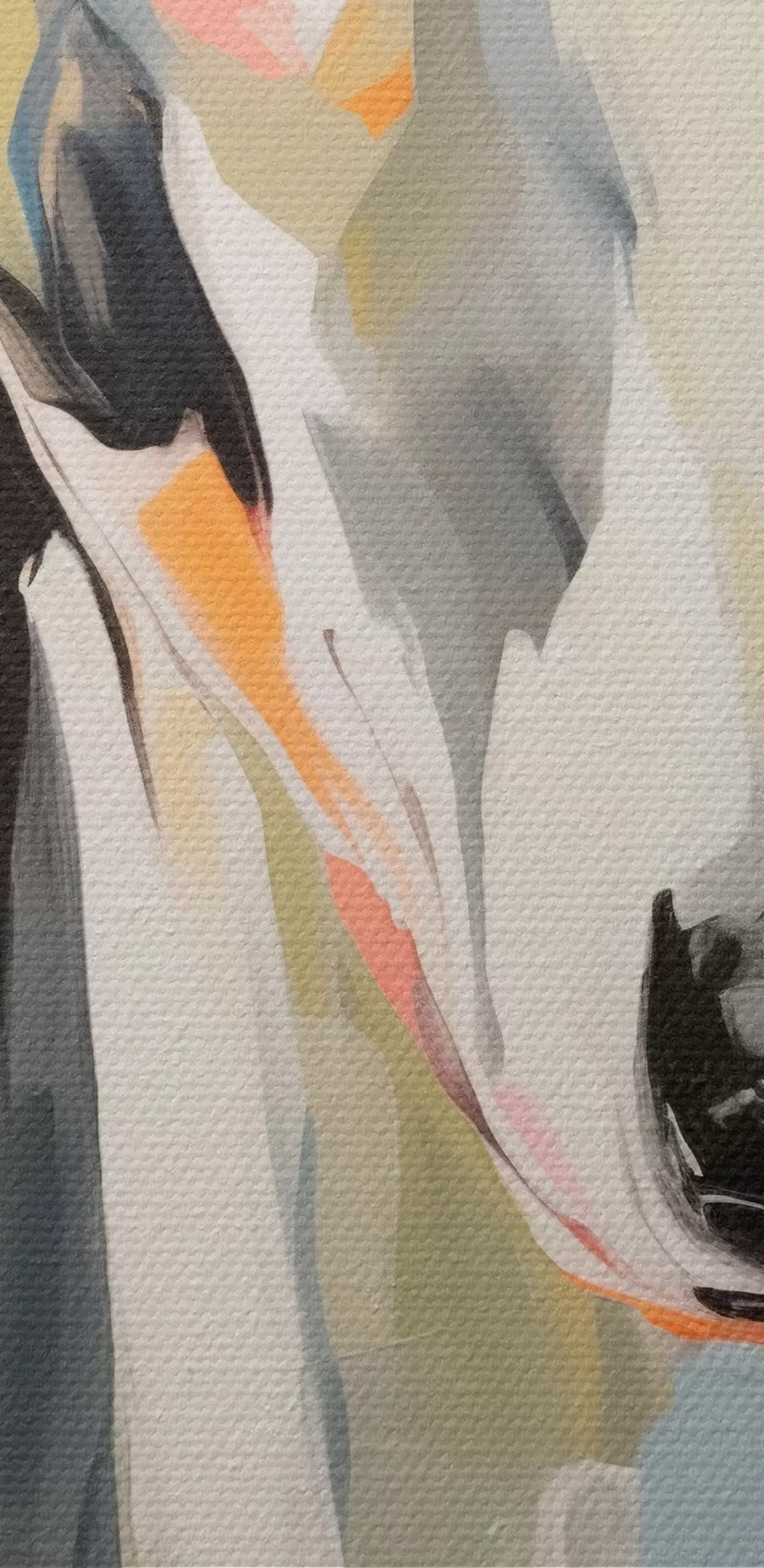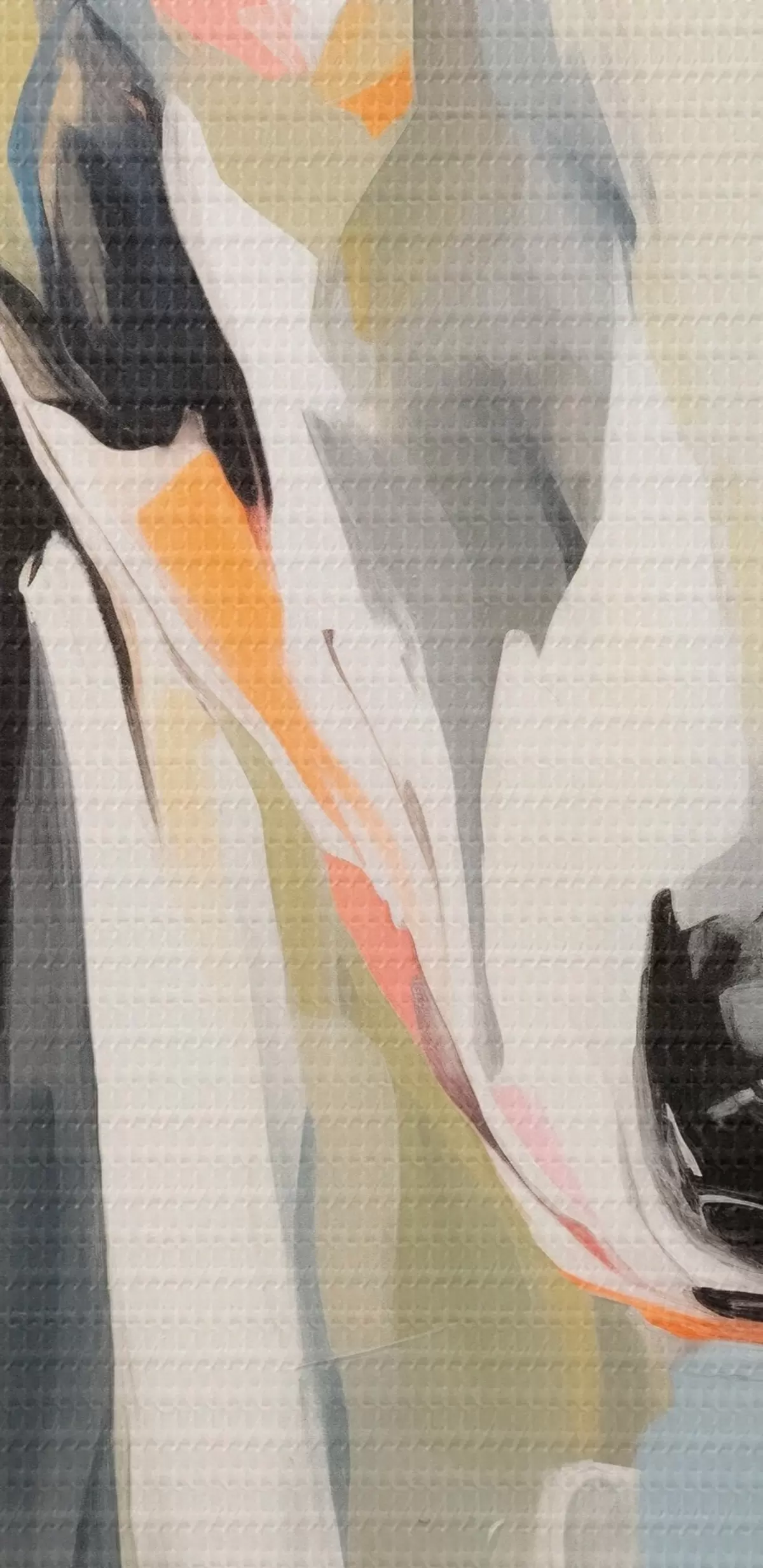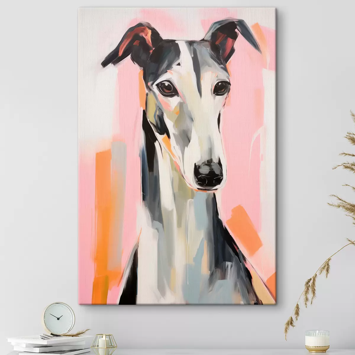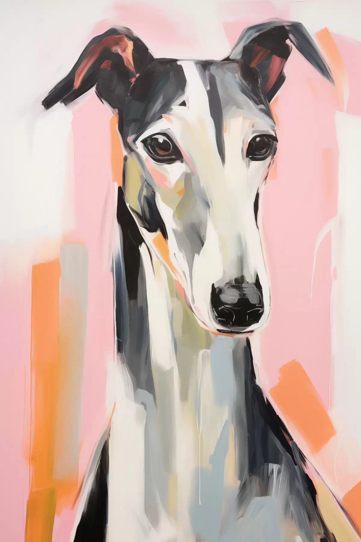 murales Un galgo sobre un fondo de pinceladas rosas, naranjas y blancas s45566