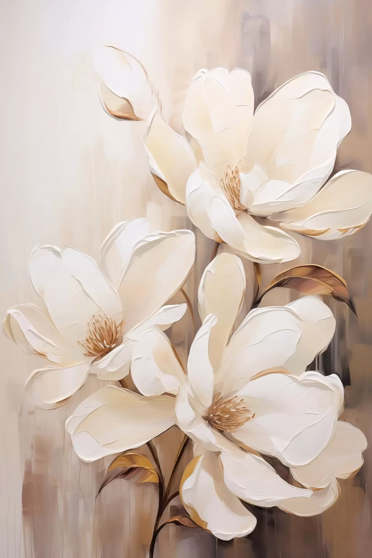 murales Flores blancas de magnolia sobre un fondo suave y difuminado de tonos beige y marrones, elegante composición floral s45571
