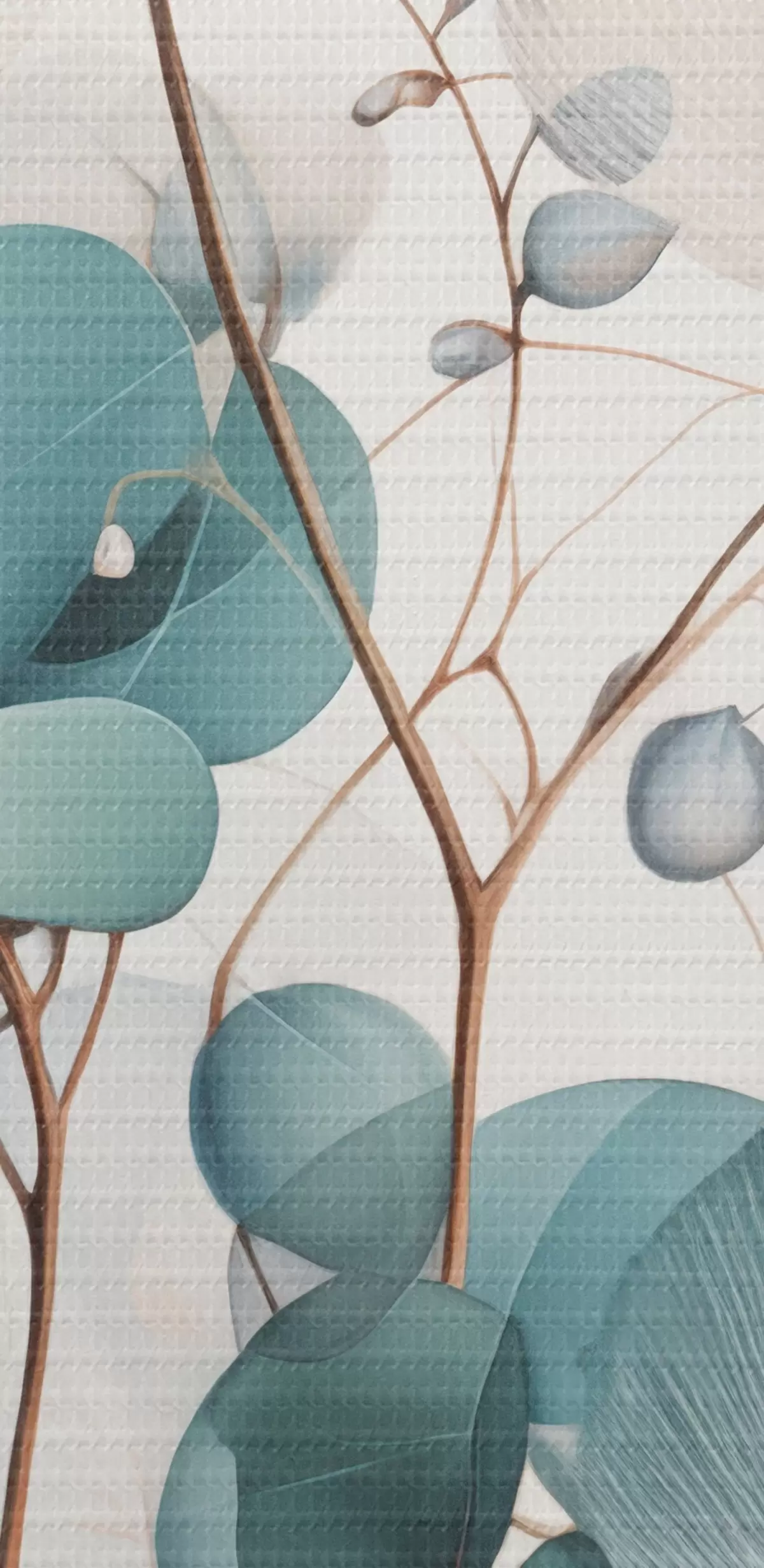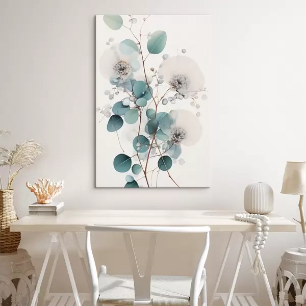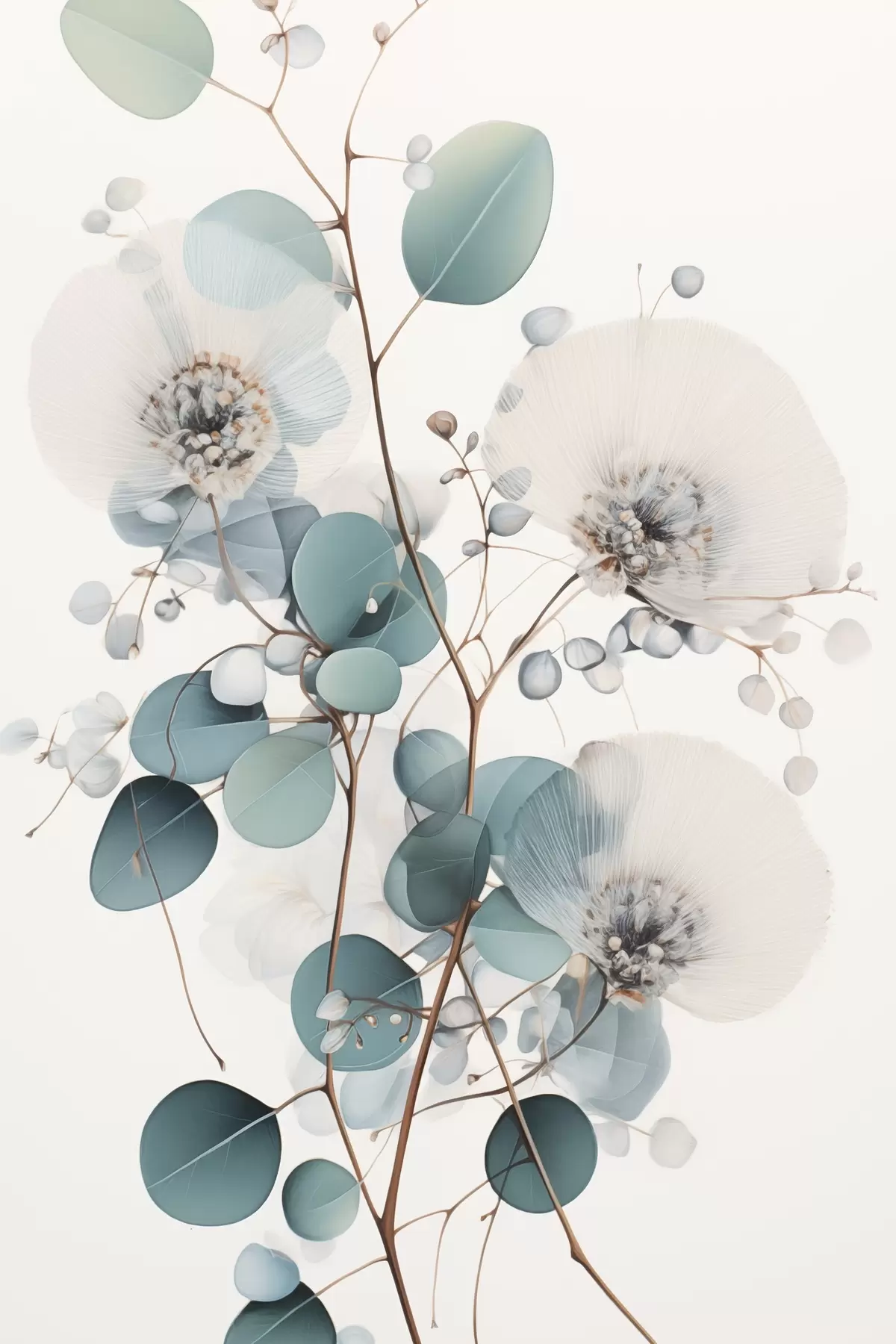 murales Flores abstractas de eucalipto con pétalos blancos y hojas verdes apagadas en las ramas s45946