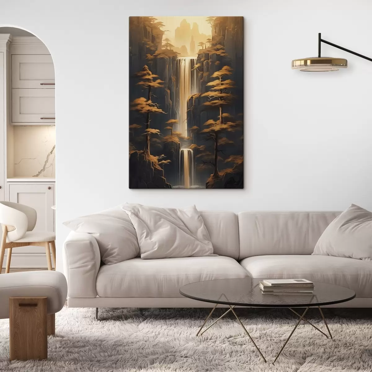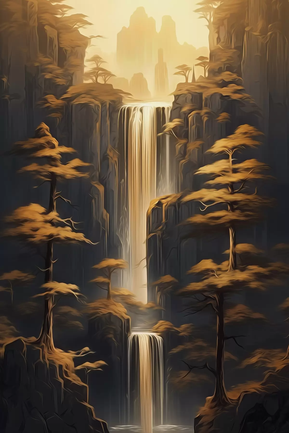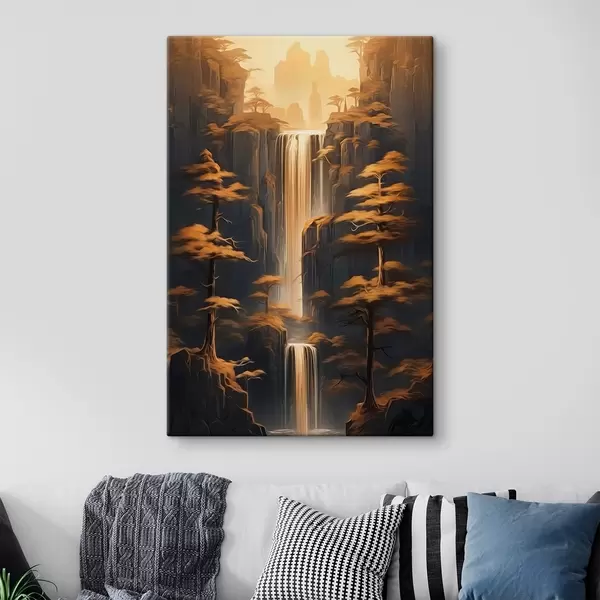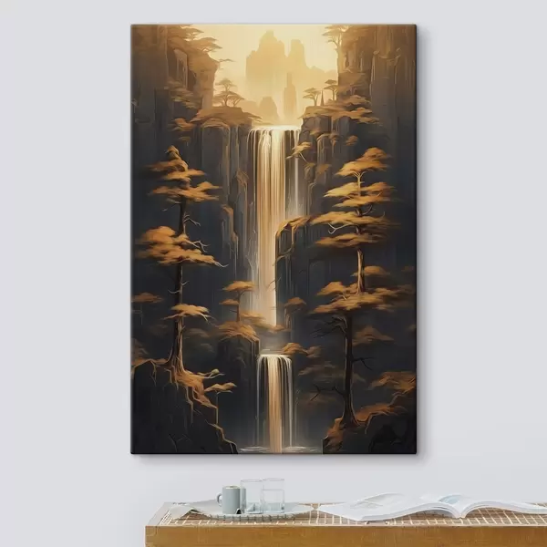 murales Altos acantilados con una cascada y pinos a la luz del atardecer s46151