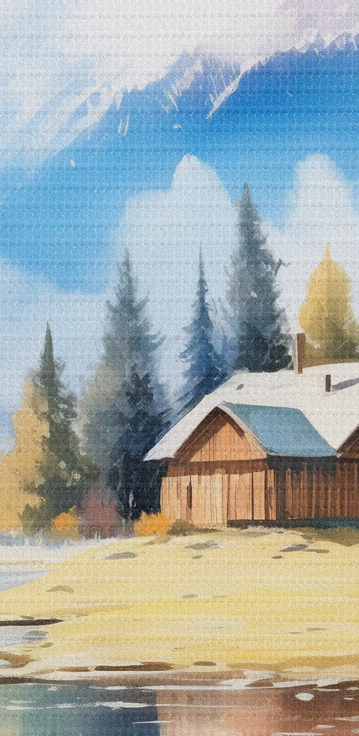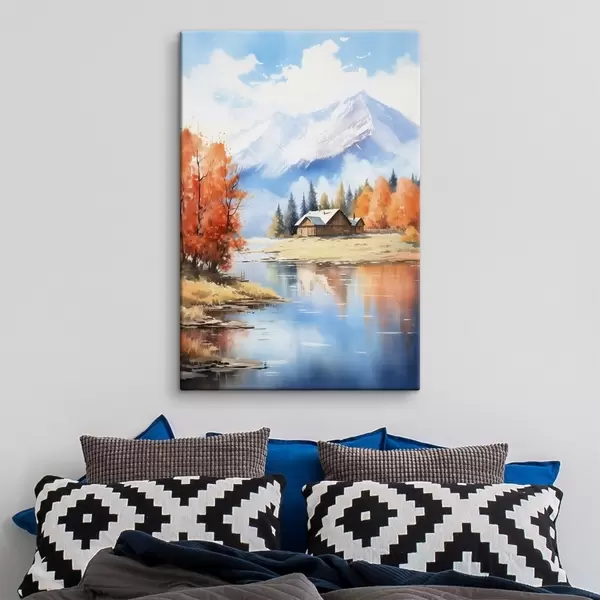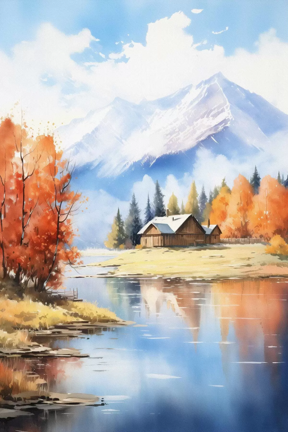 murales Paisaje otoñal junto al lago con una casa y montañas s46184