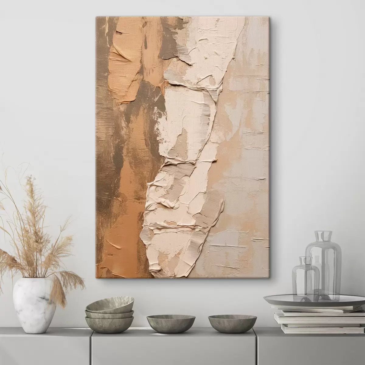 murales Pintura abstracta con pinceladas gruesas, tonos beige y marrones, superficie texturizada, paleta de colores neutros s46272